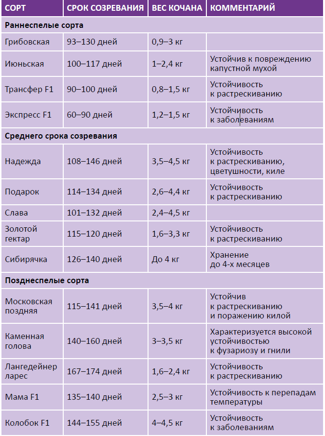 Таблица. Сорта белокочанной капусты по срокам созревания.