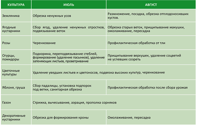 Основные работы, связанные с конкретными культурами в июле-августе, для удобства, прописаны в таблице к данной статье.