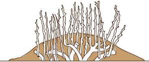 При этом способе все ветки материнского растения обрезаются на высоту 5 см и присыпаются грунтом на 15 см. В процессе отрастания побегов, кусты несколько раз окучивают. В начале осени, получившиеся саженцы отделяются от материнских корней и рассаживаются. На зиму присыпанные кусты не оставляют.