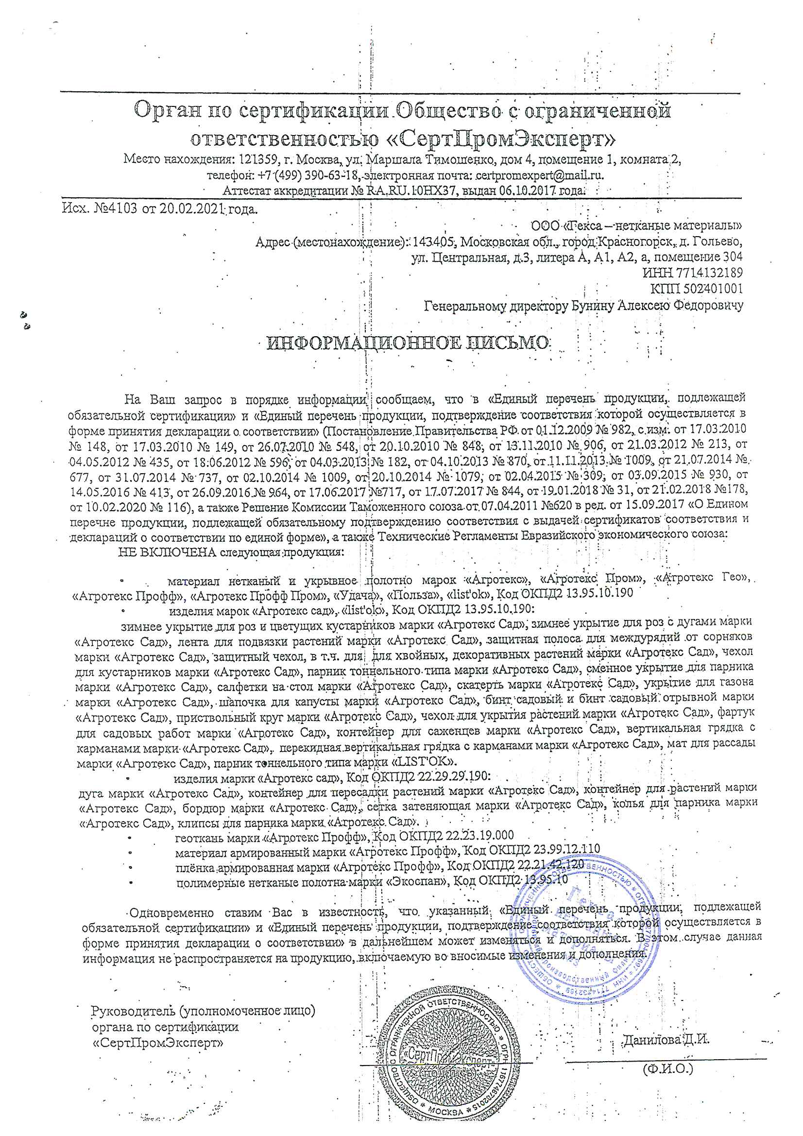 Сертификация-Информационное письмо №4103 от 20.02.21 выдано ОС продукции ООО "СертПромЭксперт"