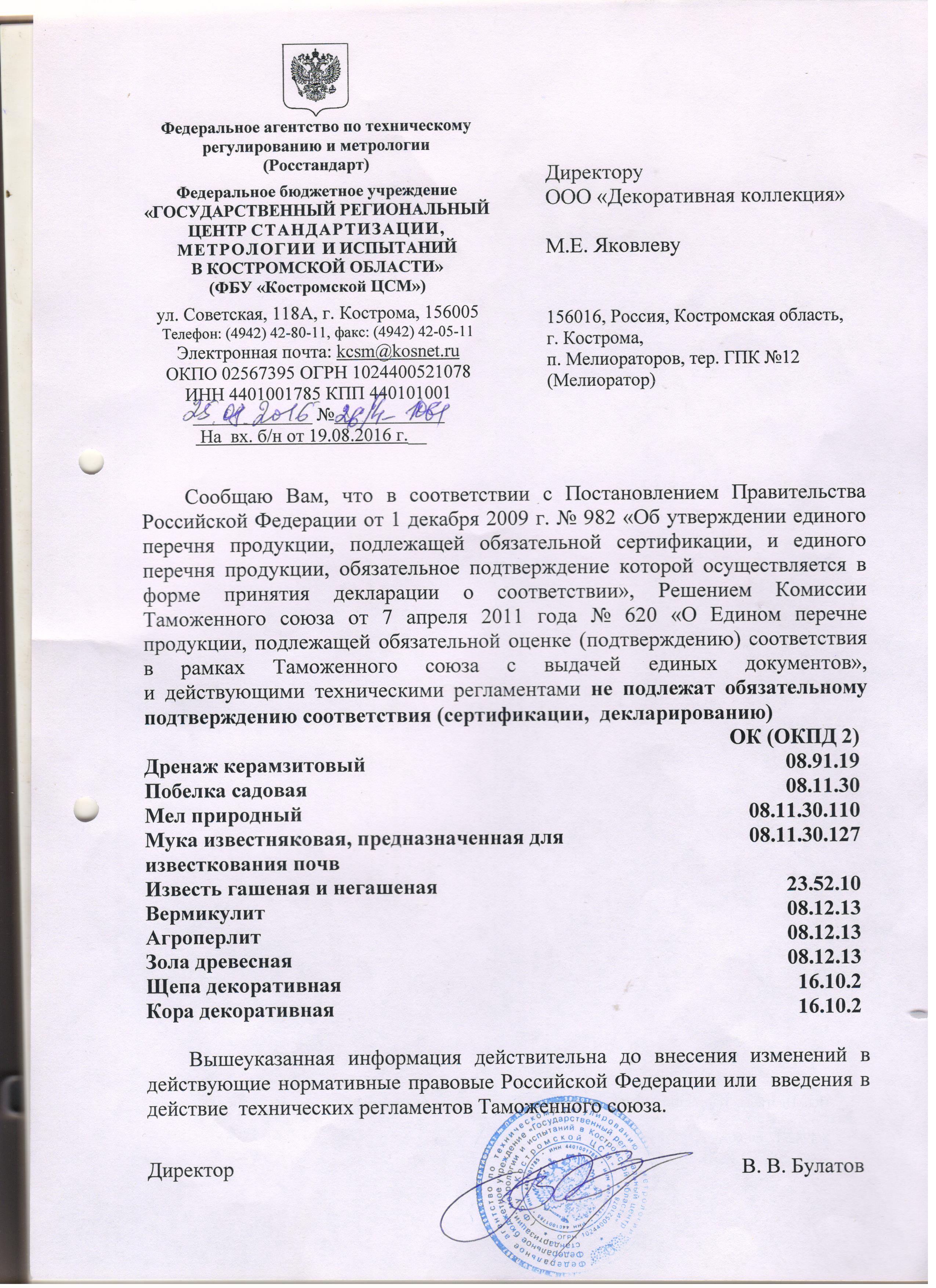 Сертификация-информационное письмо №26/4-1061 от 25.08.2016 выдано ОС продукции ФБУ "Костромской ЦСМ"