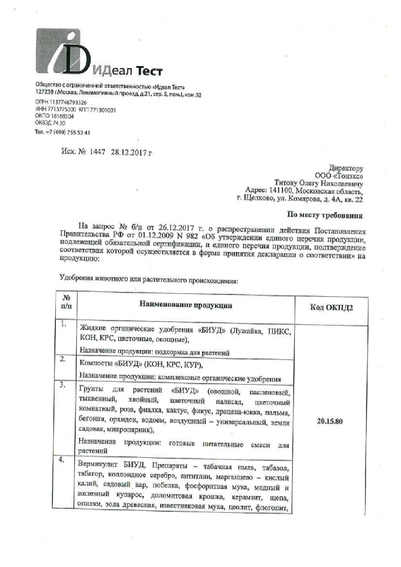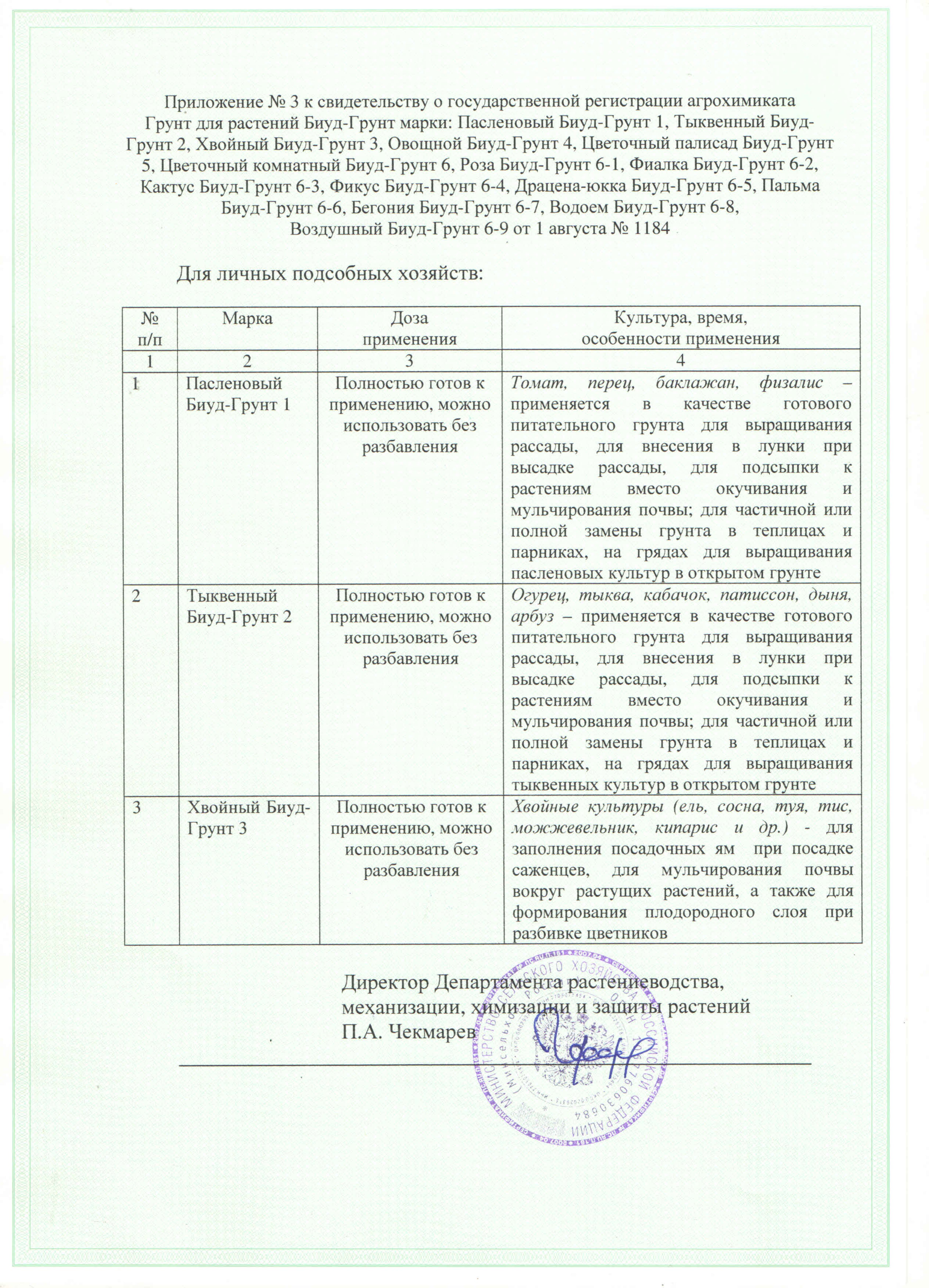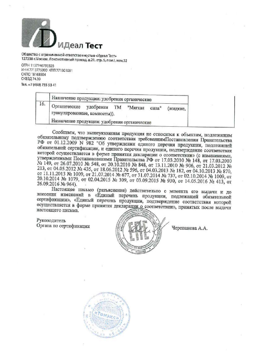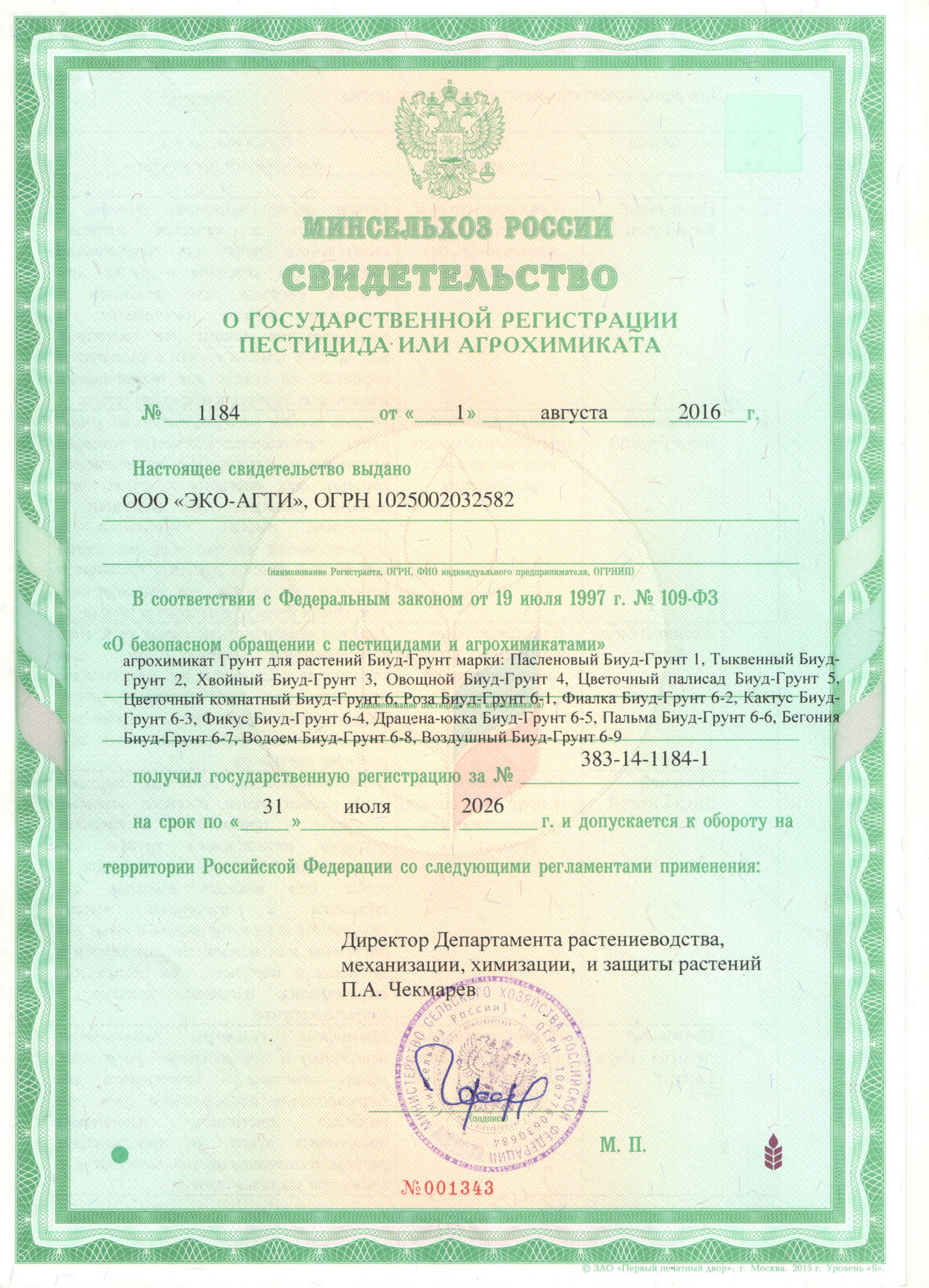 Государственная регистрация №383-14-1184-1 от 01.08.16 до 31.07.26 выдана МСХ РФ, Сертификация-информационное письмо №1447 от 28.12.17 выдано ОТ продукции ООО "Идеал Тест"