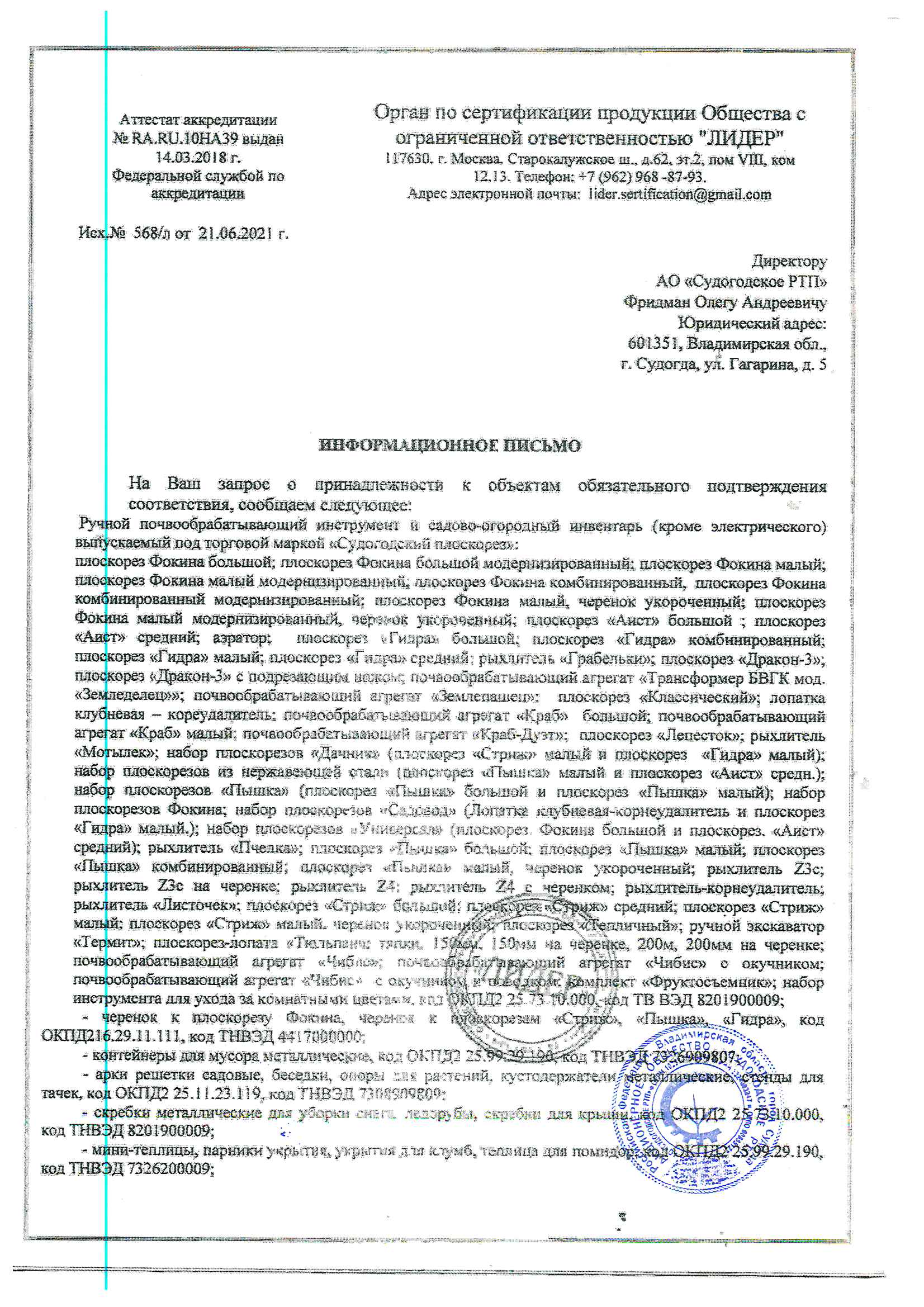 Сертификация-информационное письмо №568/л от 21.06.21 выдано ОС продукции ООО "Лидер"