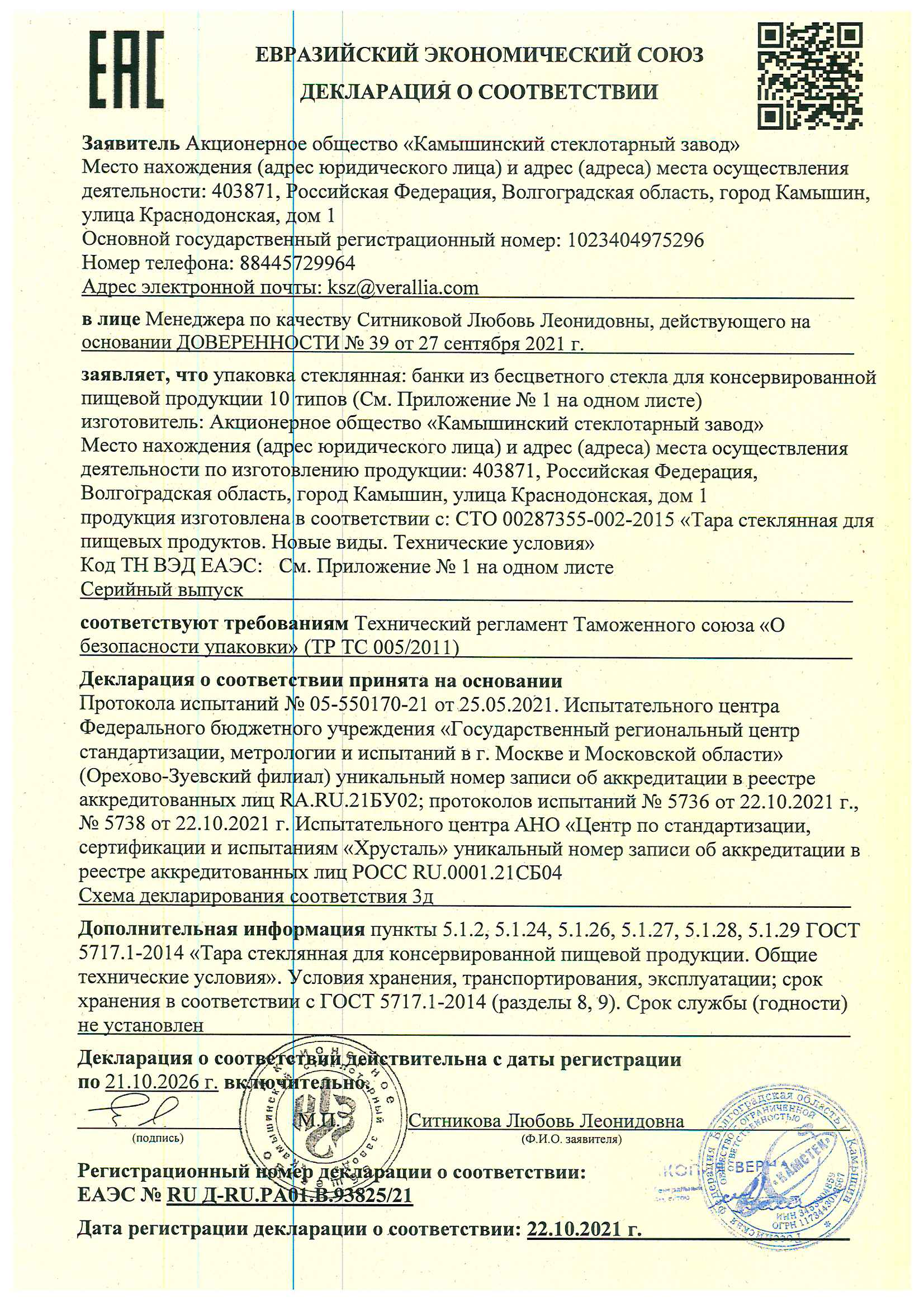Сертификация-декларация ЕАЭС №RU Д-RU.РА02.В.07429/21 от 27.10.21 до 26.10.26 выдана: заявитель-ЗАО "Камышинский стеклотарный з-д"