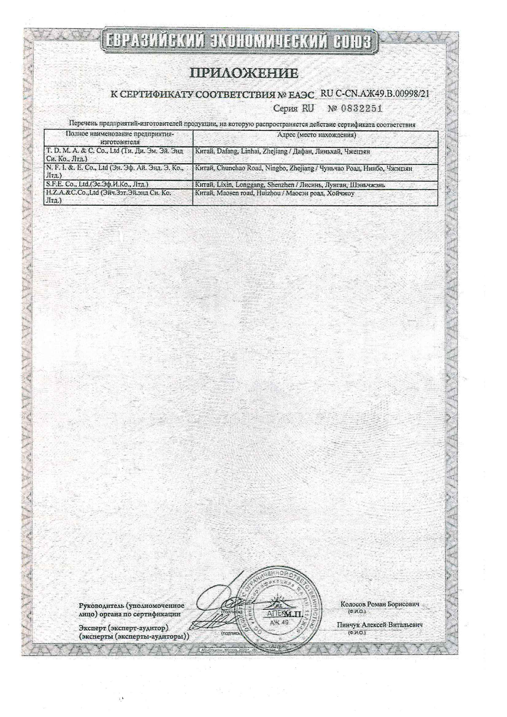 Сертификат-№ЕАЭС RU C-CN.АЖ49.В.00998/21 от 28.06.2021 до 27.06.2023 выдана ОС продукции ООО "Апекс"