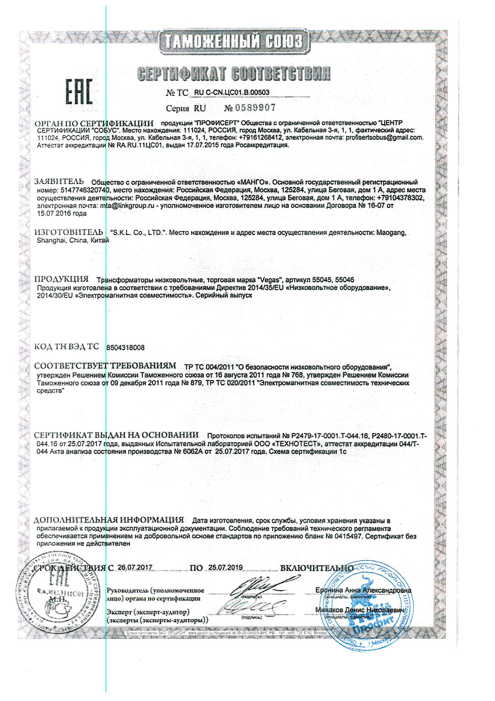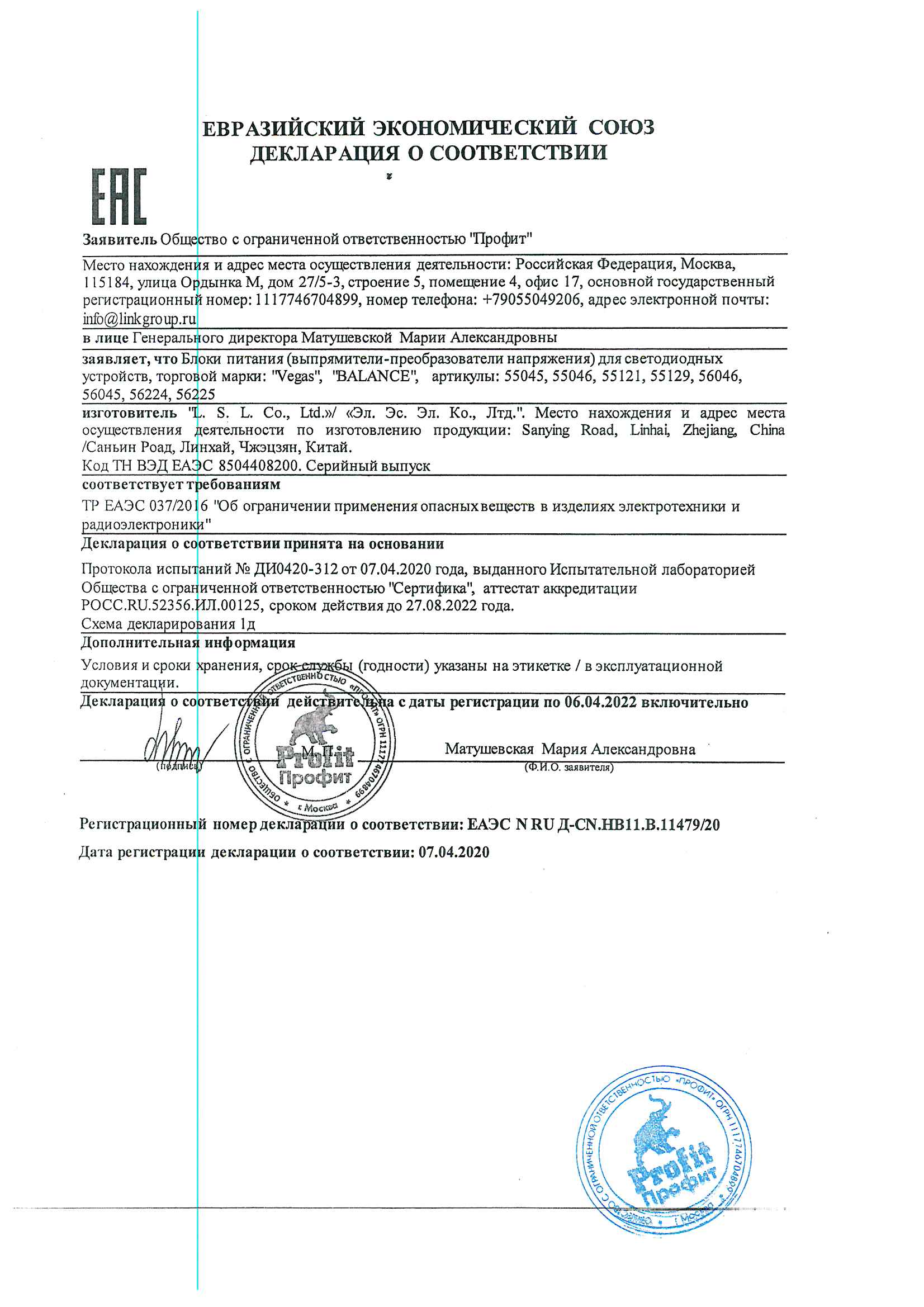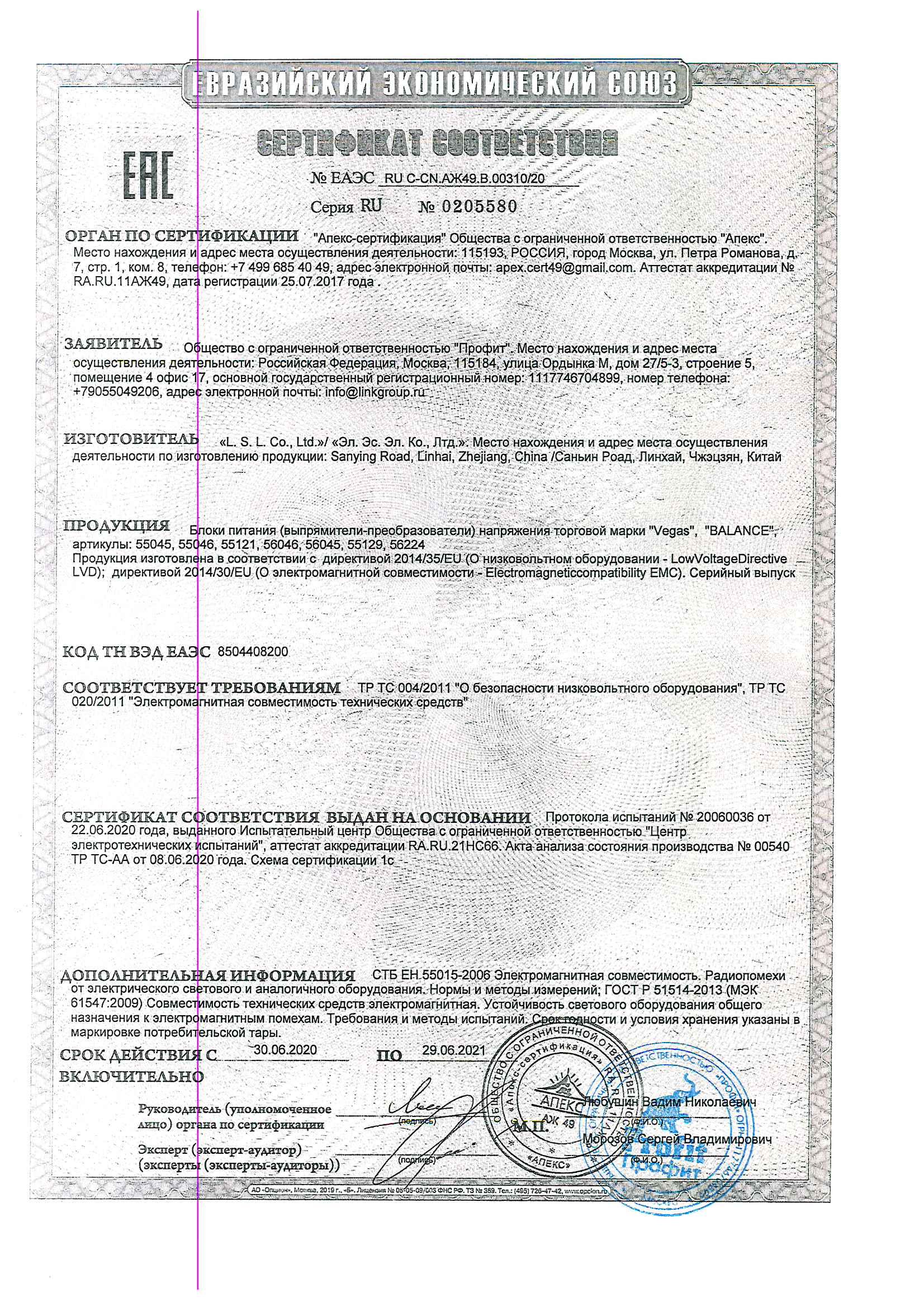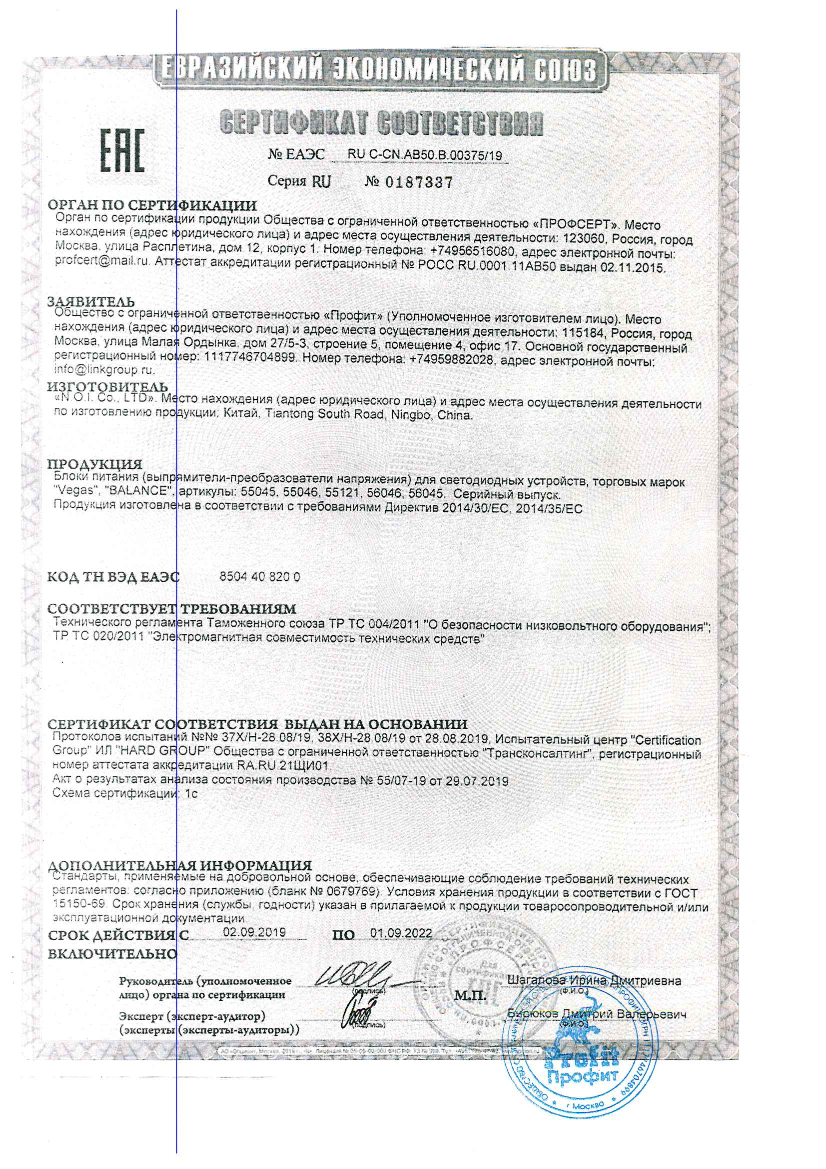 Сертификация-Информационное письмо №0255 от 12.08.2020 выдано "Апекс-сертификация" ООО "Апекс", г.Москва, Декларация-№ЕАЭС N RU Д-CN.НВ11.В.11479/20 от 07.04.2020 до 27.08.2022 выдана ООО "Профит" г.Москва, Сертификат №ЕАЭС RU C-CN.АВ50.В.00375/19 от 02.09.2019 до 01.09.2022 выдан ООО "ПРОФСЕРТ" г.Москва