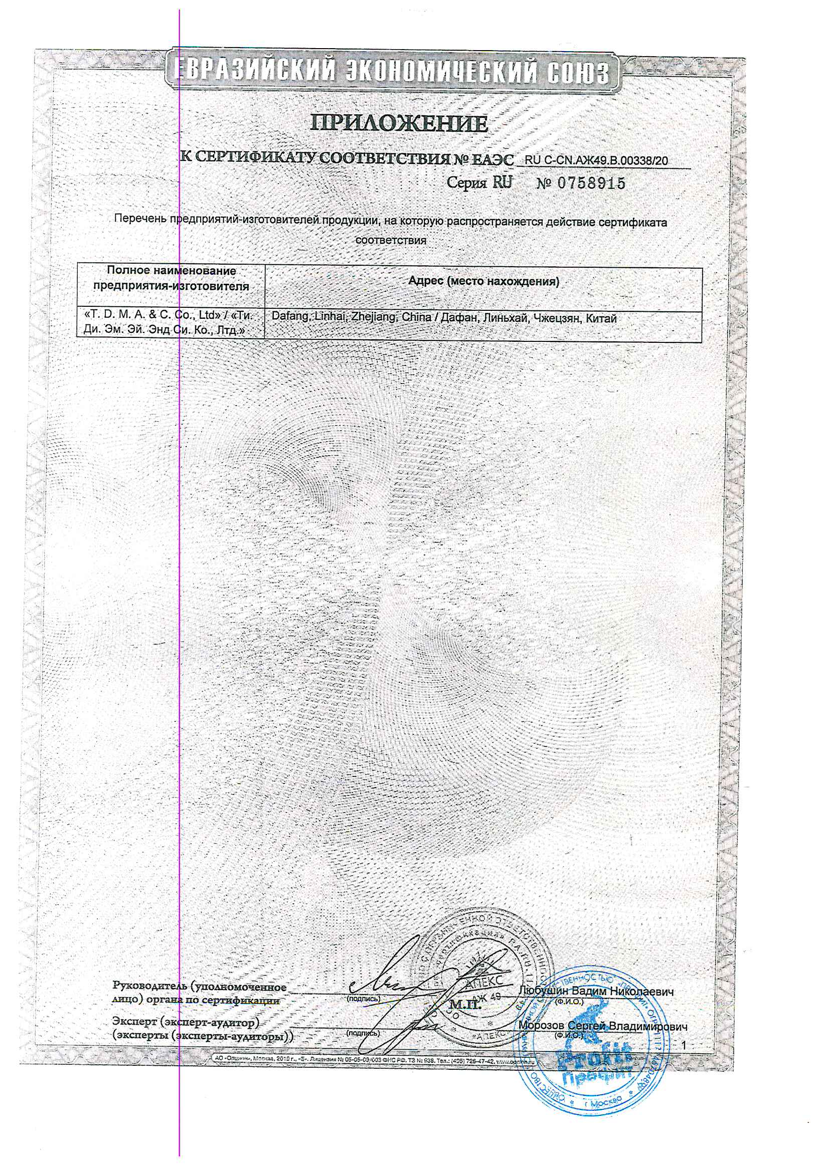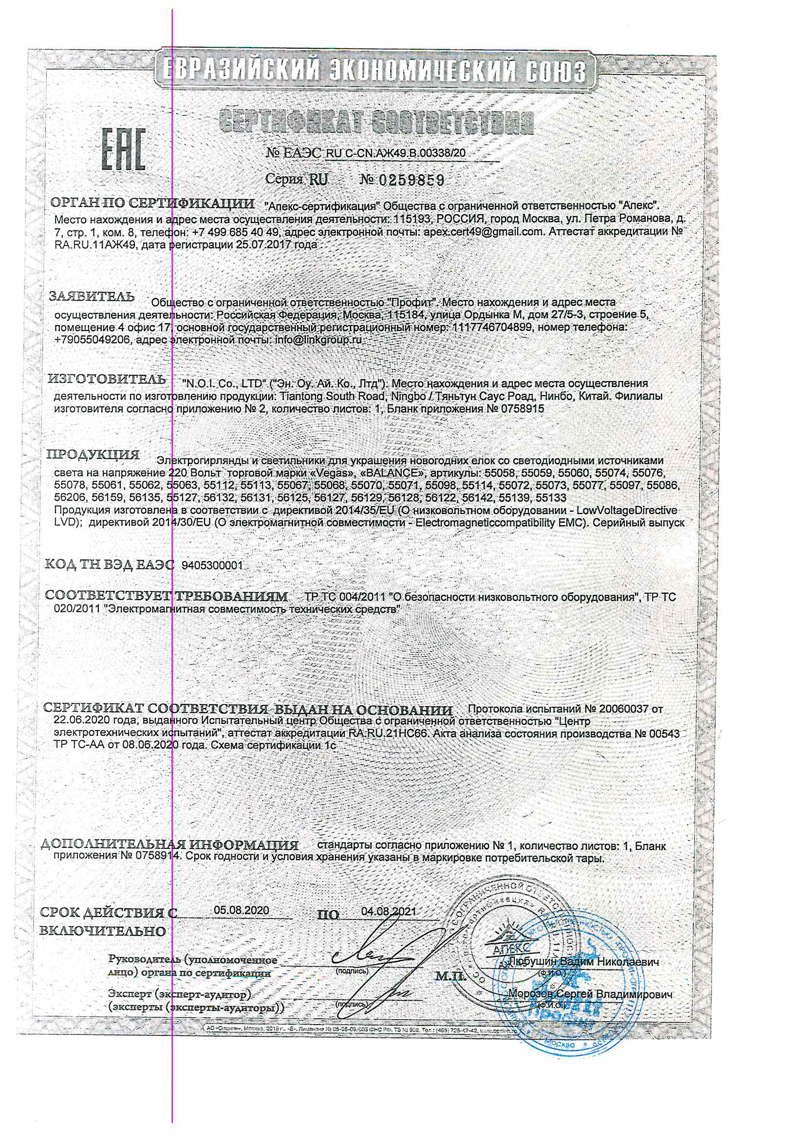 Сертификация-декларация №ЕАЭС N RU Д-CN.НВ11.В.15981/20 от 18.06.2020 до 27.08.2022 выдана ООО "ПРОФИТ" г.Москва, Сертификат №ЕАЭС RU C-CN.АЖ49.В.00338/20 от 05.08.2020 до 04.08.2021 выдан "Апекс-сертификация" ООО "Апекс", г.Москва
