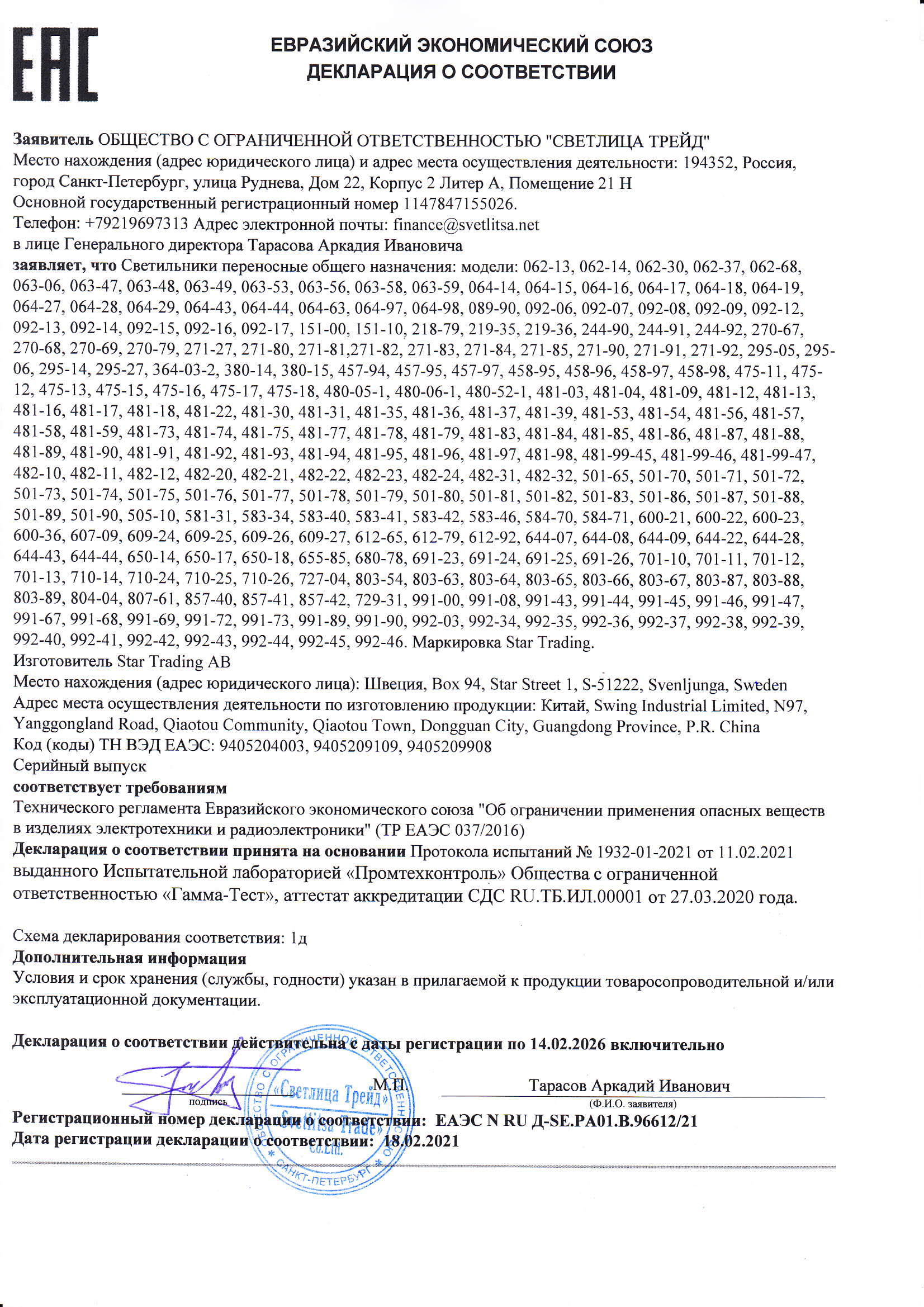 Сертификация-декларация №ЕАЭС N RU Д-SE.РА01.В.96612/21 от 18.02.21 до 14.02.26 выдана: заявитель ООО"Светлица Трейд"