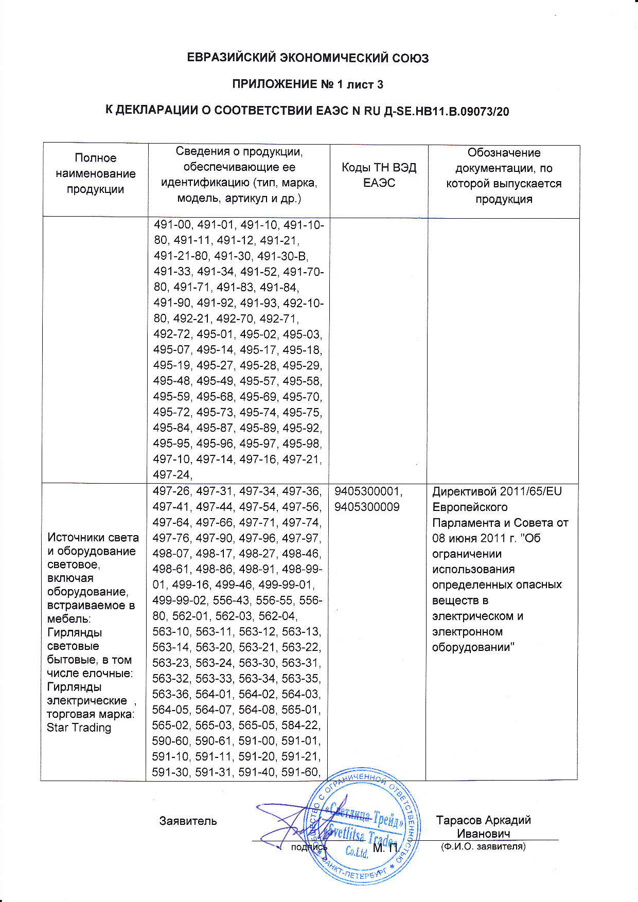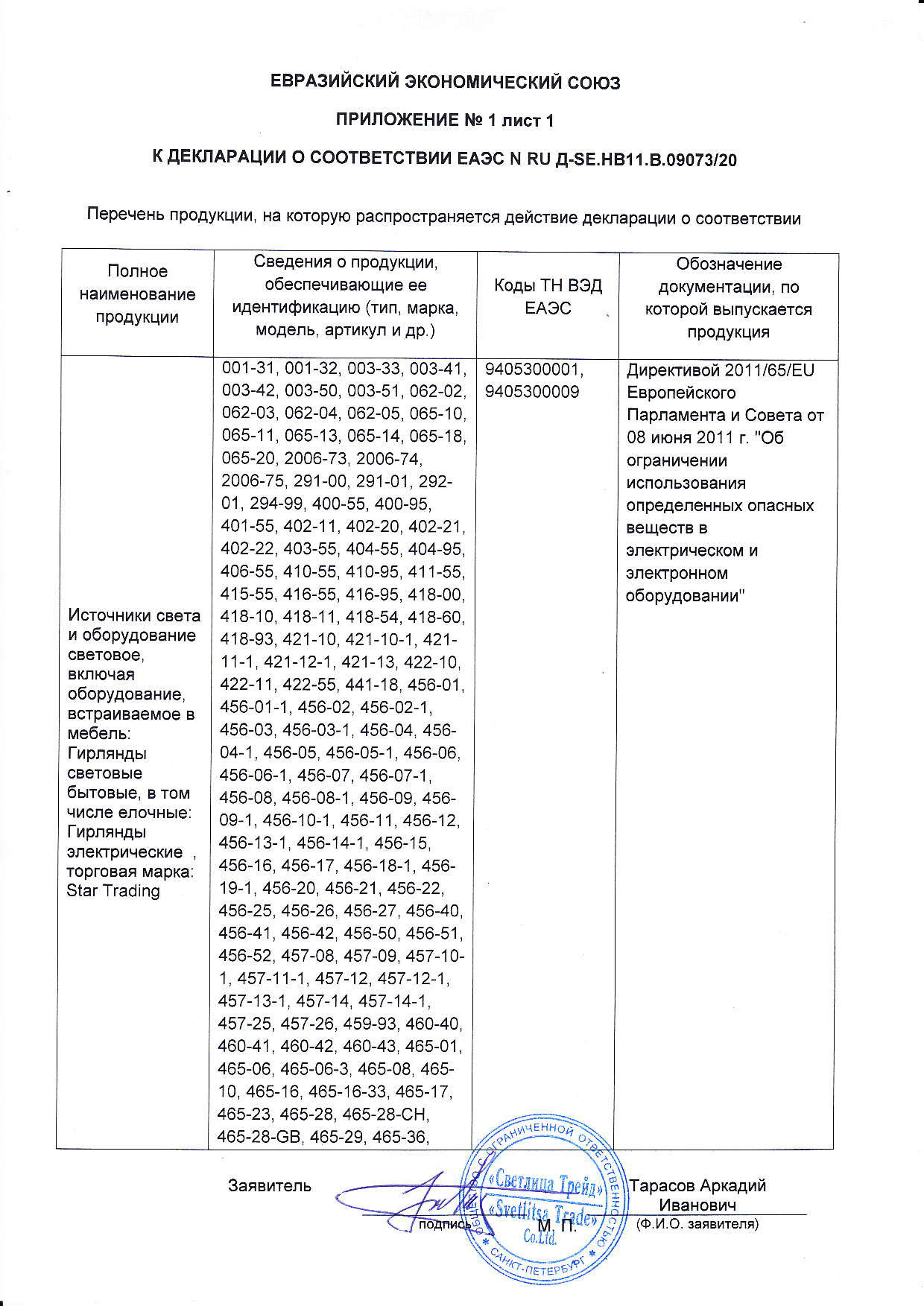 Сертификация-декларация №ЕАЭС N RU Д-SE.НВ11.В.09073/20 от 17.03.20 до 16.03.25 выдана: заявитель ООО"Светлица Трейд"