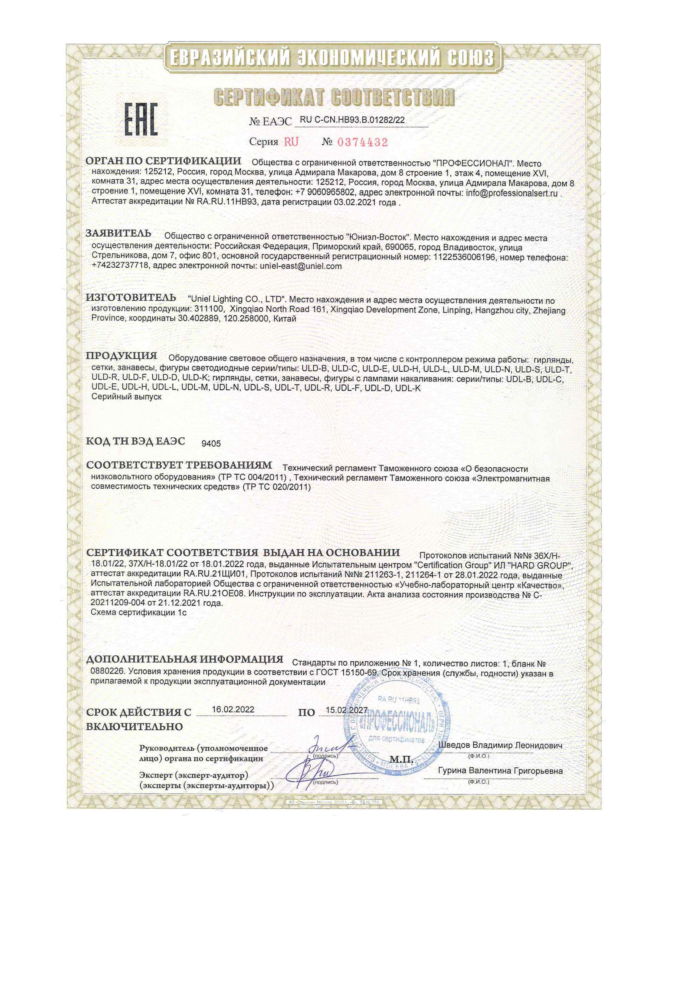 Декларация №ЕАЭС N RU Д-CN.РА02.В.81325/21 от 22.11.21 до 21.11.26 выдана: Заявитель-ООО "Юниэл-Восток"