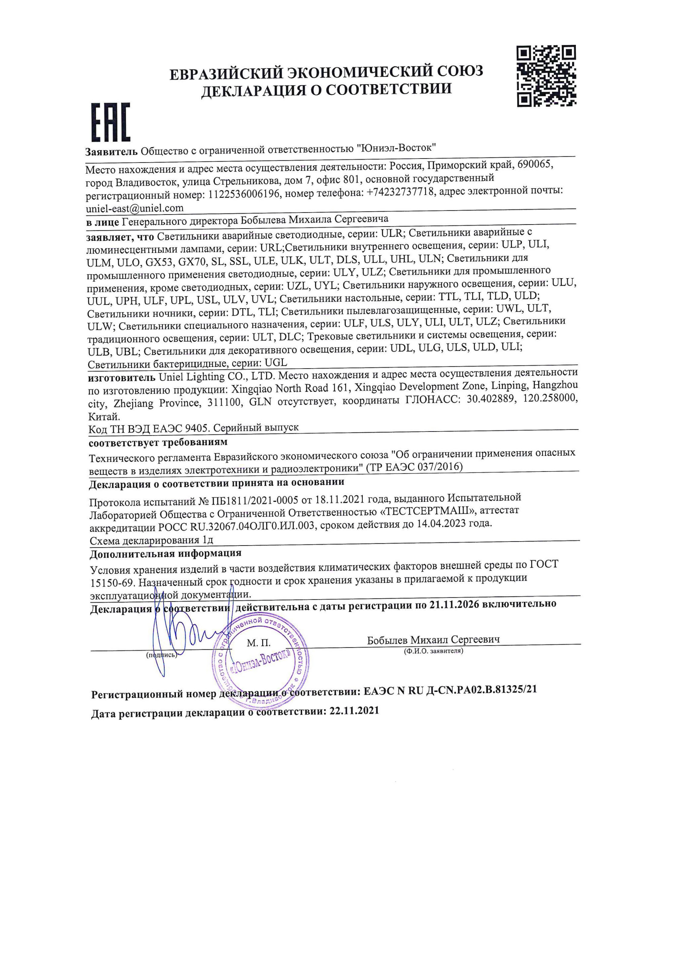 Декларация №ЕАЭС N RU Д-CN.РА02.В.81325/21 от 22.11.21 до 21.11.26 выдана: Заявитель-ООО "Юниэл-Восток"