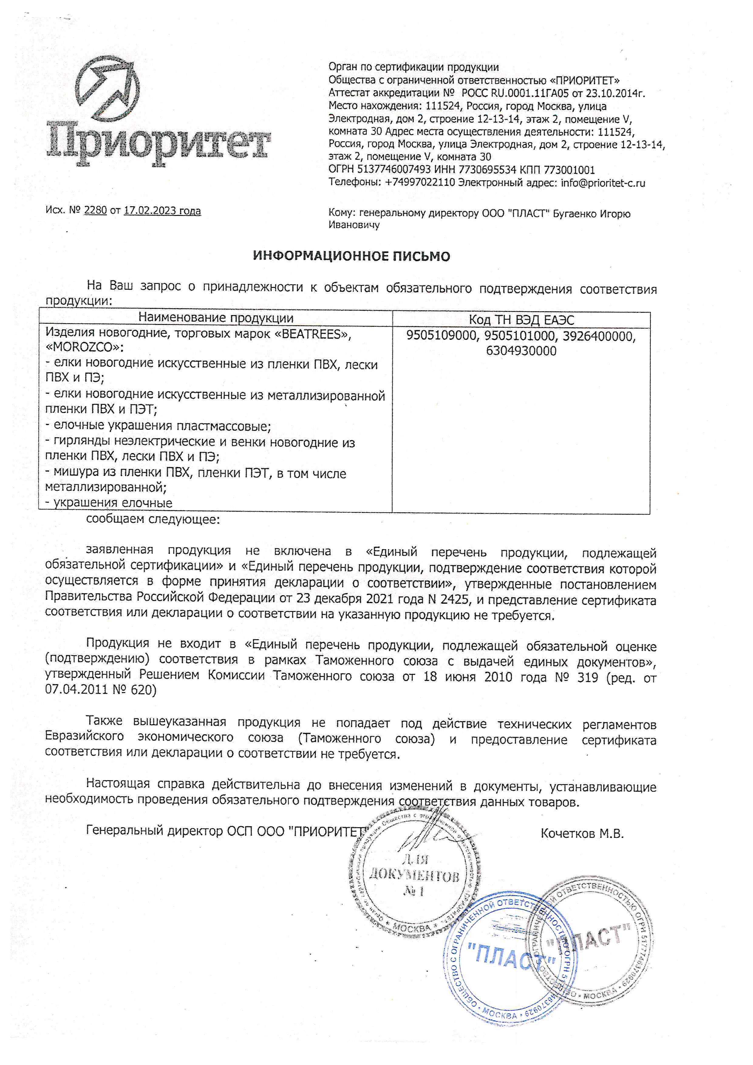 Сертификация-Информационное письмо №2280 от 17.02.23 г. выдано ОС продукции ООО "Приоритет", Информационное письмо №04-07/18 от 16.07.18 выдано ООО "Центрпожсерт"