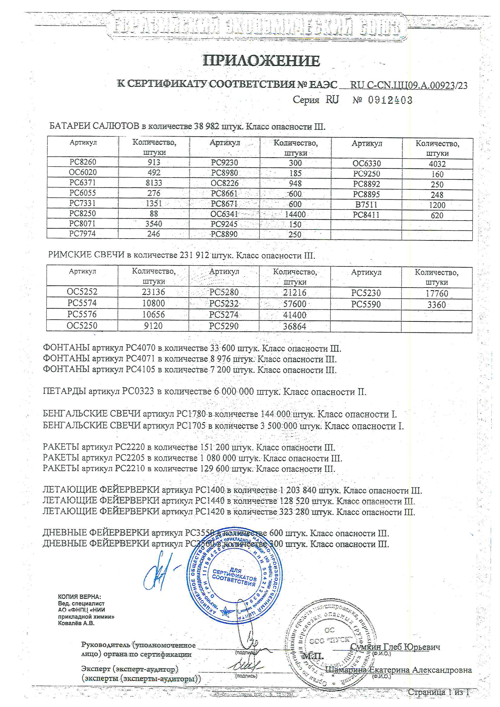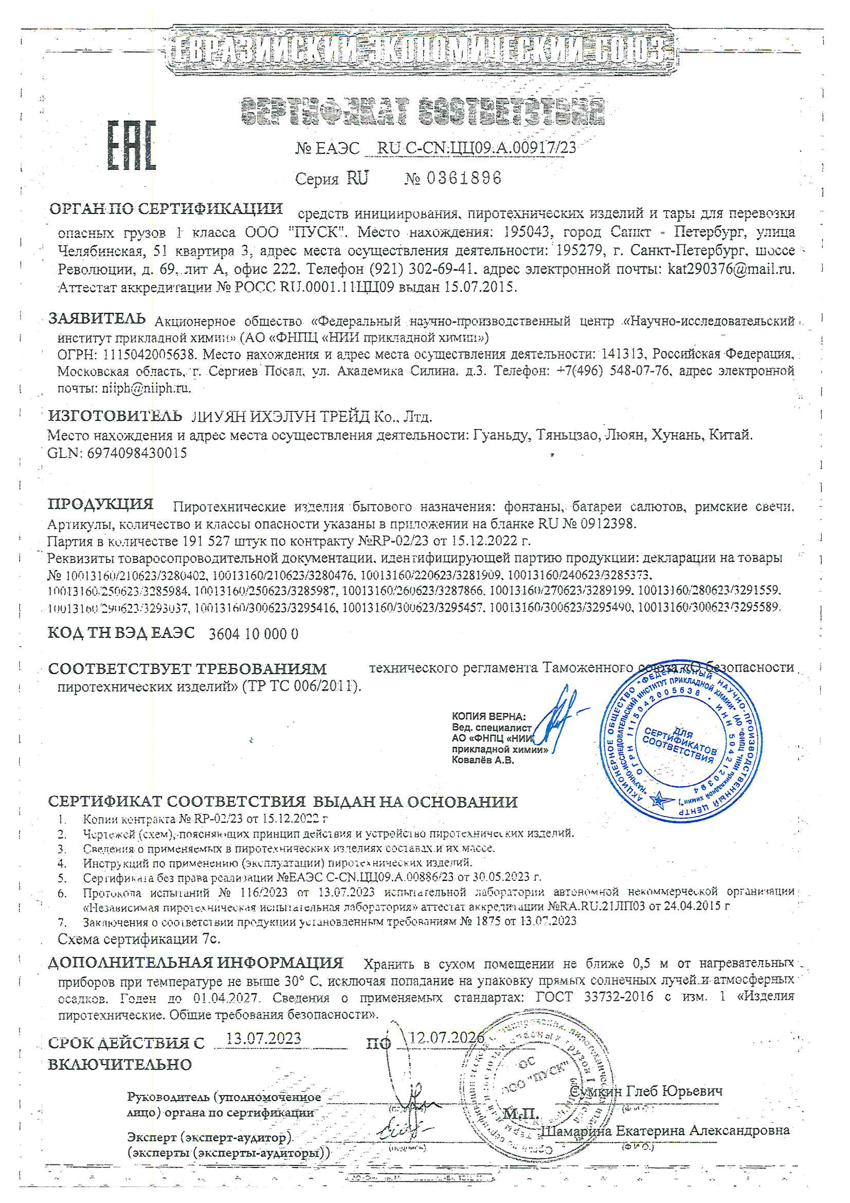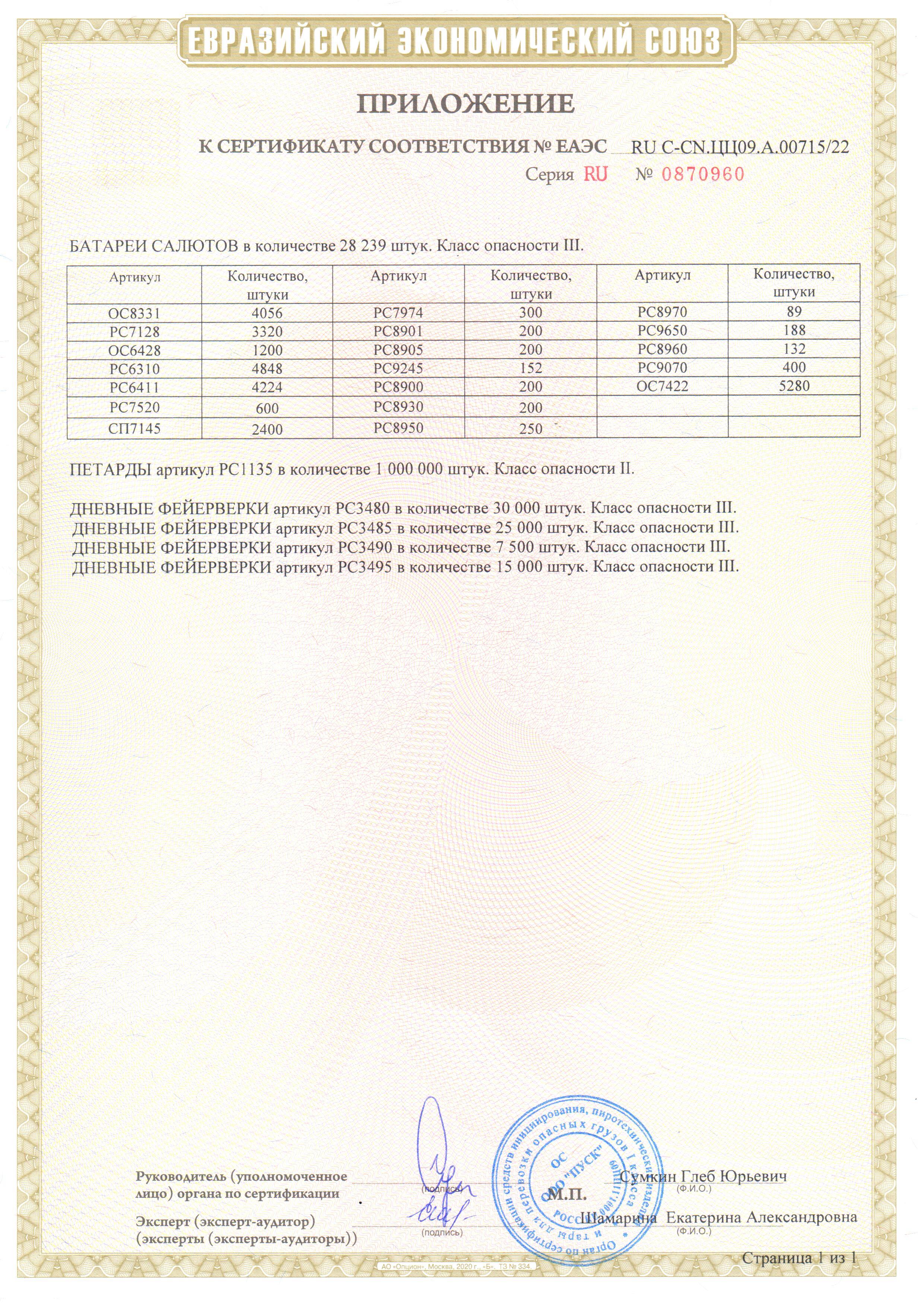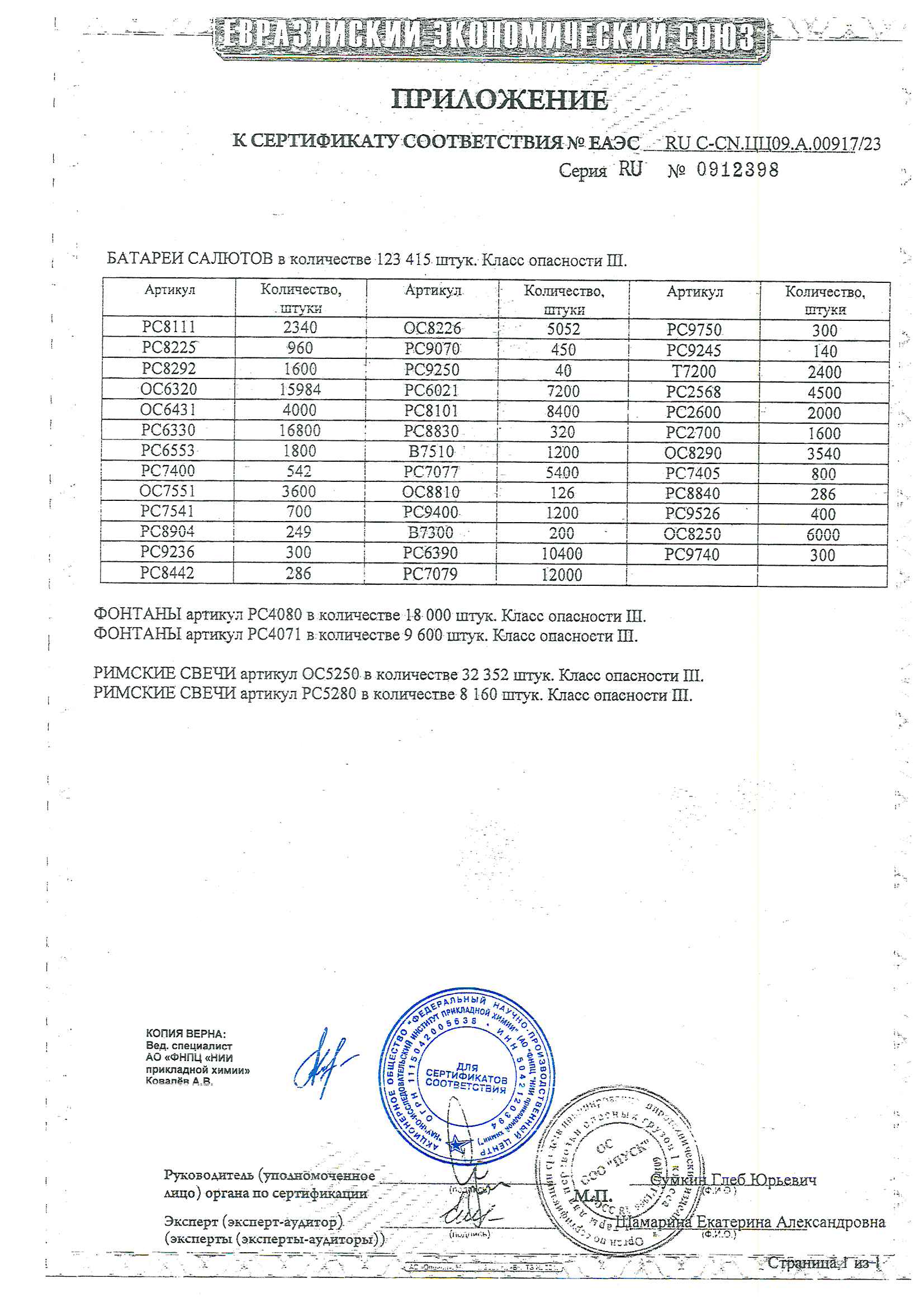 1. Два уровня. Нижний уровень - букеты из: серебряных трещащих огней. синих огней, золотых трасс. 2. Разноцветные кометы, зигзагообразные искристые трассы разрываются сферами из: крупных красных, крупных зеленых и белых мерцающих огней, фиолетовых, синих и зеленых мерцающих огней. 3. Голубых, оранжевых и золотых мерцающих огней. 4. Серебряных форсов и синих огней. 5. Серебряных форсов с зелеными огнями на концах, фиолетовых и трещащих серебряных огней. 6. Серебряных форсов с красными огнями на концах, зеленых и трещащих серебряных огней. 7. Веер. Последовательно вылетают букетики из красных и зеленых огней. 8. Веер. Последовательно вылетают букетики из золотых форсов. 9. Веер. Последовательно вылетают букетики из белых мерцающих огней. 10. Веер. Зигзагообразные искристые серебряные трассы. 11. Золотых форсов с красными мерцающими искрами и голубых огней. 12. Золотых форсов с зелеными мерцающими искрами и фиолетовых огней. 13. Золотых форсов с золотыми мерцающими искрами и желтых огней. 14. Серебряных форсов с зелеными огнями на концах и крупных красных огней. 15. Зеленых мерцающих огней с серебряными форсами в центре. 16. Красных мерцающих огней с серебряными форсами в центре. 17. Серебряных форсов серебряными искрами. 18. Серебряных искристых форсов. 19. Золотых форсов с трещащими искрами. 20. Множества трещащих золотых сфер. 21. Веер. Центральная часть - сферы из серебряных форсов и зеленых мерцающих огней. Боковые ветви - золотые форсы с красными мерцающими искрами. 22. Веер. Центральная часть - сферы из серебряных форсов и голубых огней. Боковые ветви - зигзагообразные искристые трассы. 23. Серебряных искристых форсов и желтых огней. 24. Серебряных искристых форсов и голубых огней. 25. Золотых искристых форсов.