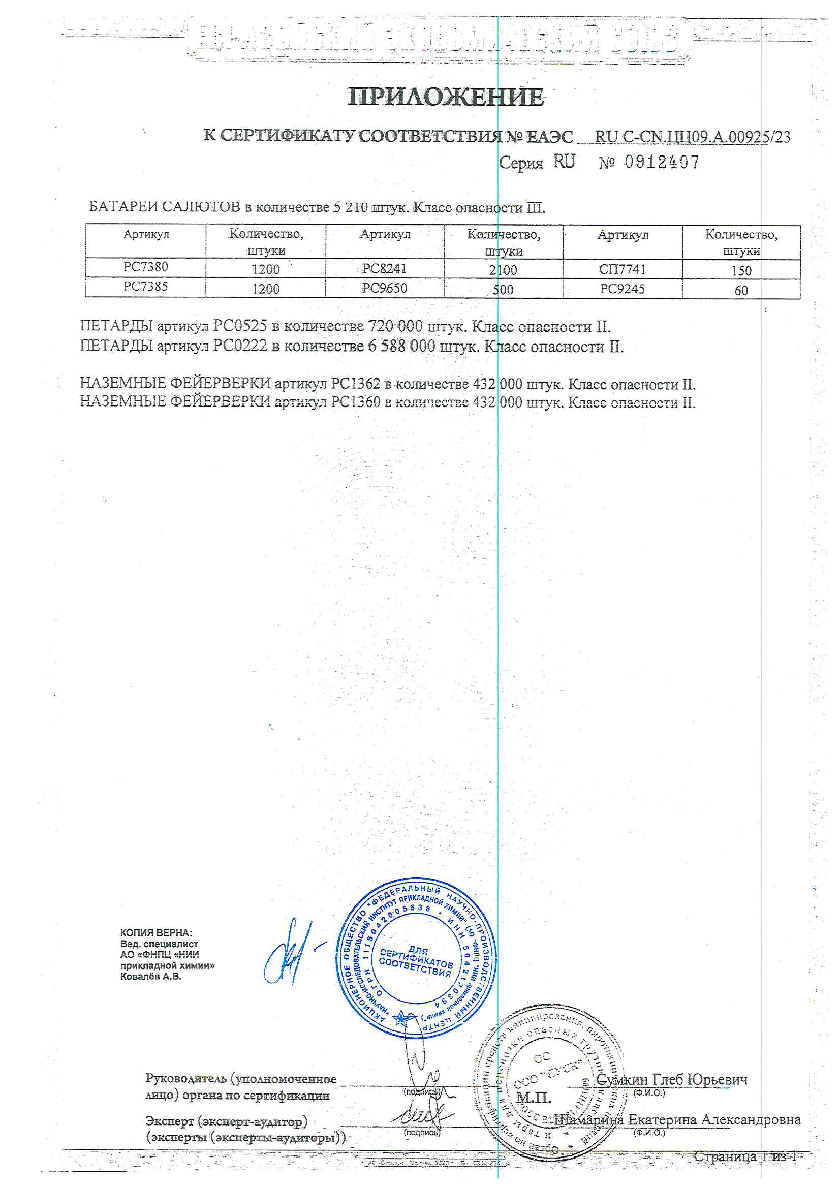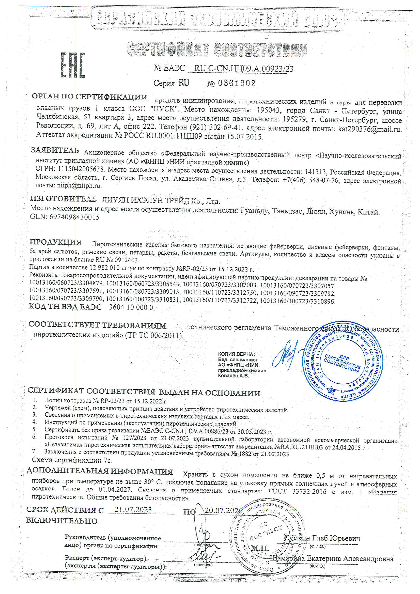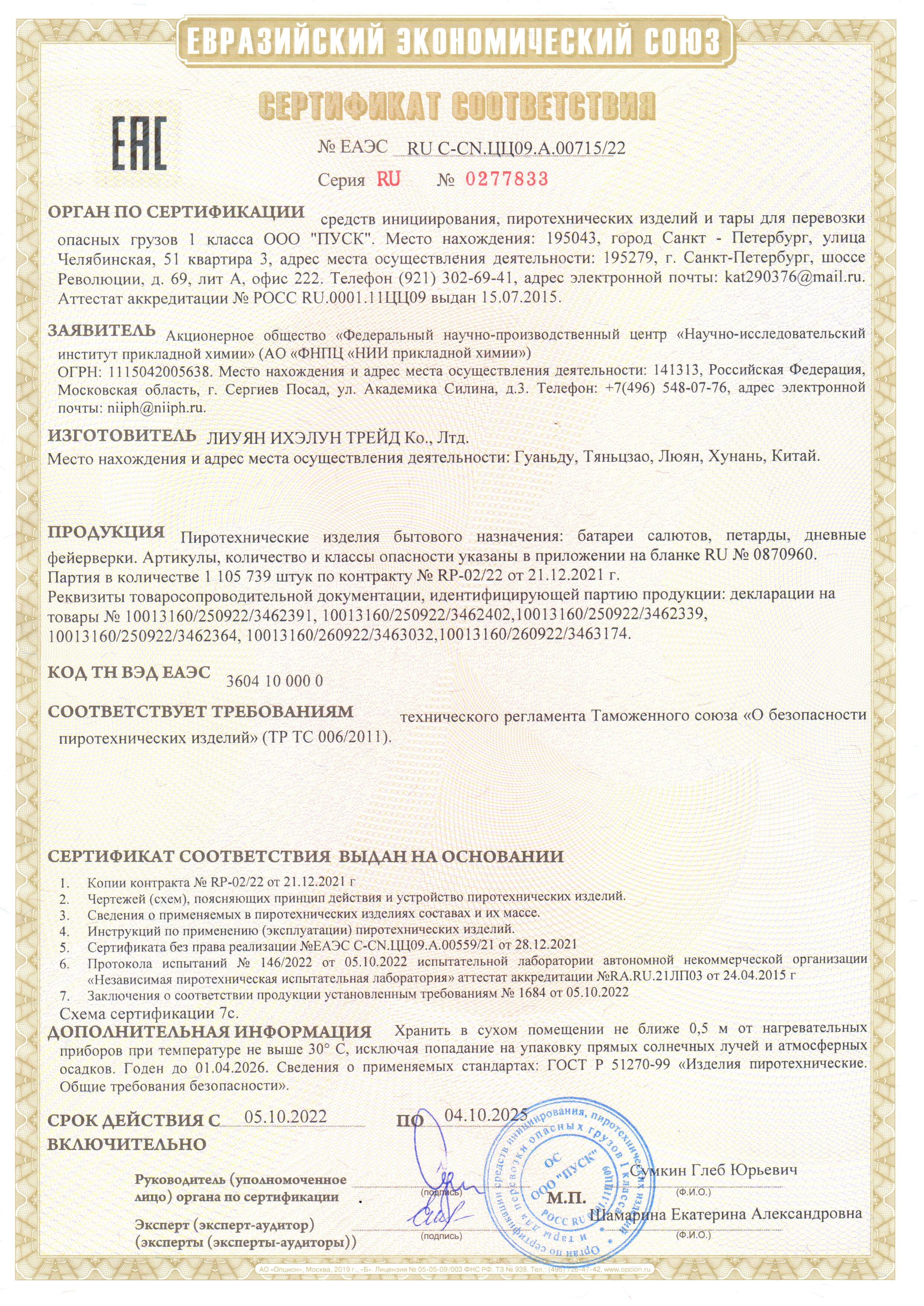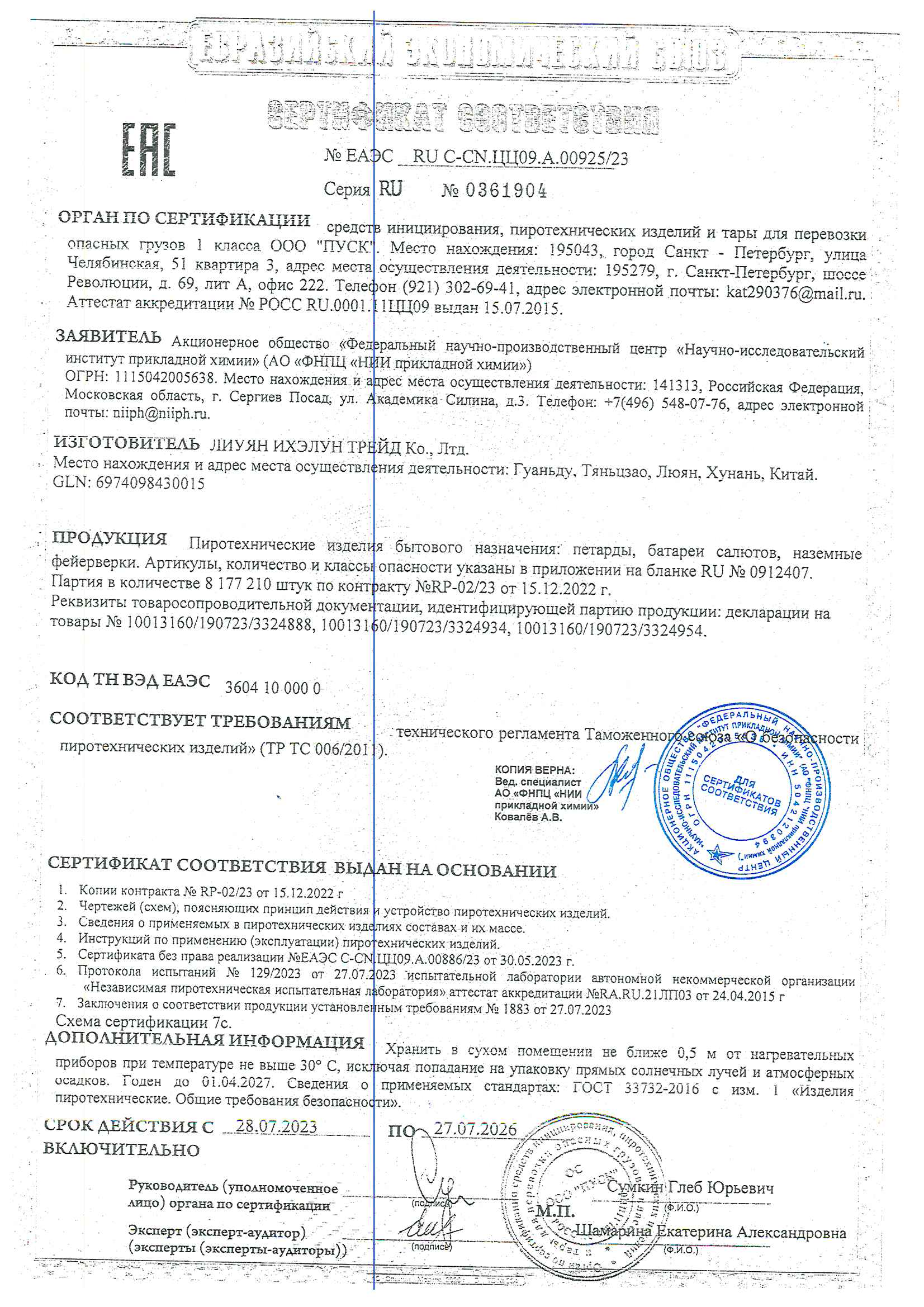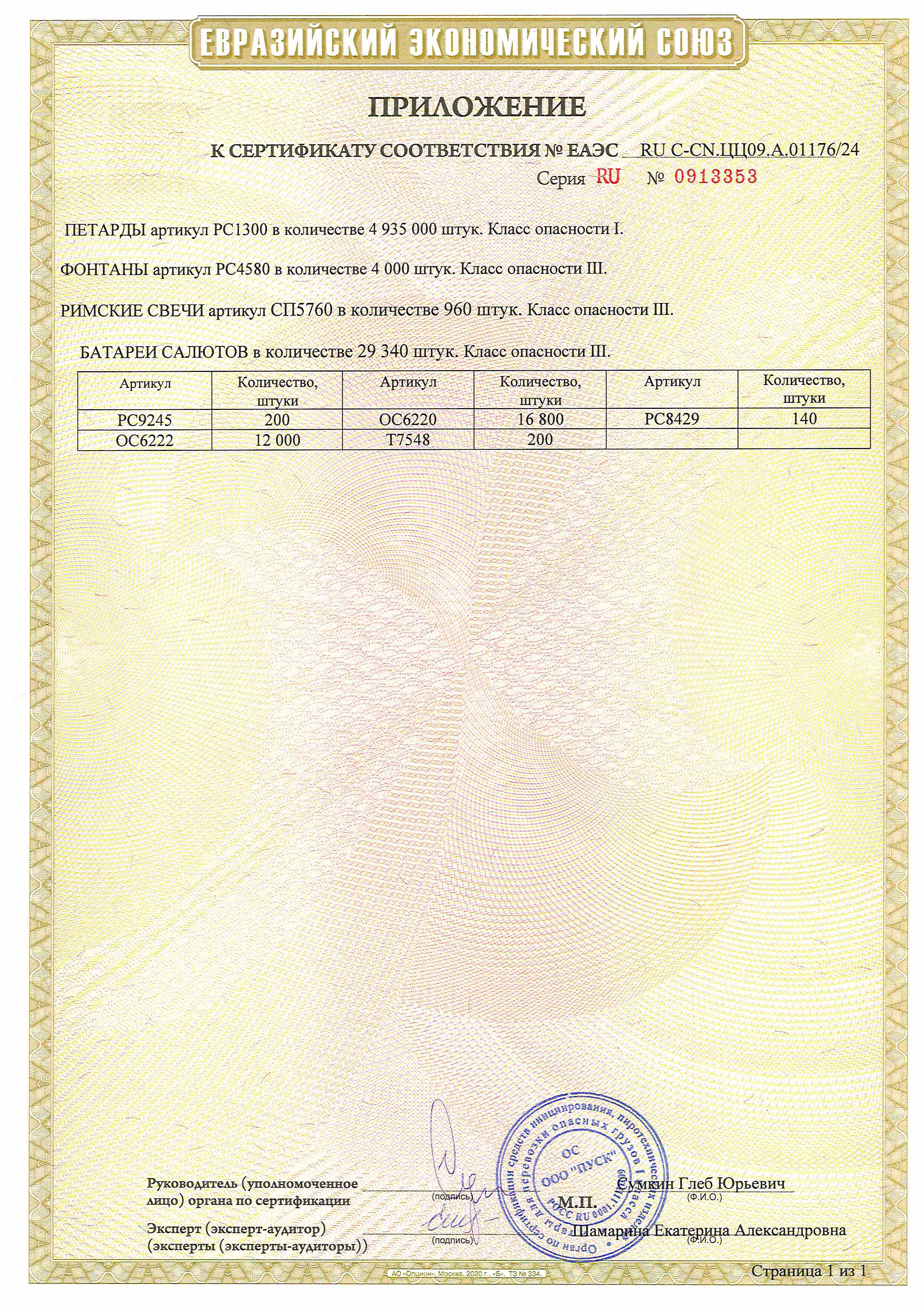 1. Два уровня. Нижний уровень - букеты из: серебряных трещащих огней. синих огней, золотых трасс. 2. Разноцветные кометы, зигзагообразные искристые трассы разрываются сферами из: крупных красных, крупных зеленых и белых мерцающих огней, фиолетовых, синих и зеленых мерцающих огней. 3. Голубых, оранжевых и золотых мерцающих огней. 4. Серебряных форсов и синих огней. 5. Серебряных форсов с зелеными огнями на концах, фиолетовых и трещащих серебряных огней. 6. Серебряных форсов с красными огнями на концах, зеленых и трещащих серебряных огней. 7. Веер. Последовательно вылетают букетики из красных и зеленых огней. 8. Веер. Последовательно вылетают букетики из золотых форсов. 9. Веер. Последовательно вылетают букетики из белых мерцающих огней. 10. Веер. Зигзагообразные искристые серебряные трассы. 11. Золотых форсов с красными мерцающими искрами и голубых огней. 12. Золотых форсов с зелеными мерцающими искрами и фиолетовых огней. 13. Золотых форсов с золотыми мерцающими искрами и желтых огней. 14. Серебряных форсов с зелеными огнями на концах и крупных красных огней. 15. Зеленых мерцающих огней с серебряными форсами в центре. 16. Красных мерцающих огней с серебряными форсами в центре. 17. Серебряных форсов серебряными искрами. 18. Серебряных искристых форсов. 19. Золотых форсов с трещащими искрами. 20. Множества трещащих золотых сфер. 21. Веер. Центральная часть - сферы из серебряных форсов и зеленых мерцающих огней. Боковые ветви - золотые форсы с красными мерцающими искрами. 22. Веер. Центральная часть - сферы из серебряных форсов и голубых огней. Боковые ветви - зигзагообразные искристые трассы. 23. Серебряных искристых форсов и желтых огней. 24. Серебряных искристых форсов и голубых огней. 25. Золотых искристых форсов.