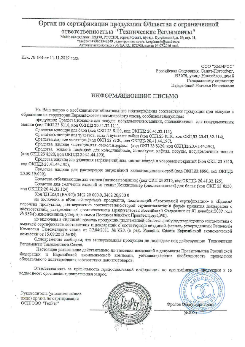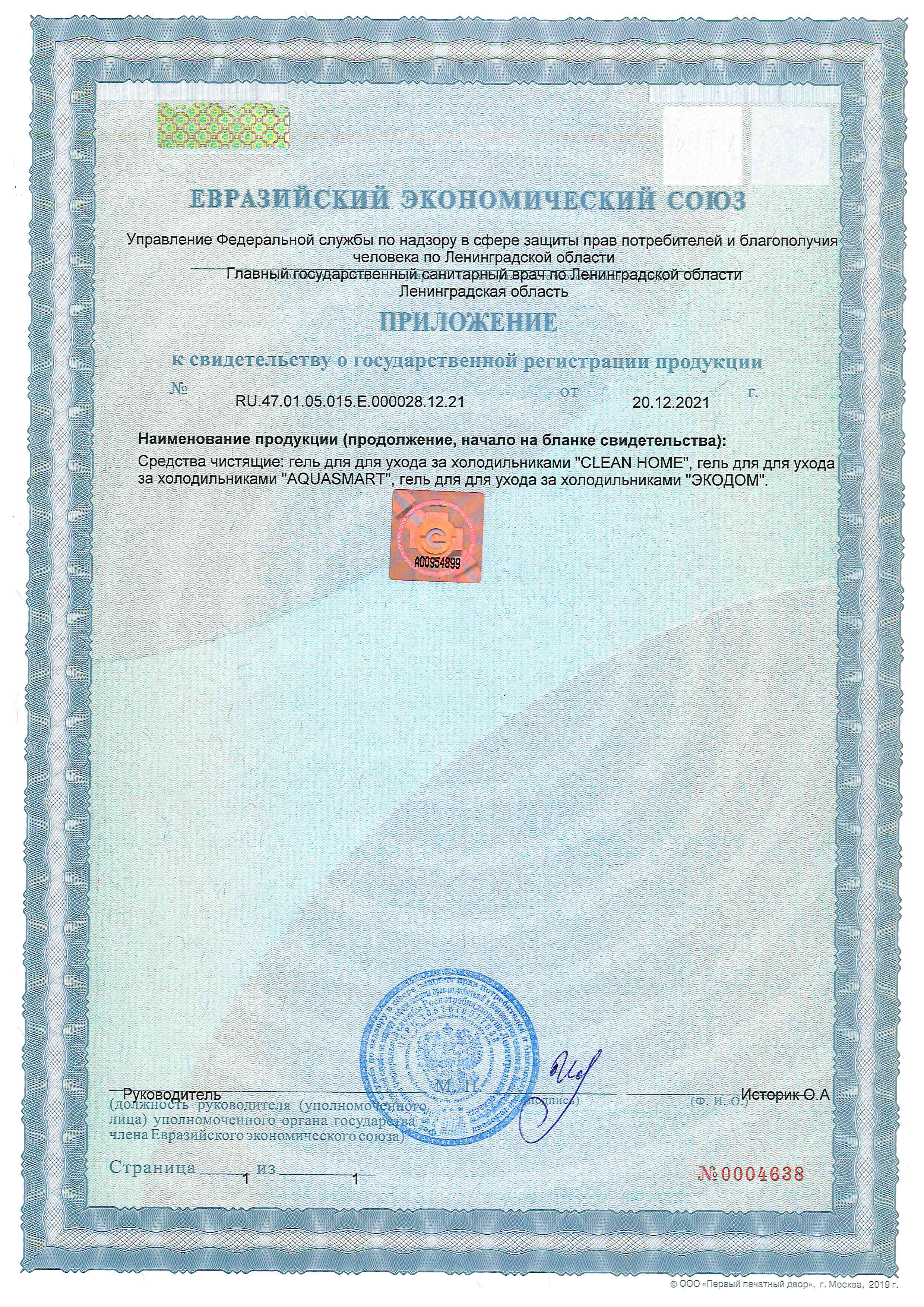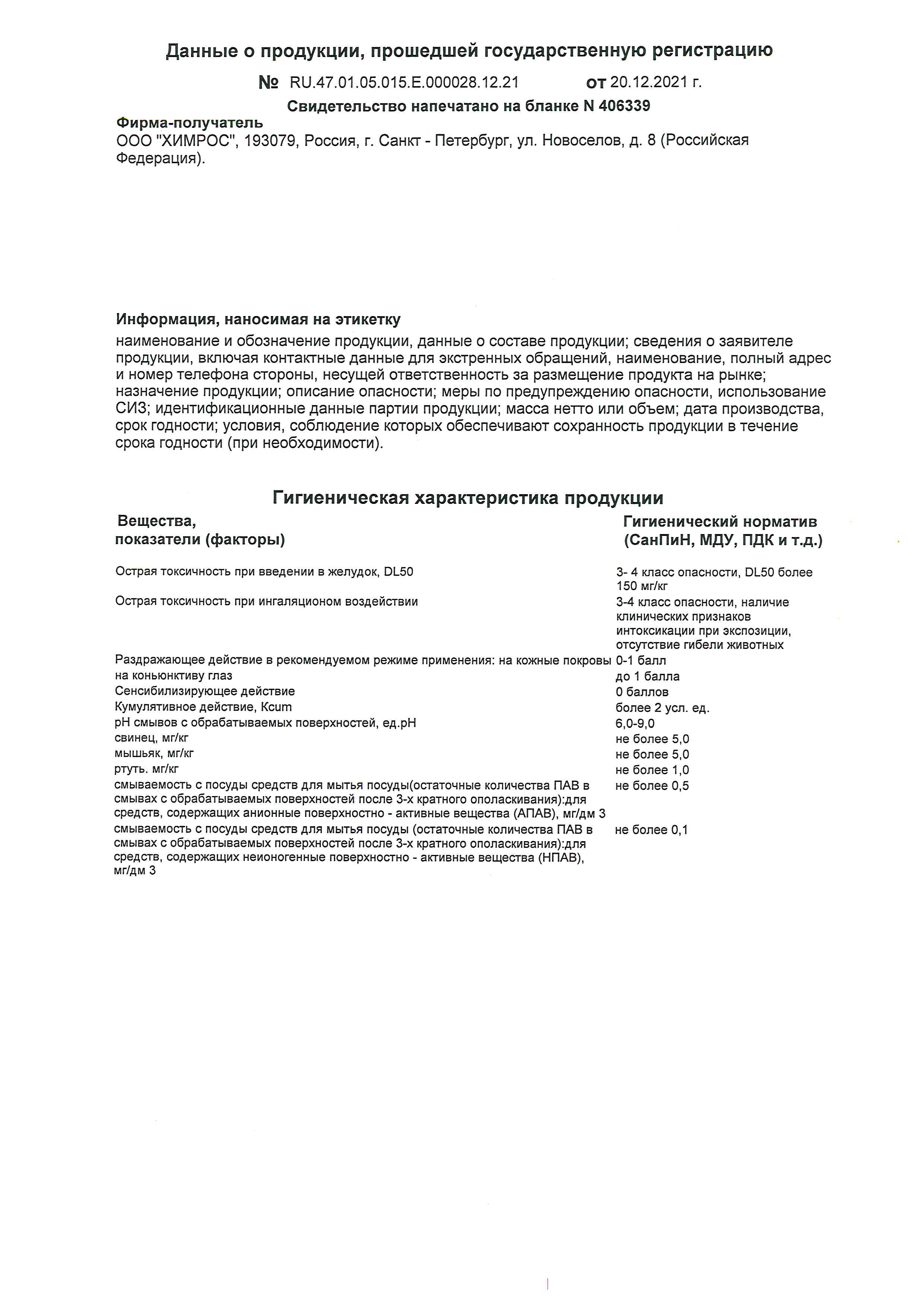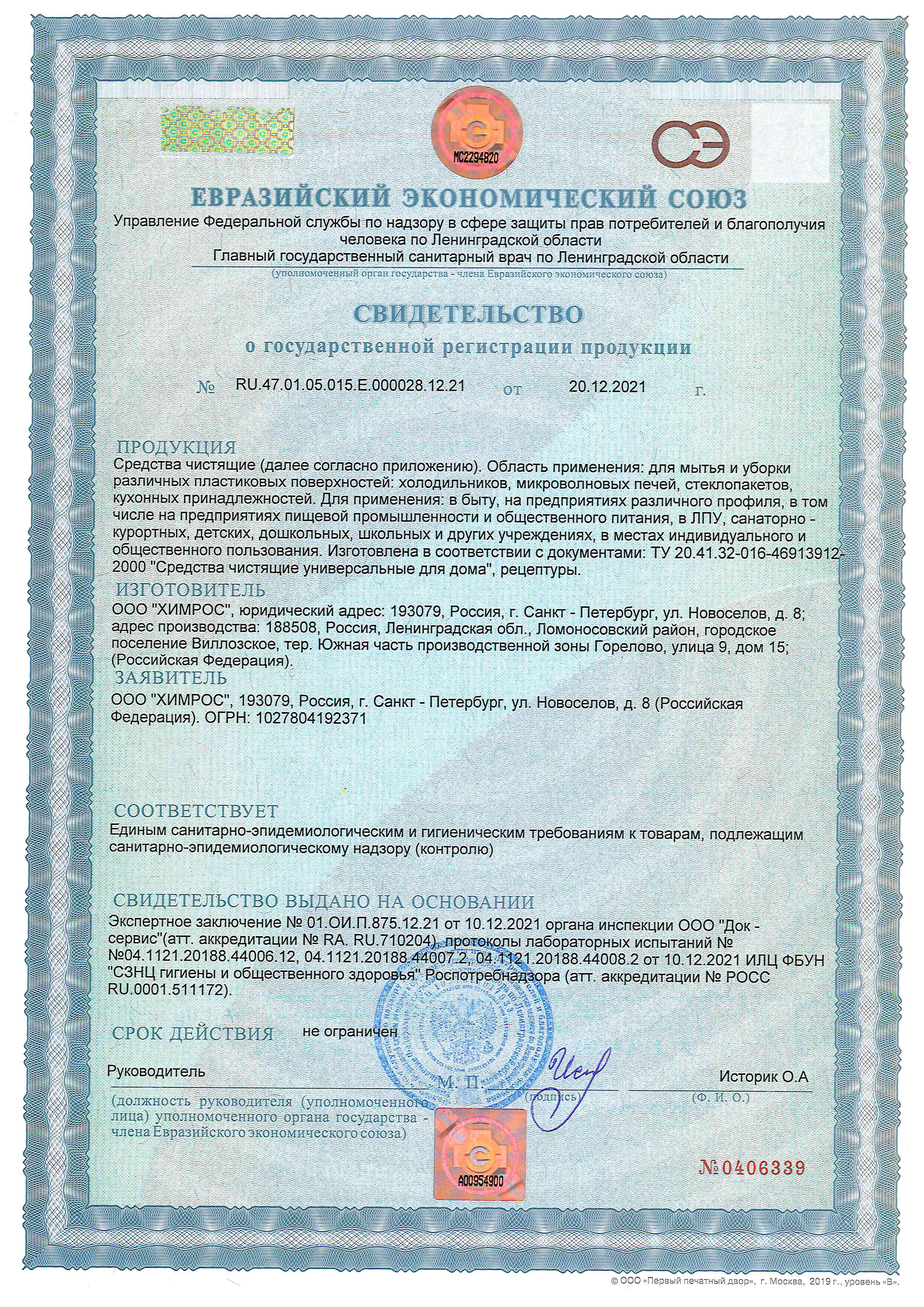 Государственная регистрация №RU.78.01.05.015.Е.000028.10.21, №0406339 от 20.12.21 выдана Управление Роспотребнадзора по г. С-Петербургу. Главный санитарный врач по г. С-Петербургу, Сертификация-информационное письмо №644 от 11.11.2019 г. выдано ОС продукциии ООО "Технические Регламенты"