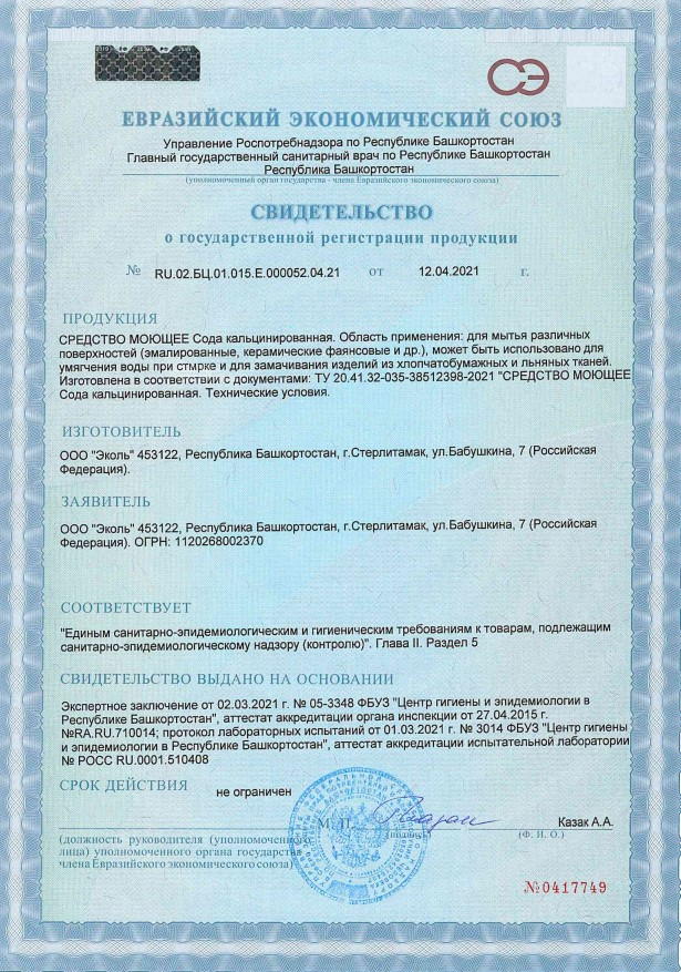 Сода кальцинированная техническая. Водосмягчающее, моющее, жироудаляющее средство. Предназначена для стирки и кипячения тканей, мытья всех видов посуды, очистки ванн, раковин, кафеля от загрязнений, умягчения воды и других хозяйственно-бытовых целей.