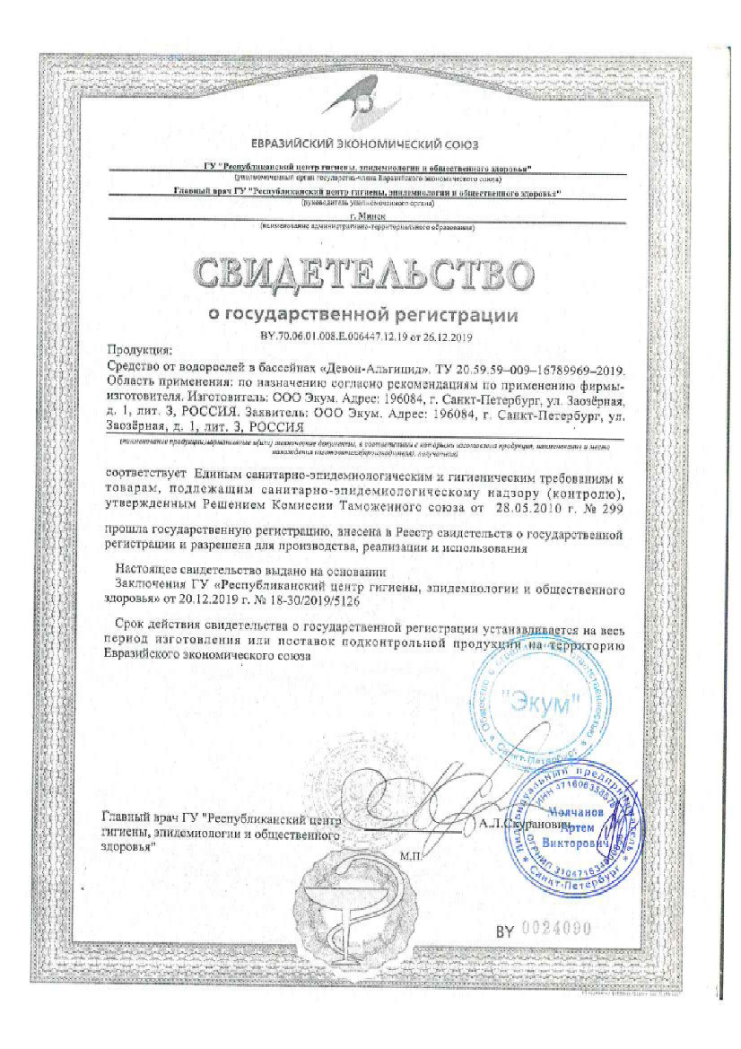 осветляет воду в бассейнах, уничтожает водоросли и предупреждает их появление.