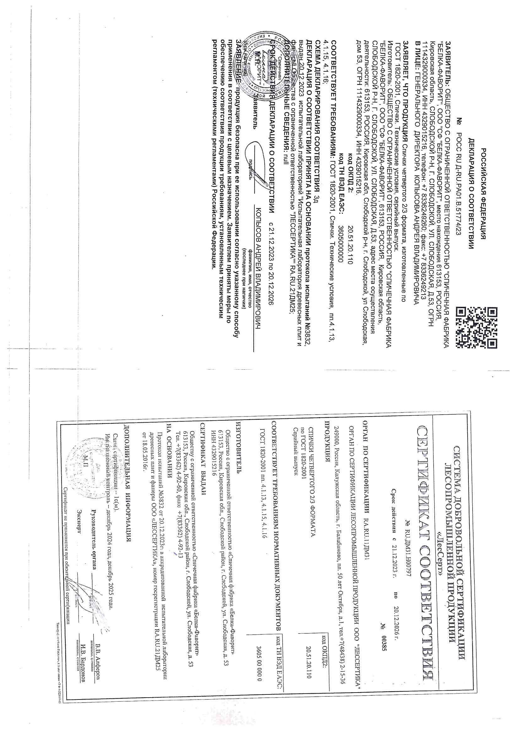 Сертификация-декларация №РРОСС RU Д-RU.РА01.В.51174/23 от 21.12.23 до 20.12.26 выдана Заявитель: ООО "Спичечная фабрика "Белка-Фаворит"