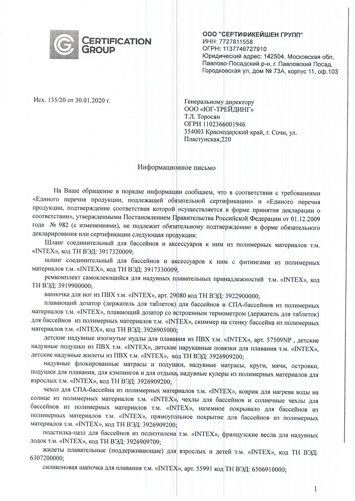 Сертификация-информационное письмо №135/20 от 30.01.20 выдано ООО "Сертификейшен групп".