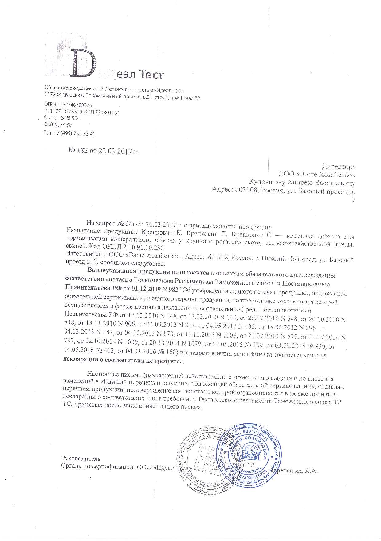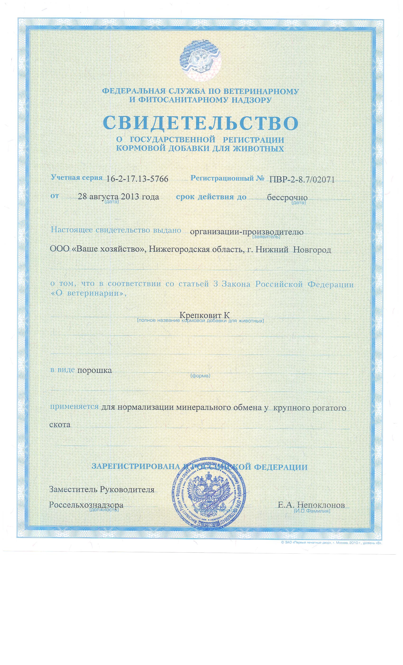 Государственная регистрация №ПВР-2-8 7/02071 от 28.08.21 выдана ФС по ветеринарному и фитосаниатрному надзору, Сертификация-информационное письмо №182 от 22.03.2017 выдано ООО"Идеал Тест"