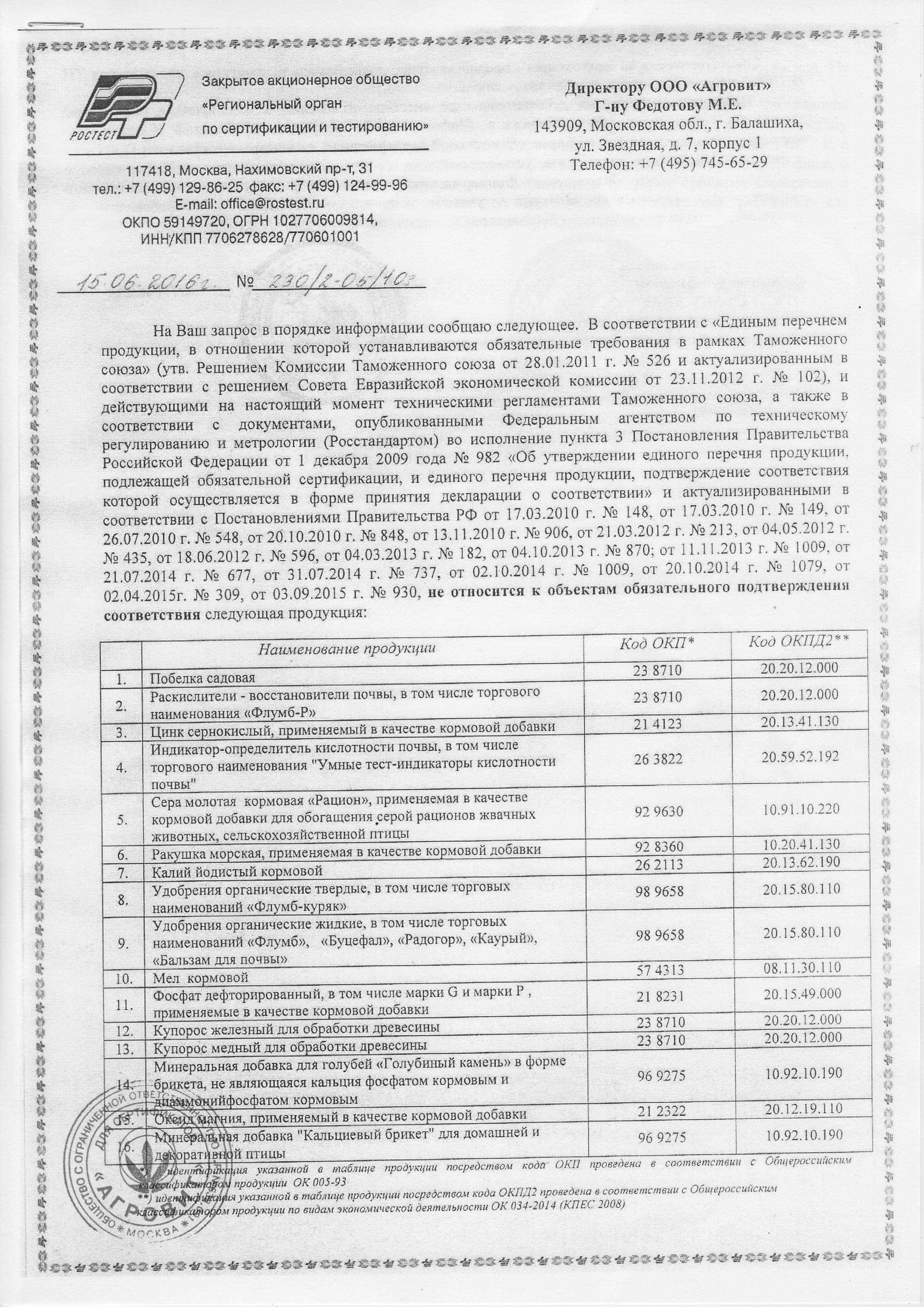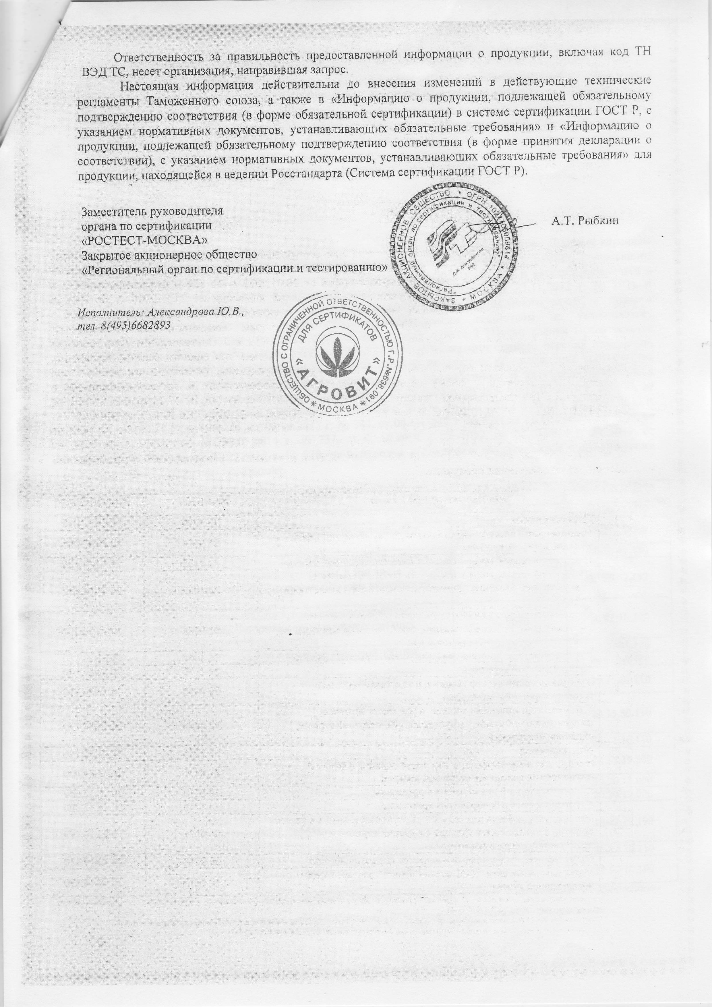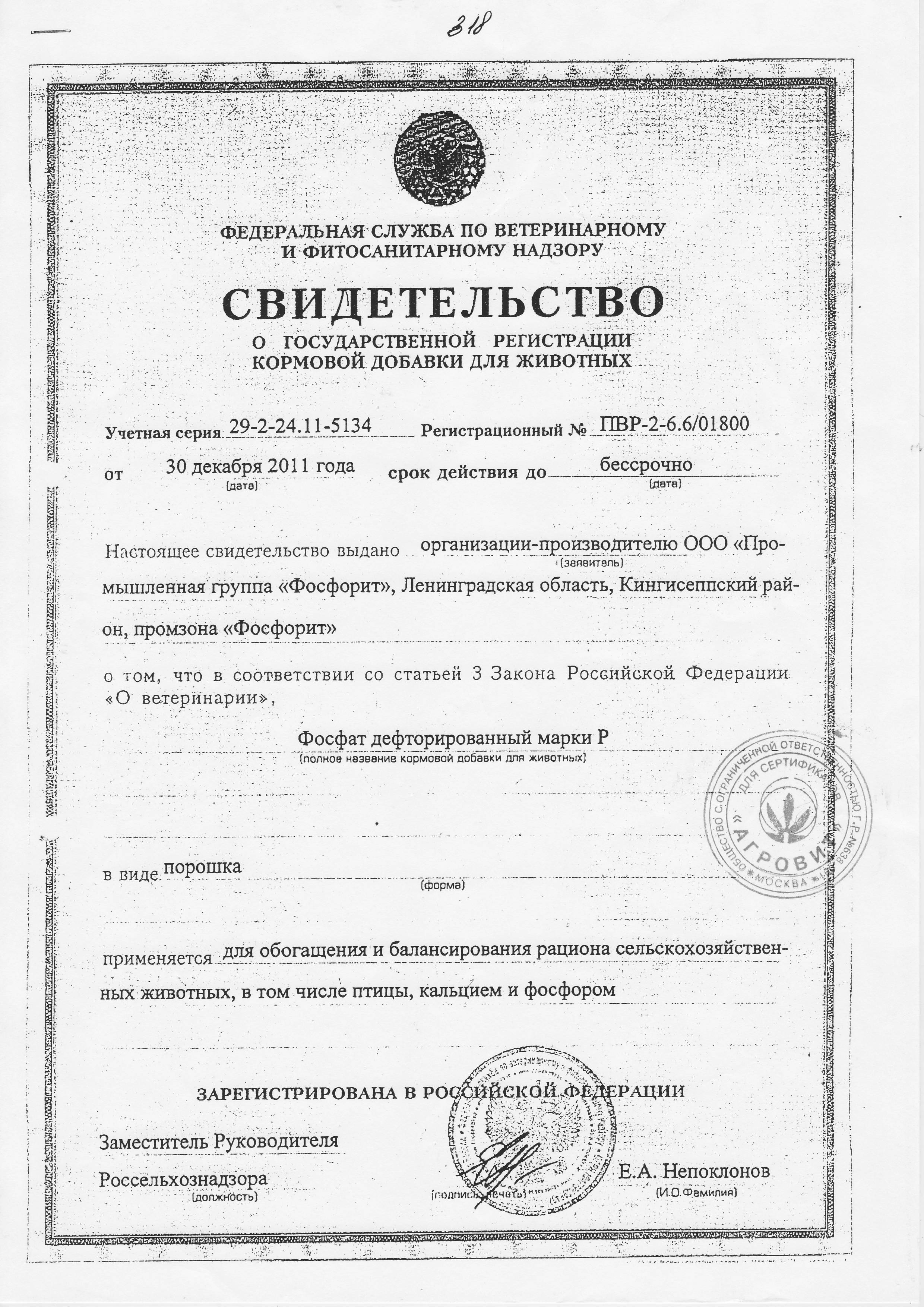 Государственная регистрация-№ПВР-2-6.6/01800 от 30.12.11 выдана ФС по ветеринарному и фитосанитарному надзору, Сертификация-информационное письмо №230/2-05/10 от 30.12.11 выдано ЗАО "Регианоальный орган по сертификации и тестированию"