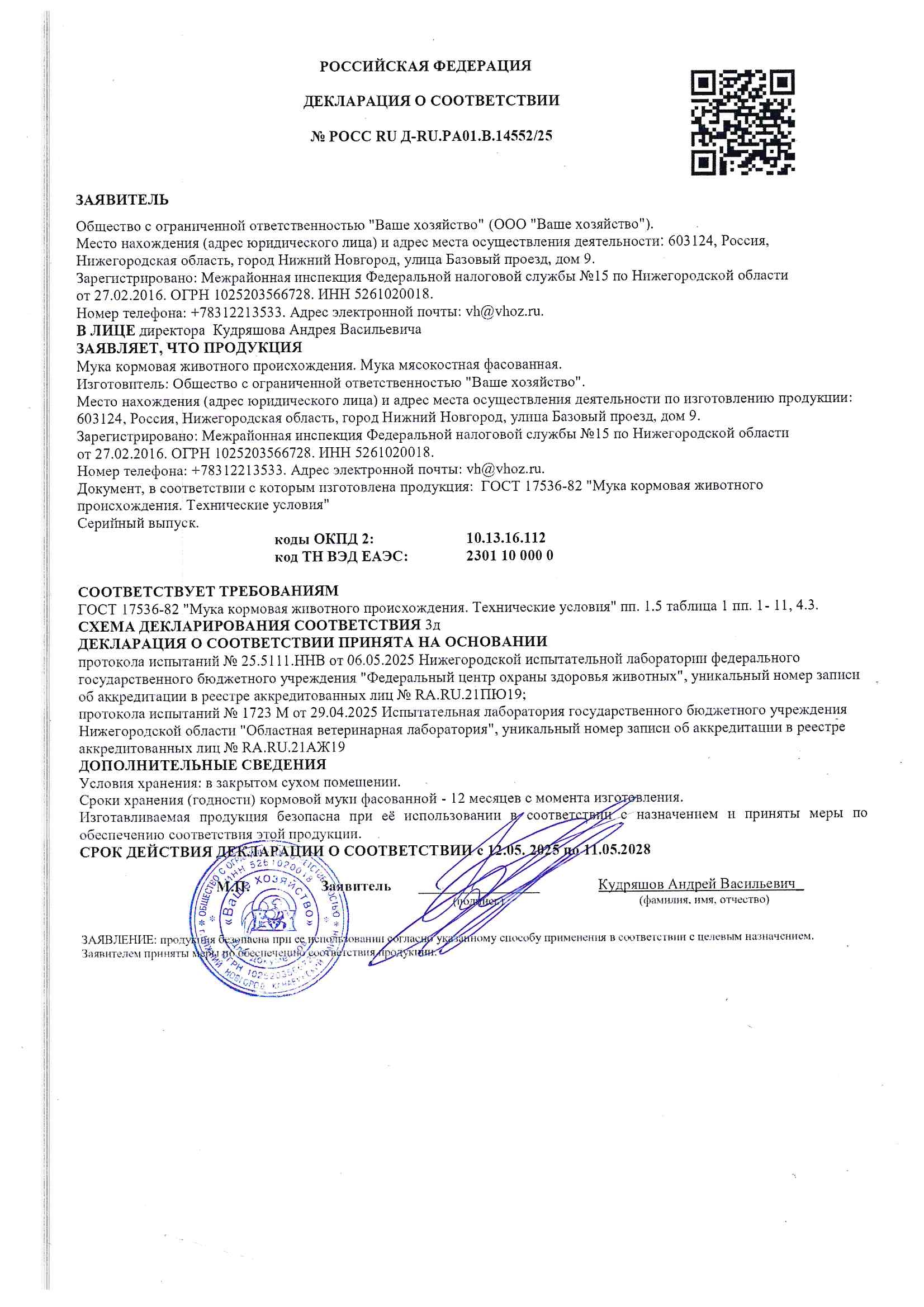 Состав: Мука кормовая животного происхождения. Мука мясокостная фасованная.