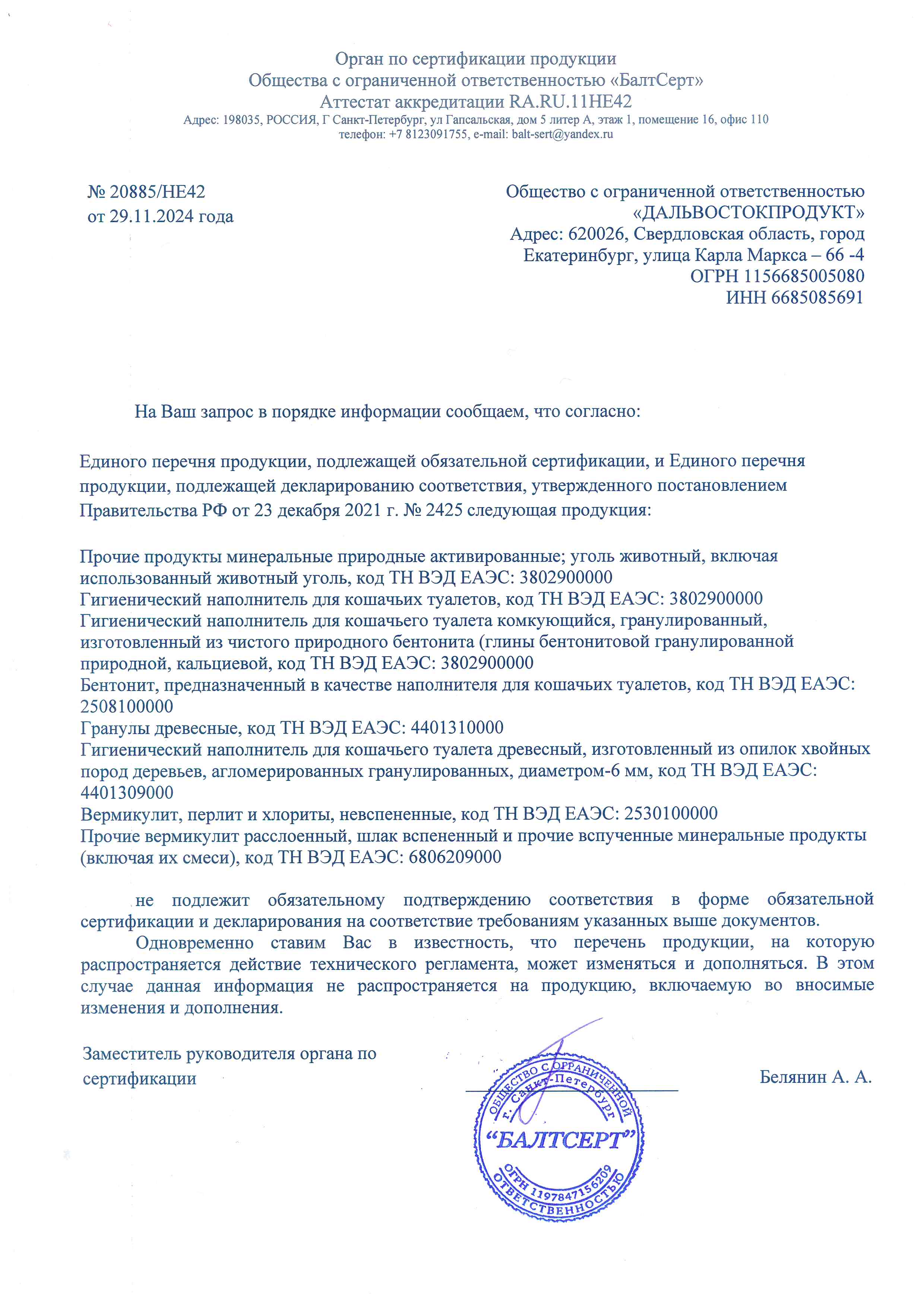 Применение: заполните кошачий туалет наполнителем слоем не менее 3см. Твердые экскременты удаляйте совком. Периодически перемешивайте содержимое лотка. При возникновении неприятного запаха полностью замените наполнитель. Смывать в унитаз запрещено. Не употреблять в пищу.