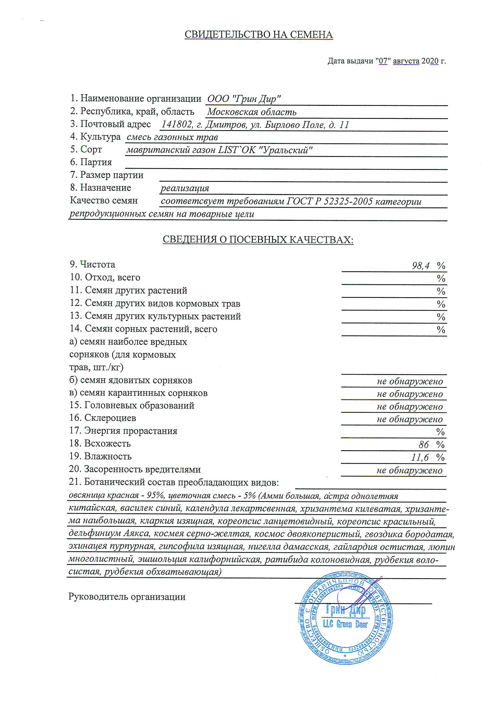 СОСТАВ: овсяница красная – 95%, цветочная смесь – 5% (амми большая, каллистефус китайский, василек синий, бархатцы прямостоячие, хризантема килеватая, хризантема наибольшая, кларкия изящная, кореопсис ланцетовидный, кореопсис красильный, космея серно-желтая, космос двоякоперистый, дельфиниум Аякса, гвоздика турецкая, эхинацея пурпурная, гайлардия остистая, нигелла дамасская, гипсофила изящная, люпин многолистный, мак самосейка, ратибида колоновидная, рудбекия обхватывающая, рудбекия волосистая).