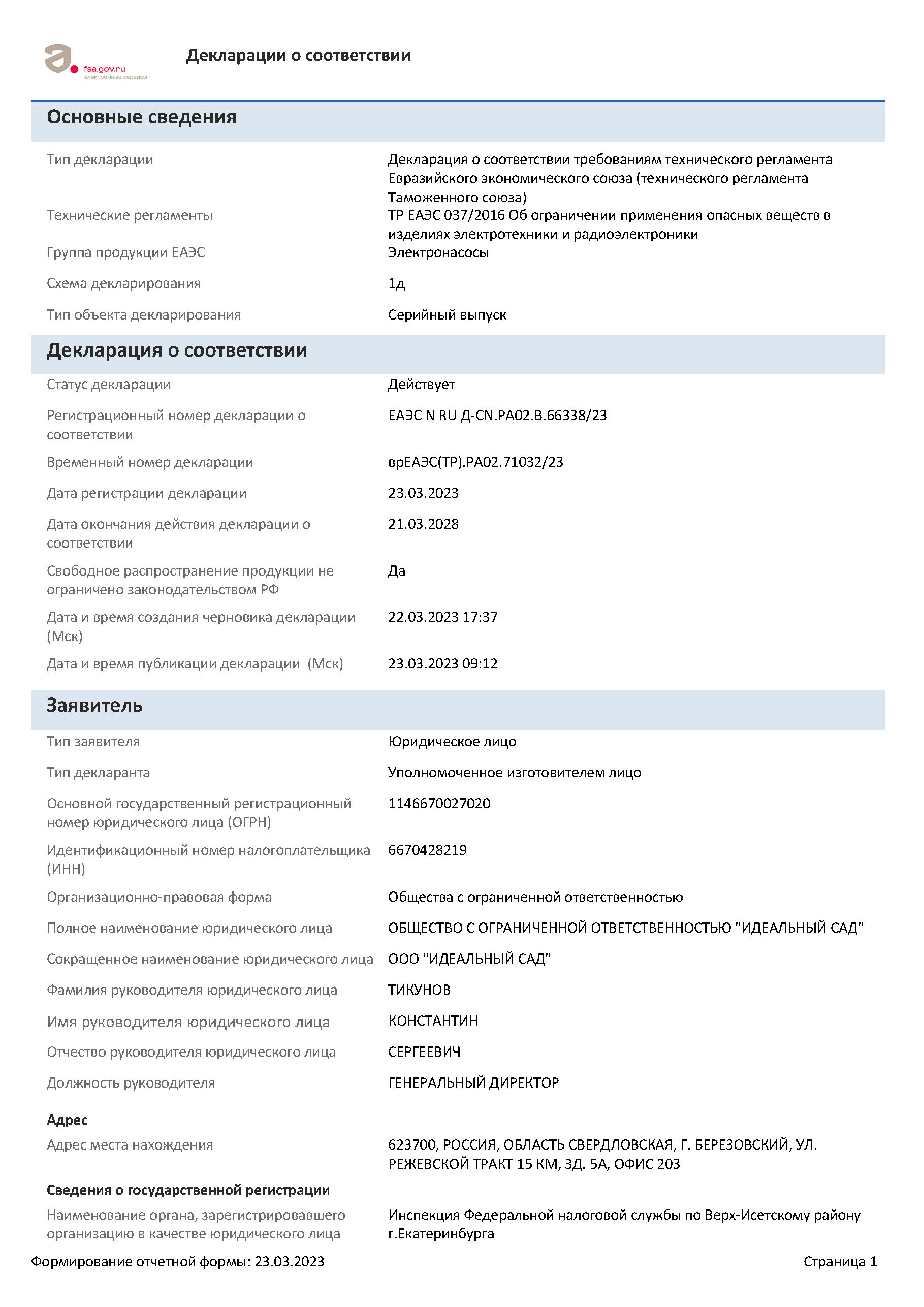 Сертификция-декларация ЕАЭС N RU Д-CN.РА02.В.66338/23 от 23.03.23 до 21.03.28 выдана Заявитель: ООО "Идеальный сад"
