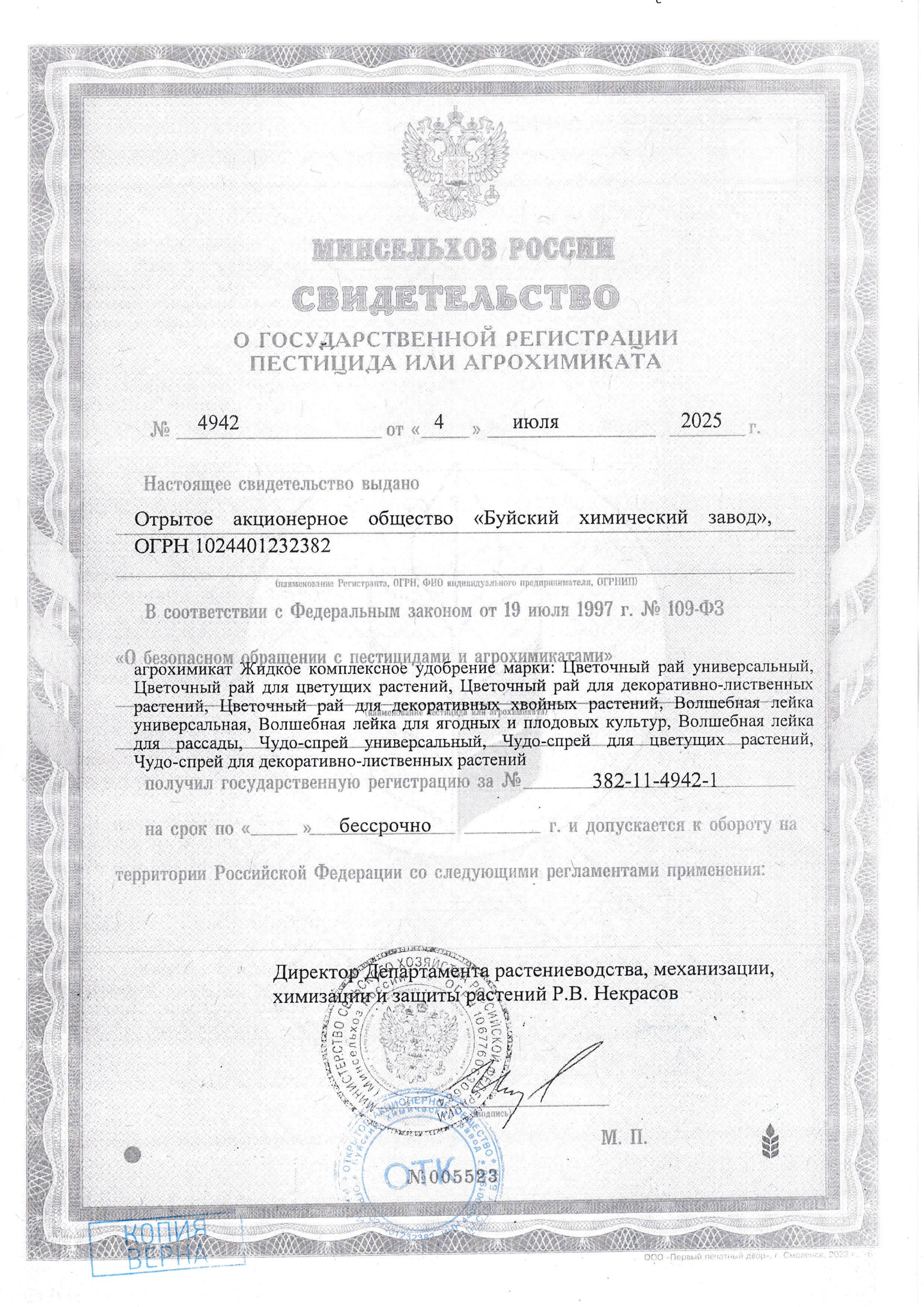 Государственная регистрация-№290-11-690-1 от 01.07.2015 до 30.06.2025 выдана МСХ РФ, Сертификация-декларация №РОСС RU Д-RU.РА01.В.12850/24 от 27.03.24 до 26.03.27 выдана заявитель: ОАО "Буйский Химический Завод"