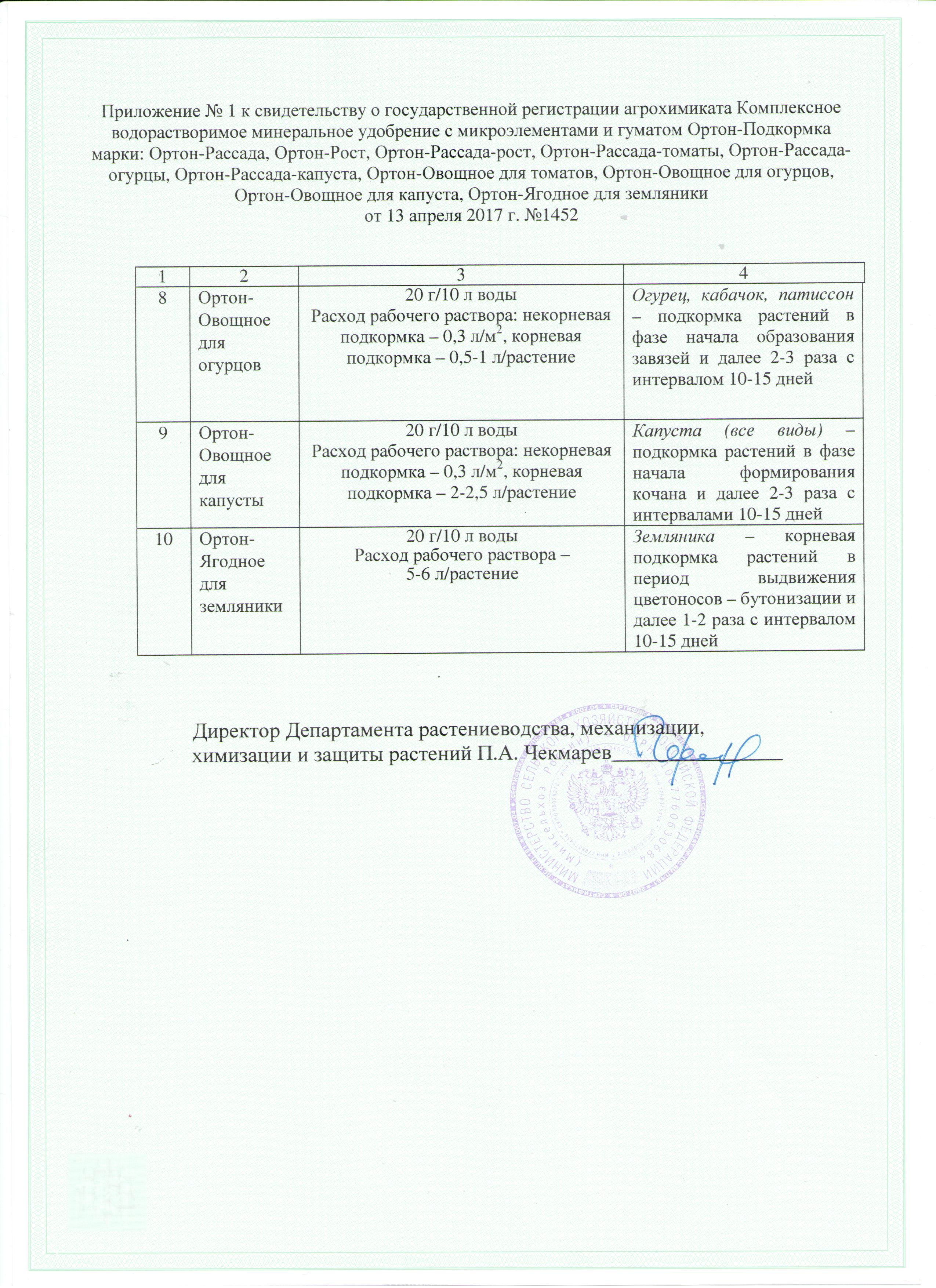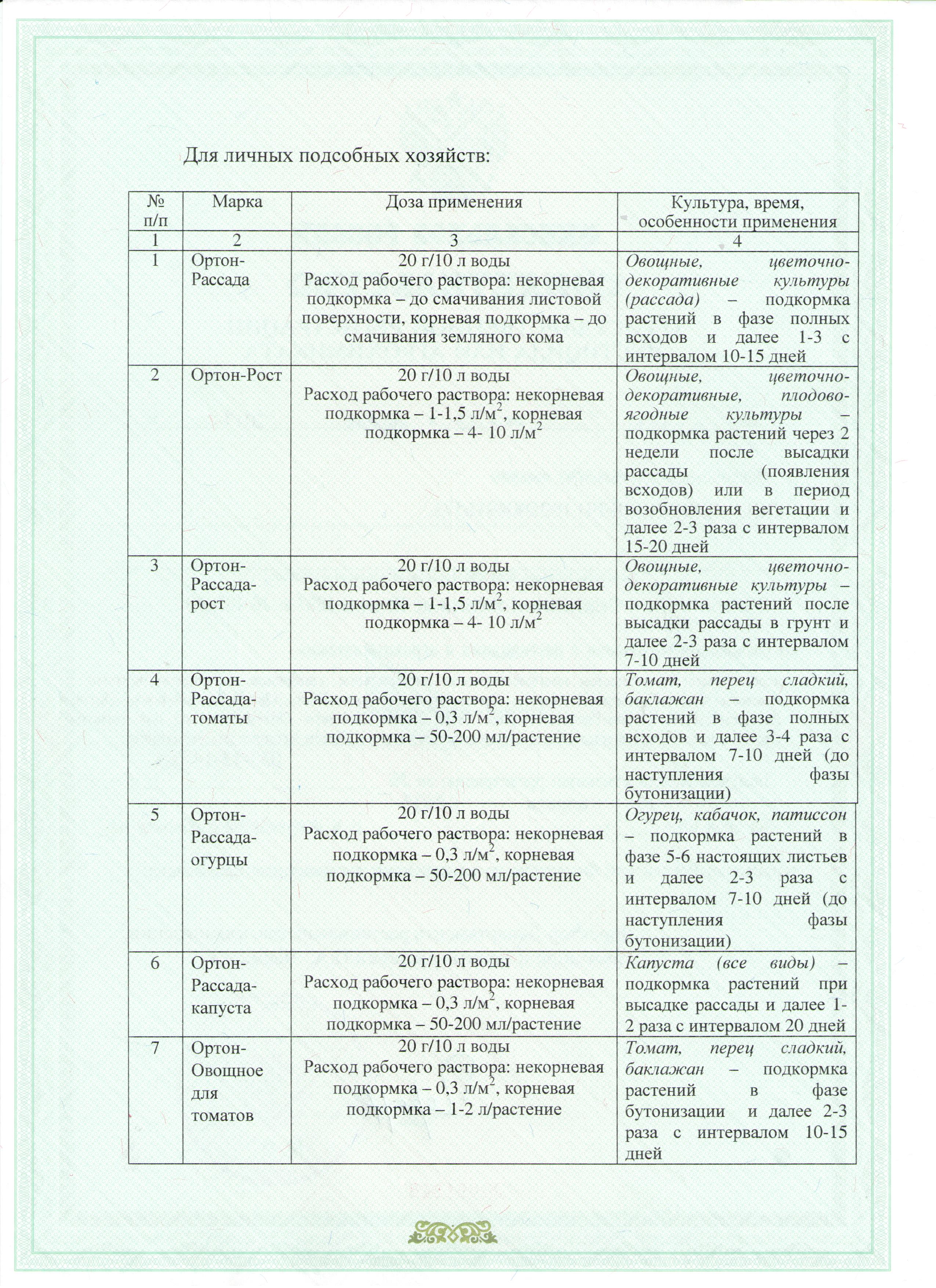 Подкормки проводят 2-3 раза после высадки рассады в грунт опрыскиванием или поливом. 1-ую подкормку проводят сразу после высадки, последующие с интервалом в 7-10 дней. Расход рабочего раствора – 4-10 л/м2 при поливе или 1-1,5 л/10 2 при опрыскивании.