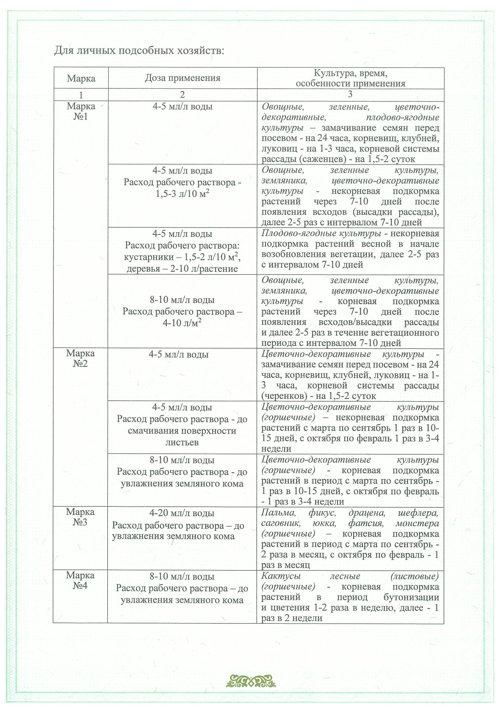Внекорневые (опрыскивание по листу) подкормки: Развести 1 колпачок (4-5 мл) в 1 литре воды, тщательно перемешать. С марта по сентябрь 1 раз в 10-15 дней, с октября по февраль 1 раз в 3-4 недели. Опрыскивать растения до полного смачивания листьев. Чередовать с корневыми подкормками. Опрыскивание проводить утром или вечером.
