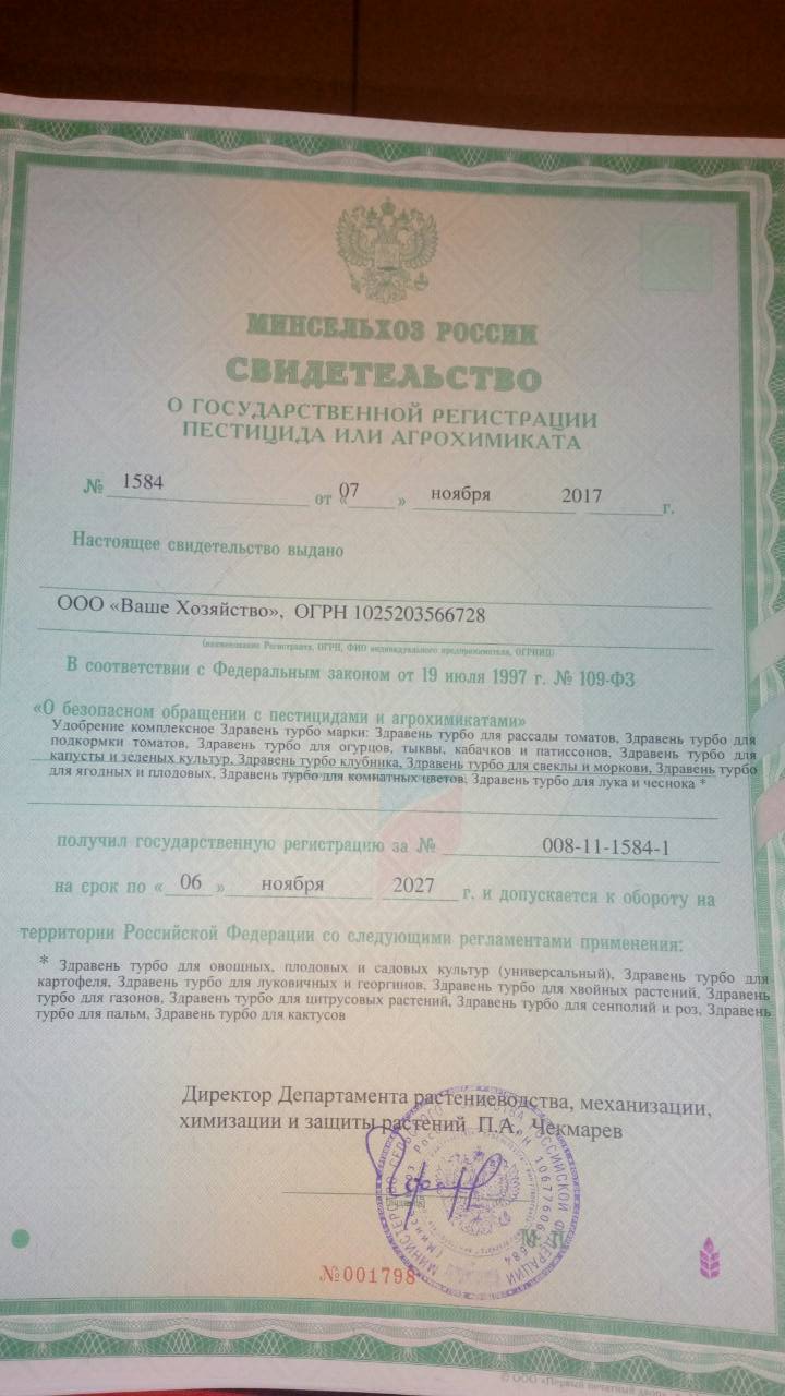 Государственная регистрация-№08-11-1584-1 от 07.11.17 до 06.11.27 выдана МСХ РФ, Сертификация-декларация №РОСС RU Д-RU.РА01.В.44645/23 от 08.11.23 до 07.11.26 выдана Заявитель: ООО "Ваше хозяйство"