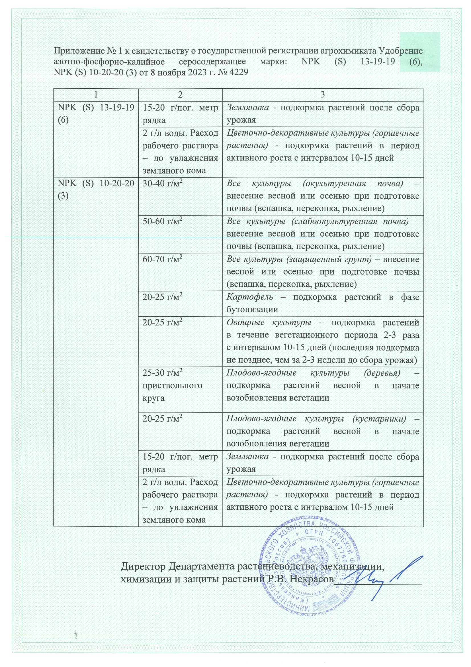 Сложные удобрения (NPK-удобрения) выпускаются из высококачественного сырья, не содержат балластных веществ и вредных примесей, экологически безопасны, обладают хорошими физическими свойствами, полностью растворимы. Питательные вещества NPK хорошо усваиваются растениями. NPK содержит азот только в аммонийной форме, медленно вымывающийся из почвы, что позволяет использовать удобрение для осеннего внесения. Гранулированная форма обеспечивает равномерность внесения.