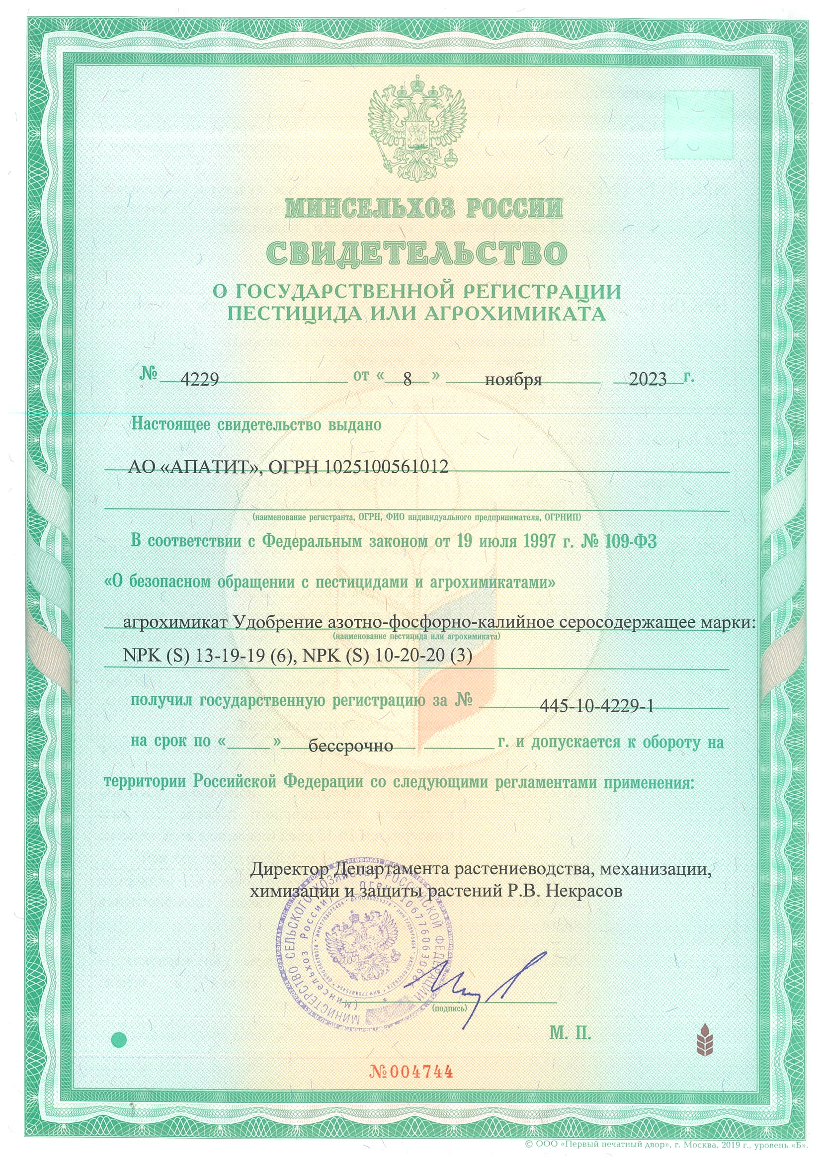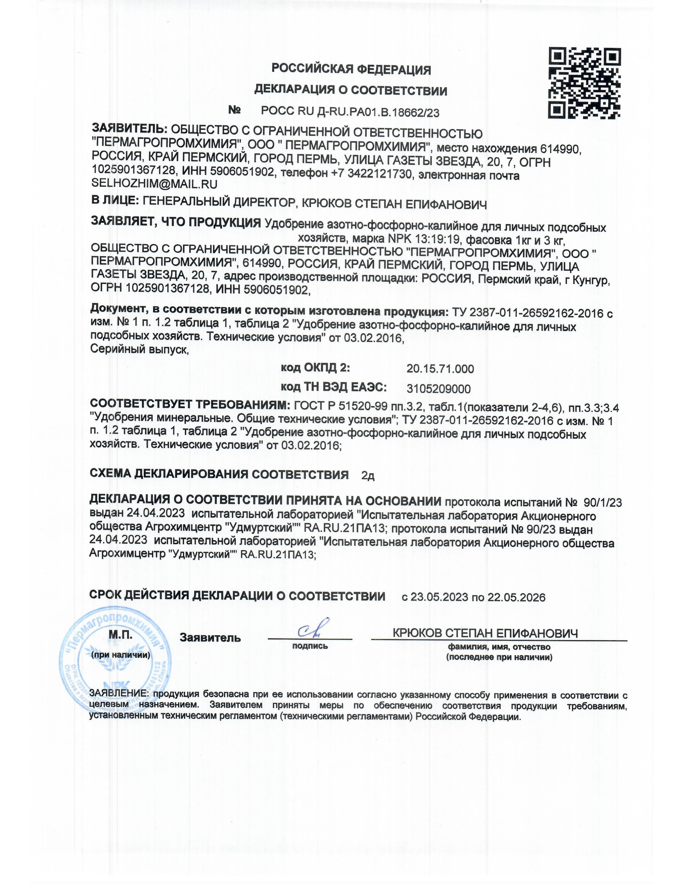 Азотно-фосфорно-калийное N 13% : P2O5 19% : K2O 19%