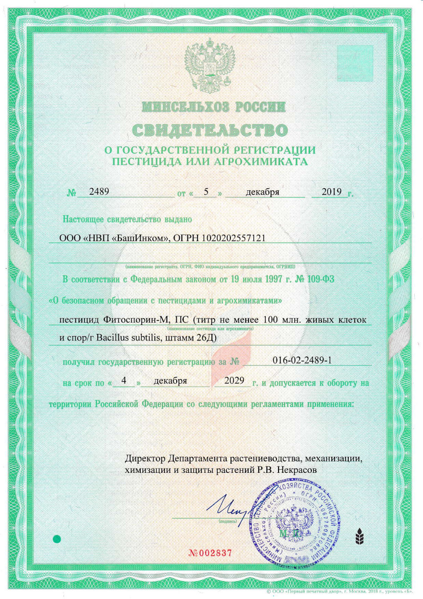 Механизм действия: Фитоспорин-М - это живая Бактериальная споровая культура Bacillus subtilis 26Д, титр живых спор и клеток не менее 2 млрд/г. которая подавляет продуктами своей жизнедеятельности размножение многих грибных и бактериальных болезней растений, обладает свойством повышения иммунитета и стимуляции роста у растений, что важно для повышения их продуктивности и уменьшения повторных заражений.