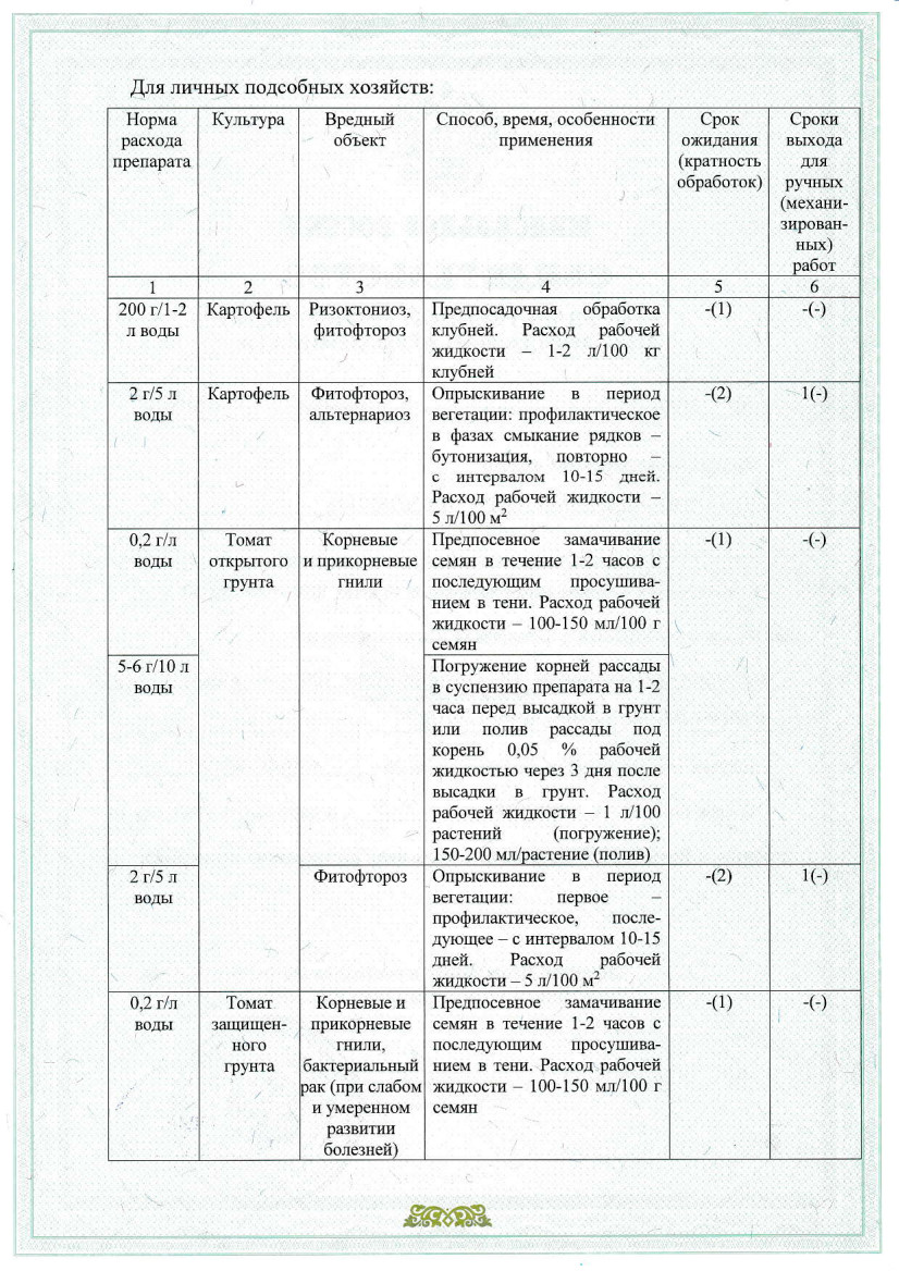 Пакет 30г – на 60м2 на сезон. Опрыскивание овощей, рассады – пакет на 60 л воды на 600 растений. Для замачивания семян овощных культур – 0,5 ч.л. на 1 л воды, предпосадочное опрыскивание клубней картофеля – 4 ч.л. на 1 л воды и на 30 кг клубней.