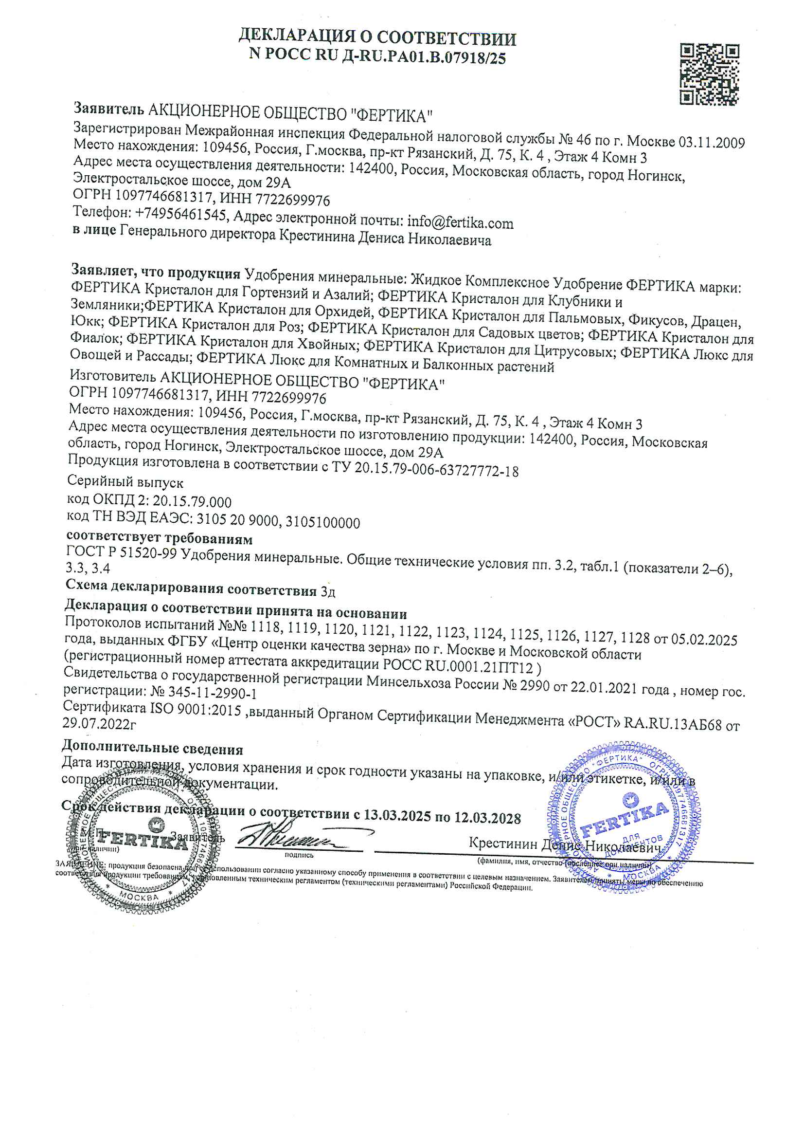 Содержит все необходимые для питания растений макро- и микроэлементы в оптимальном соотношении