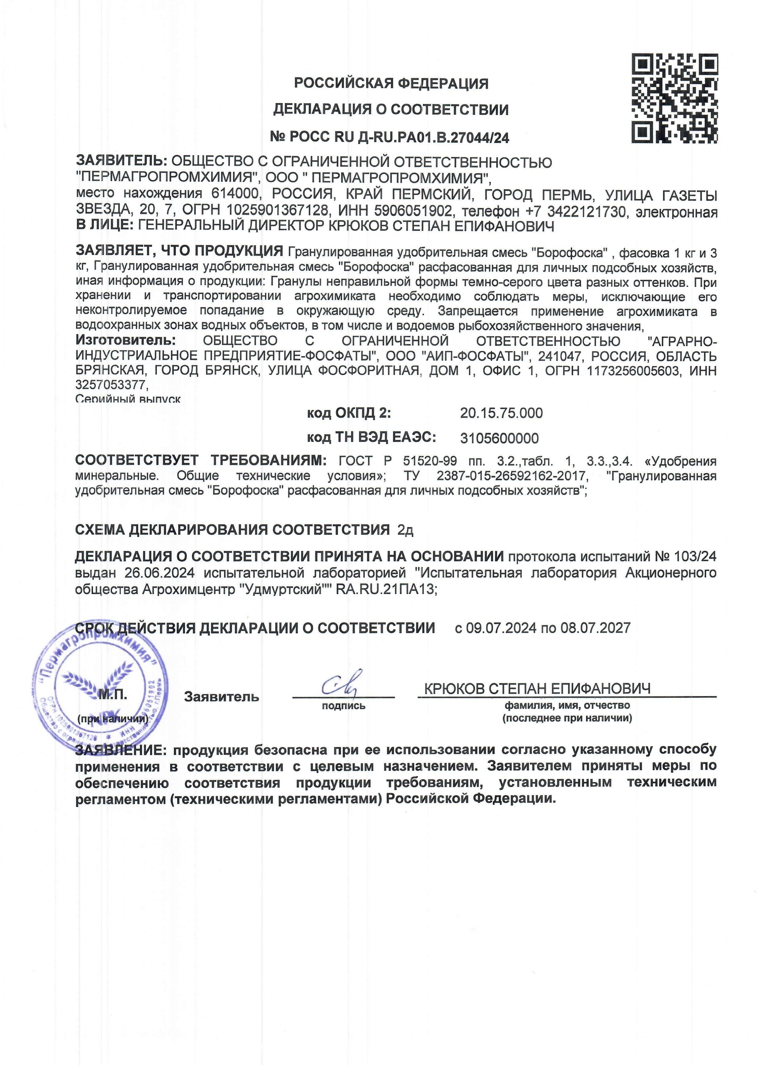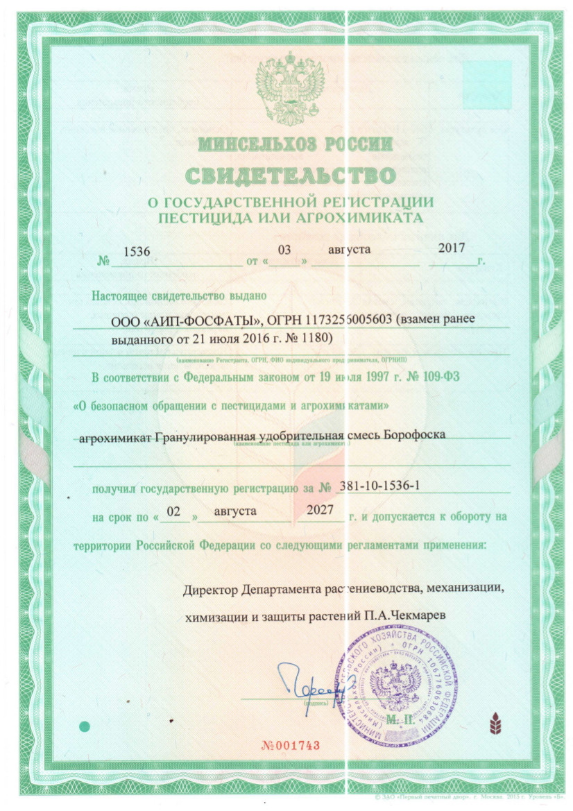 Государственная регистрация-№381-10-1536-1 от 03.08.17 до 02.08.27 выдана МСХ РФ, Сертификация-декларация №РОСС RU Д-RU.РА01.В.27044/24 от 09.07.24 до 08.07.27 выдана Заявитель: ООО "Пермагропромхимия"