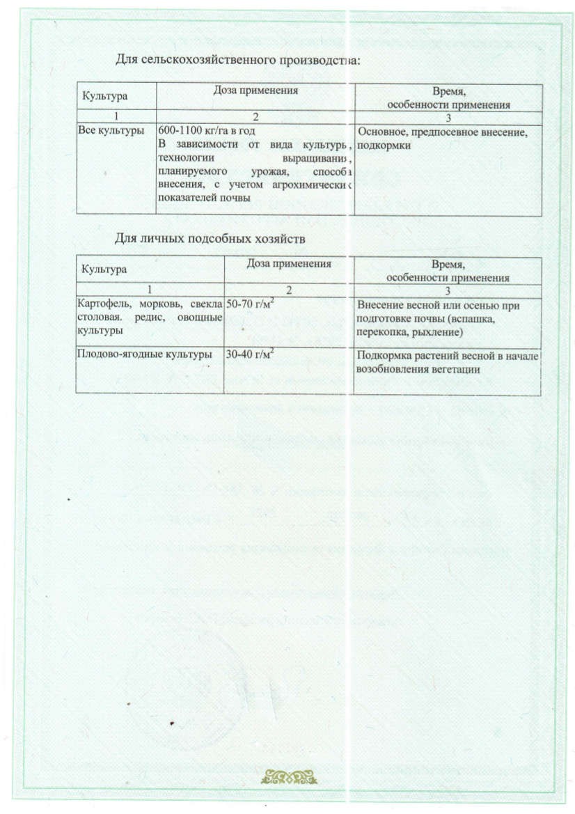 Удобрение содержит кремнезем в аморфном усваиваемом виде, который положительно влияет на физиологическую уравновешенность питательной среды, необходимой для растений, особенно эффективна борофоска в отношении корнеплодов.