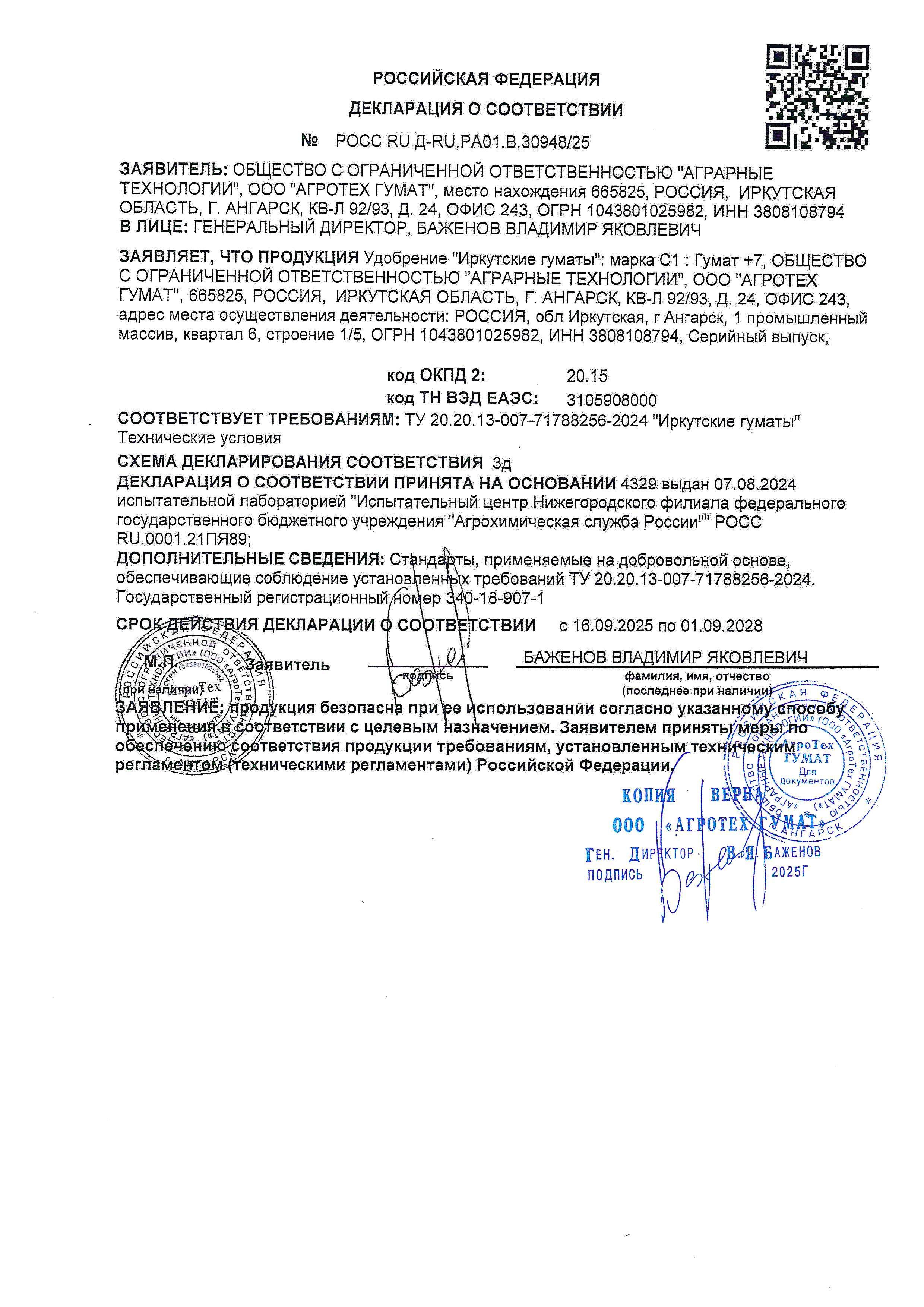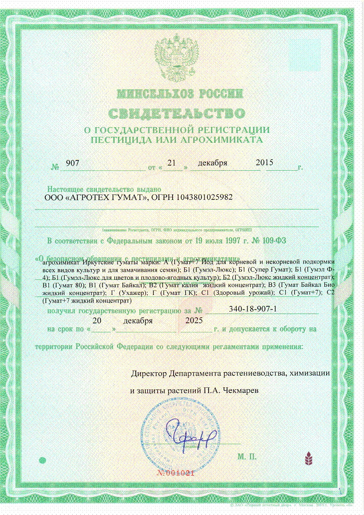 Гумат +7 содержит комплекс гуминовых и фульвовых кислот в доступной для растений форме, и хелатный комплекс питательных микроэлементов: K, S, B, Mo, Mn, Cu, Co, Zn, Fe, Ca, Mg, Si, C. Активизирует рост и обменные процессы у растений. Повышает устойчивость культур к неблагоприятным погодным и климатическим условиям.