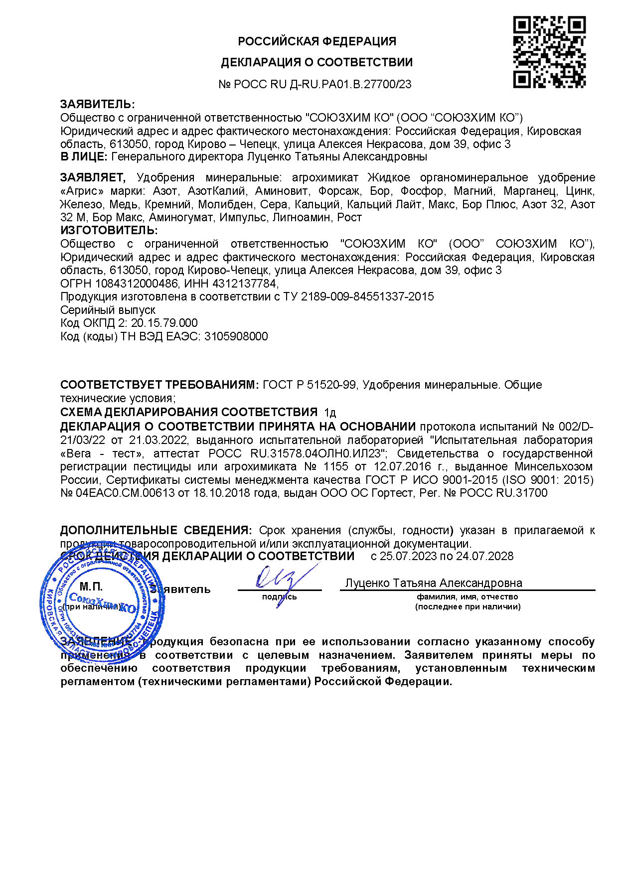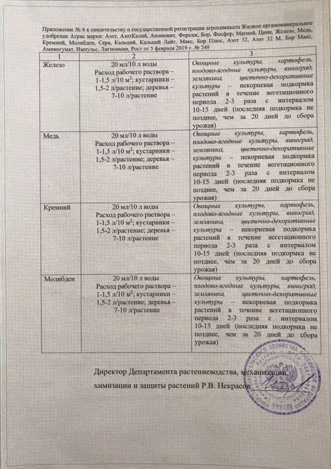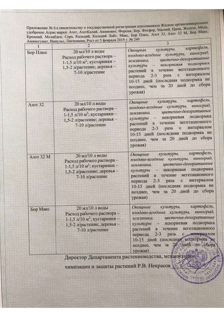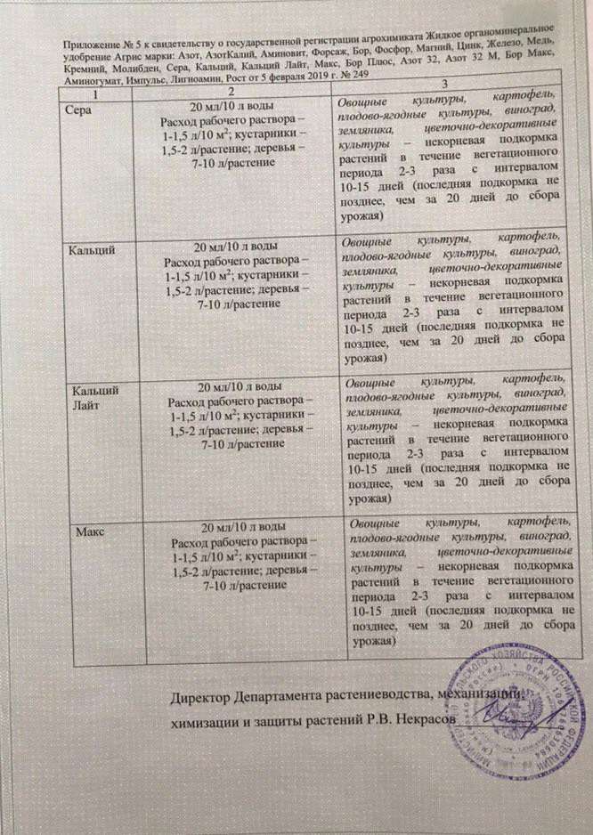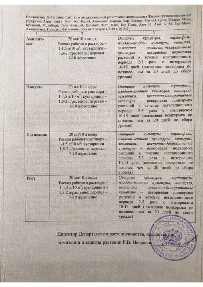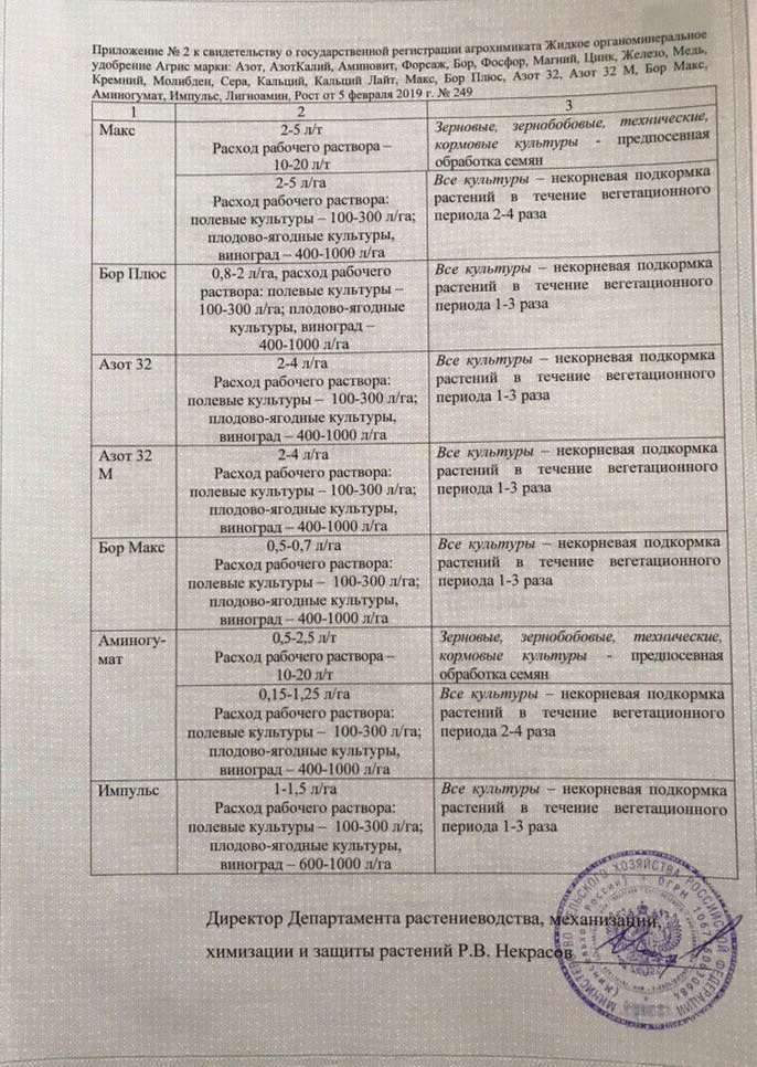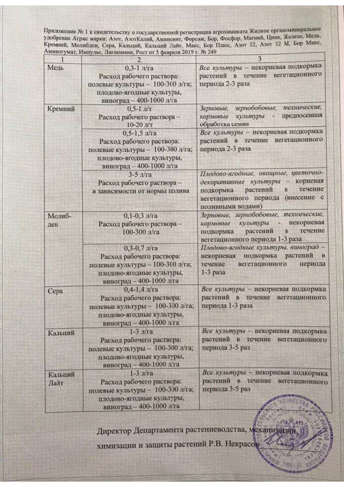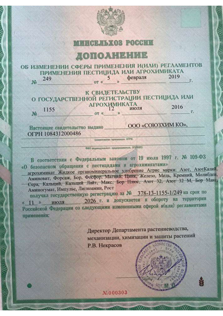 Государственная регистрация №378-13-1155-1/249 от 12.07.16 до 11.07.26 выдана МСХ РФ, Сертификация-декларация №РОСС RU Д-RU.РА01.В.27700/23 от 25.07.23 до 24.07.28 выдана Заявитель: ООО "СОЮЗХИМ КО"