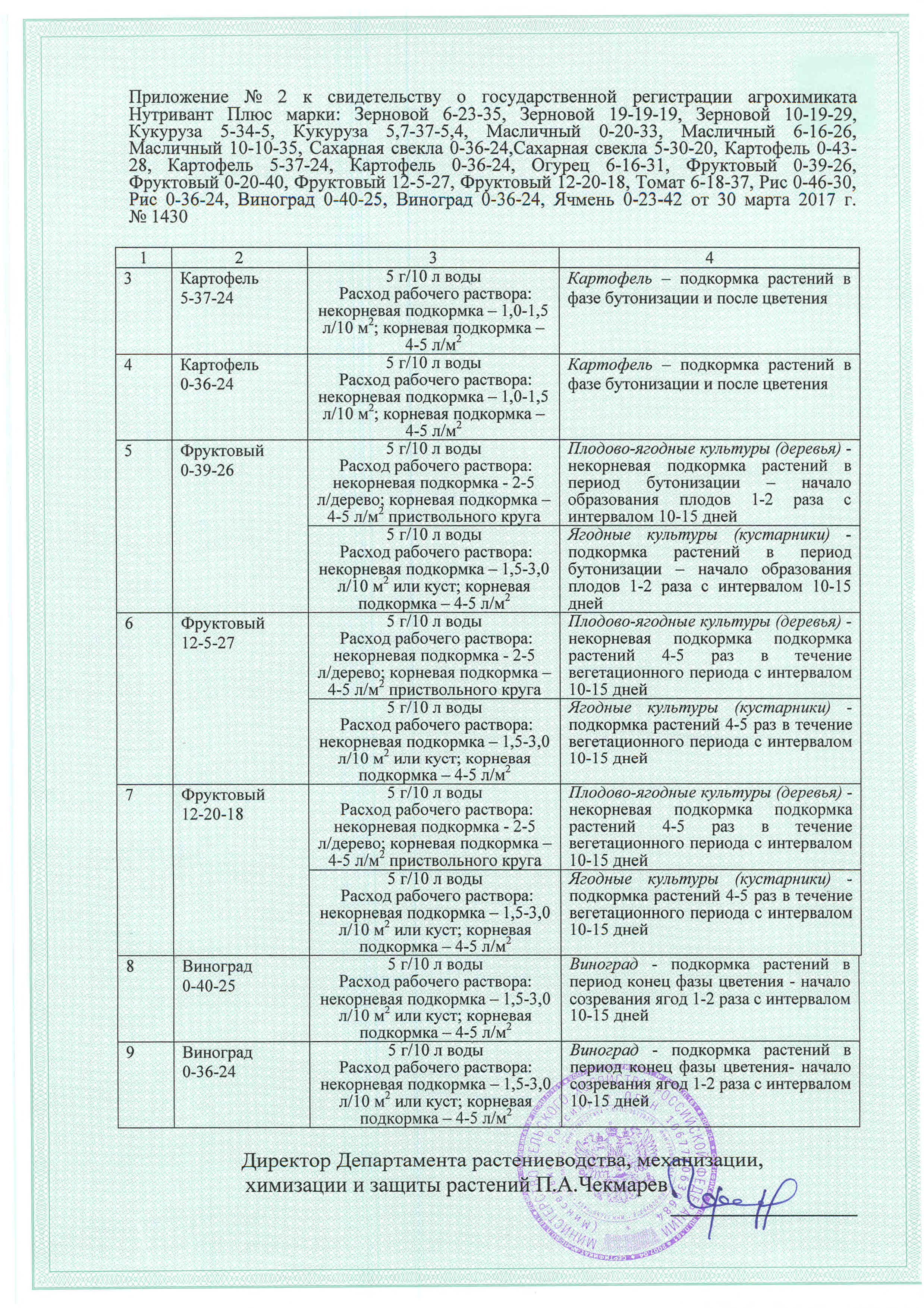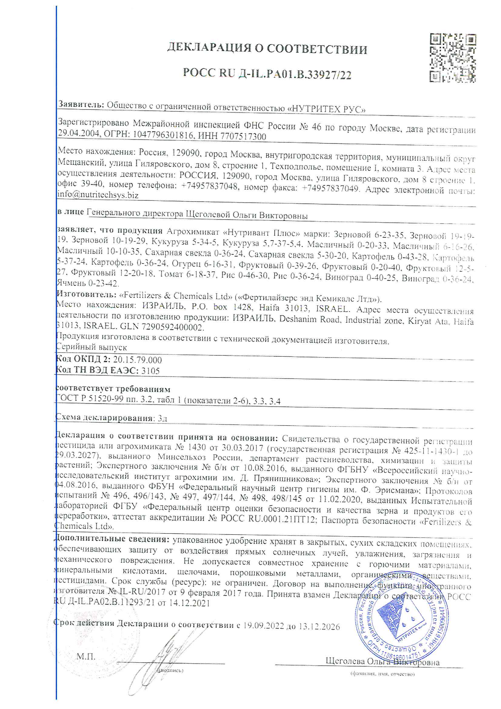 Государственная регистрация №425-11-1430-1 от 30.03.17 до 29.03.27 выдана МСХ РФ, Сертификация-декларация №РОСС RU Д-IL.РА01.В.33927/22 от 19.09.22 до 13.12.26 выдана Заявитель: ООО "Нутритех Рус"