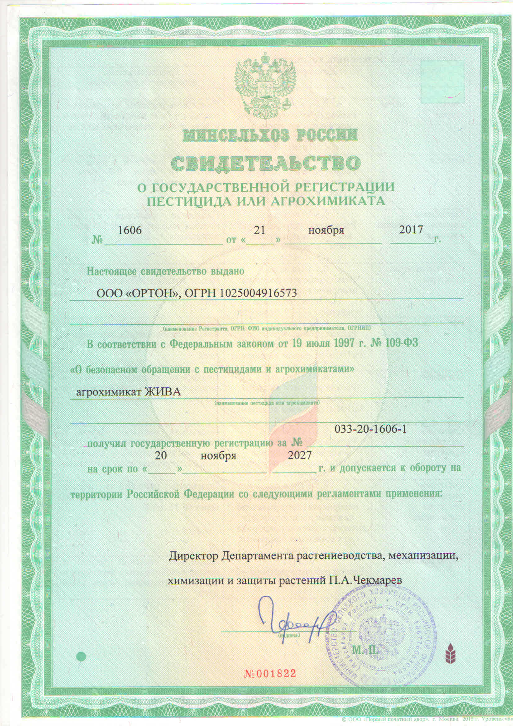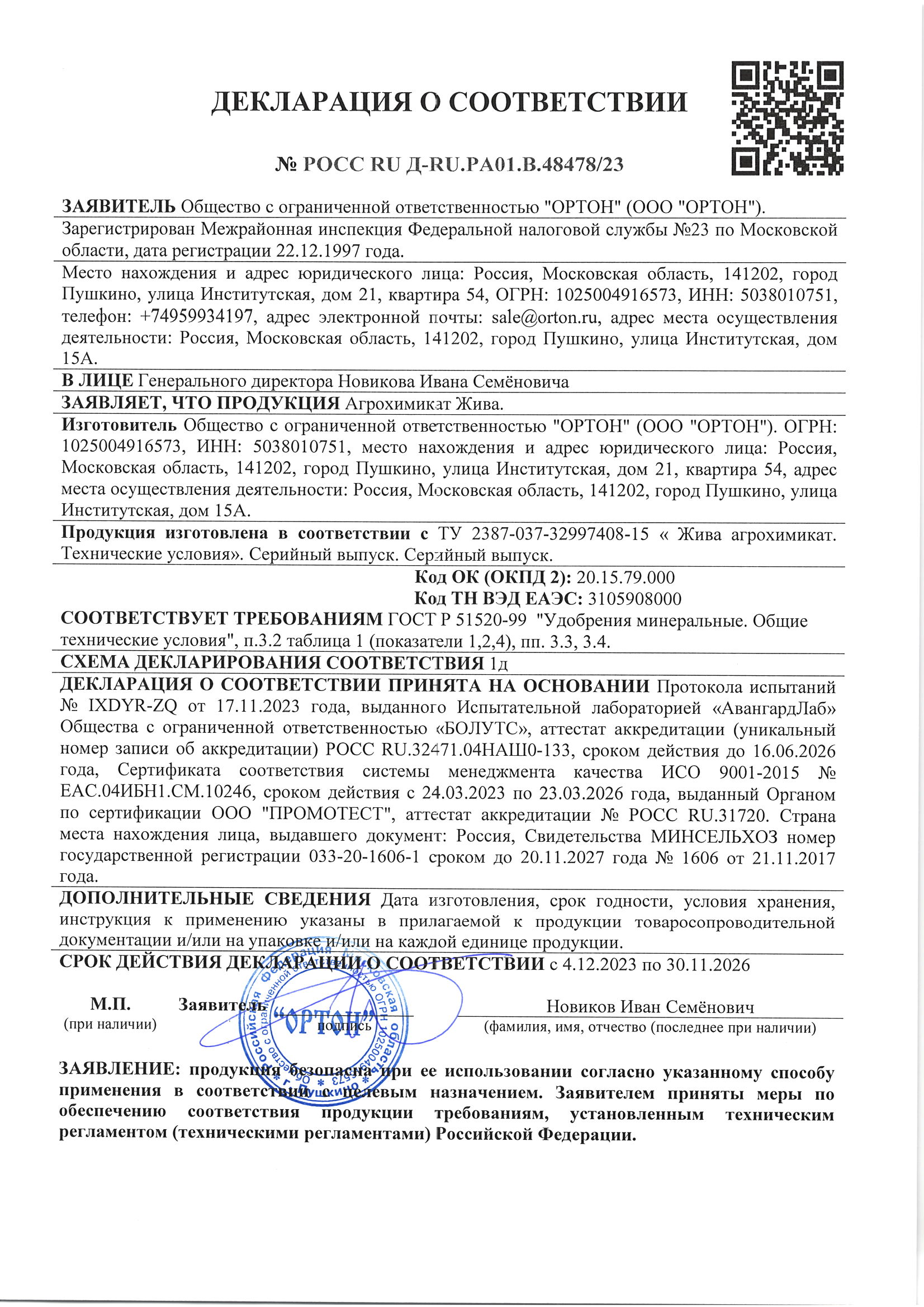 Государственная регистрация-№033-20-1606-1 от 21.07.17 до 20.07.27 выдана МСХ РФ, Сертификация-декларация №РОСС RU Д-RU.РА01.В.48478/23 от 04.12.23 до 30.11.26 выдана Заявитель: ООО "Ортон"
