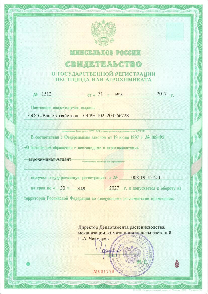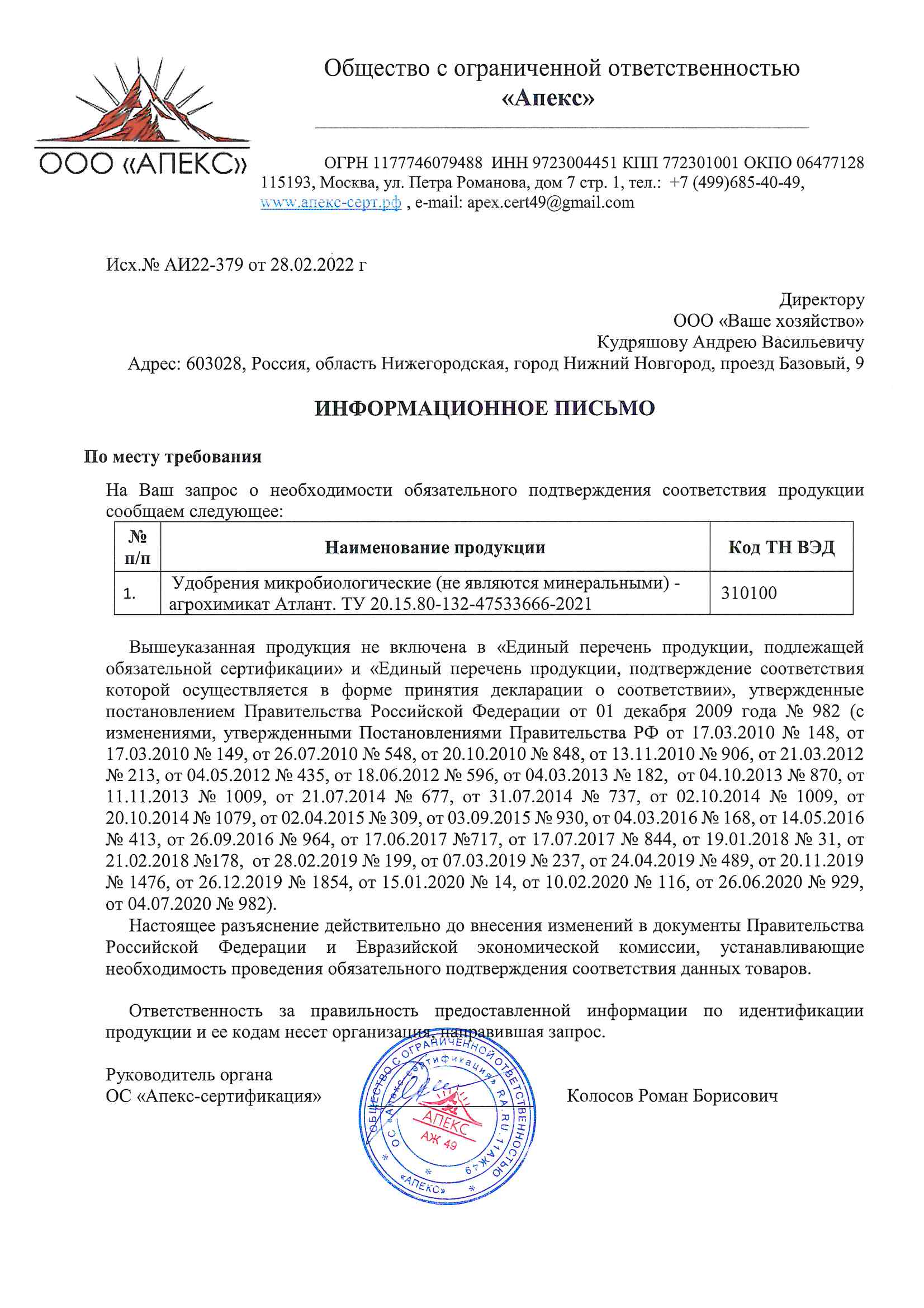 Государственная регистрация-№008-19-1512-1 от 31.05.2017 до 30.05.2027 выдана МСХ РФ, Сертификация-информационное письмо №АИ22-379 от 28.02.2022 выдано ООО "Апекс"