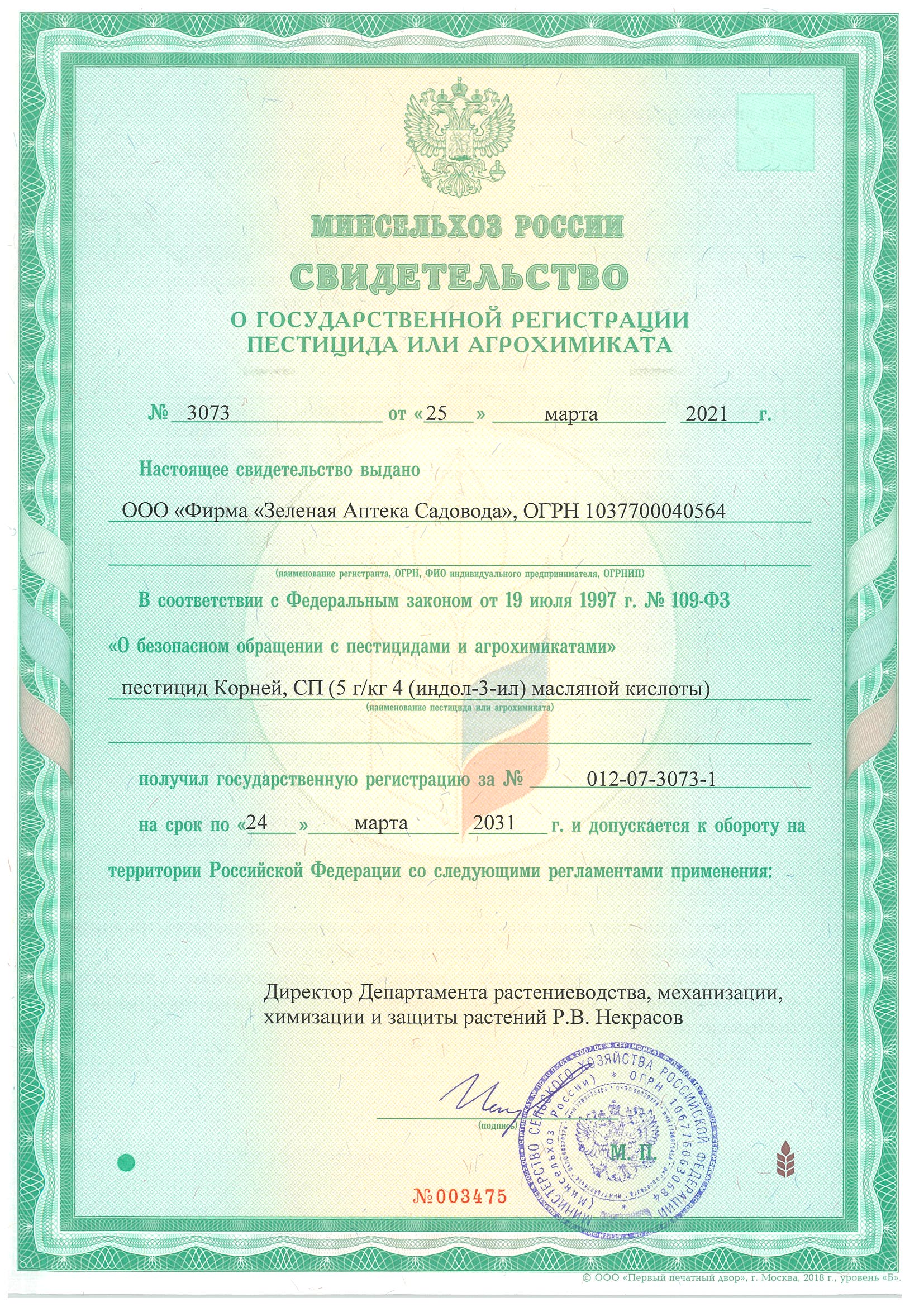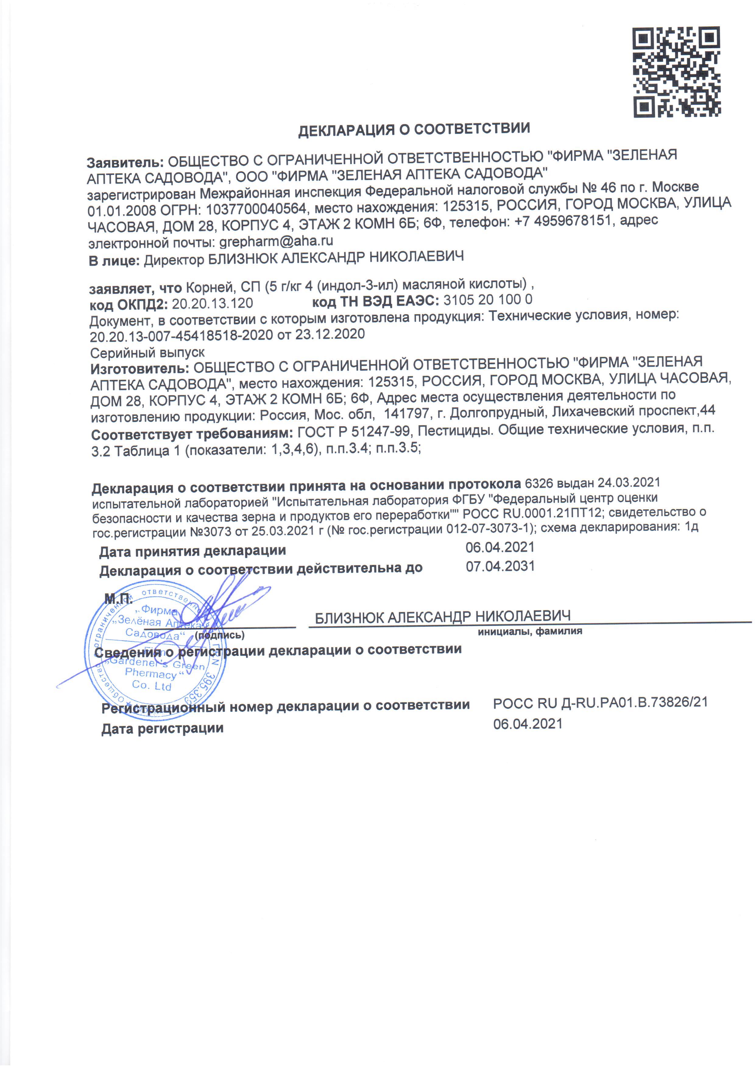Государственная регистрация №012-07-3073-1 от 25.03.21 до 24.03.31 выдана МСХ РФ, Сертификация-декларация №РОСС RU Д-RU,РА01.В.73826/21 от 06.04.21 до 07.04.31 выдана ООО "Фирма "Зеленая аптека садовода"