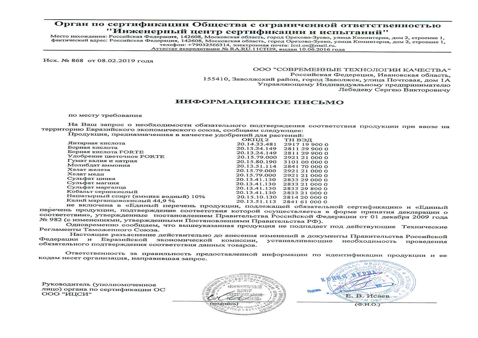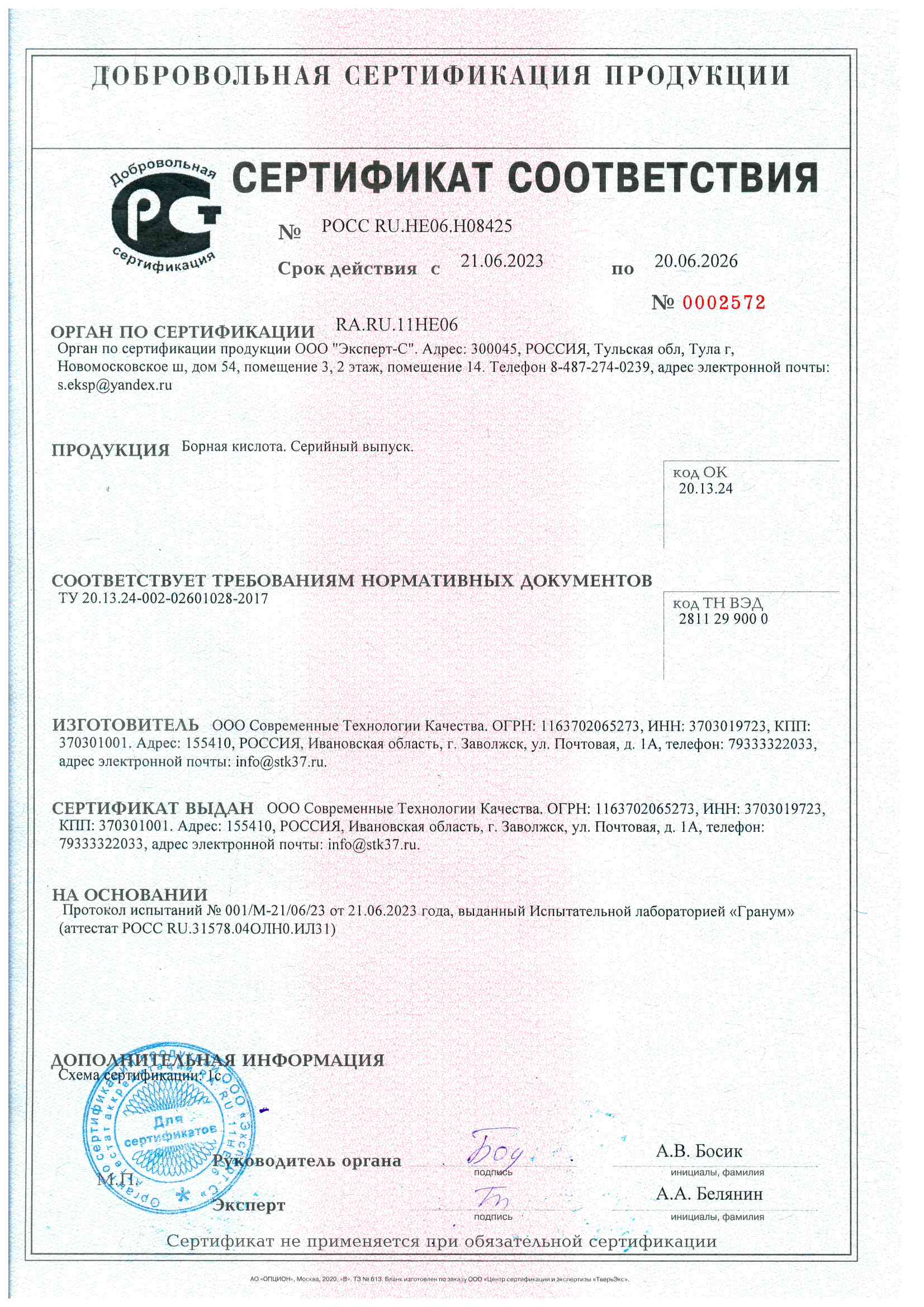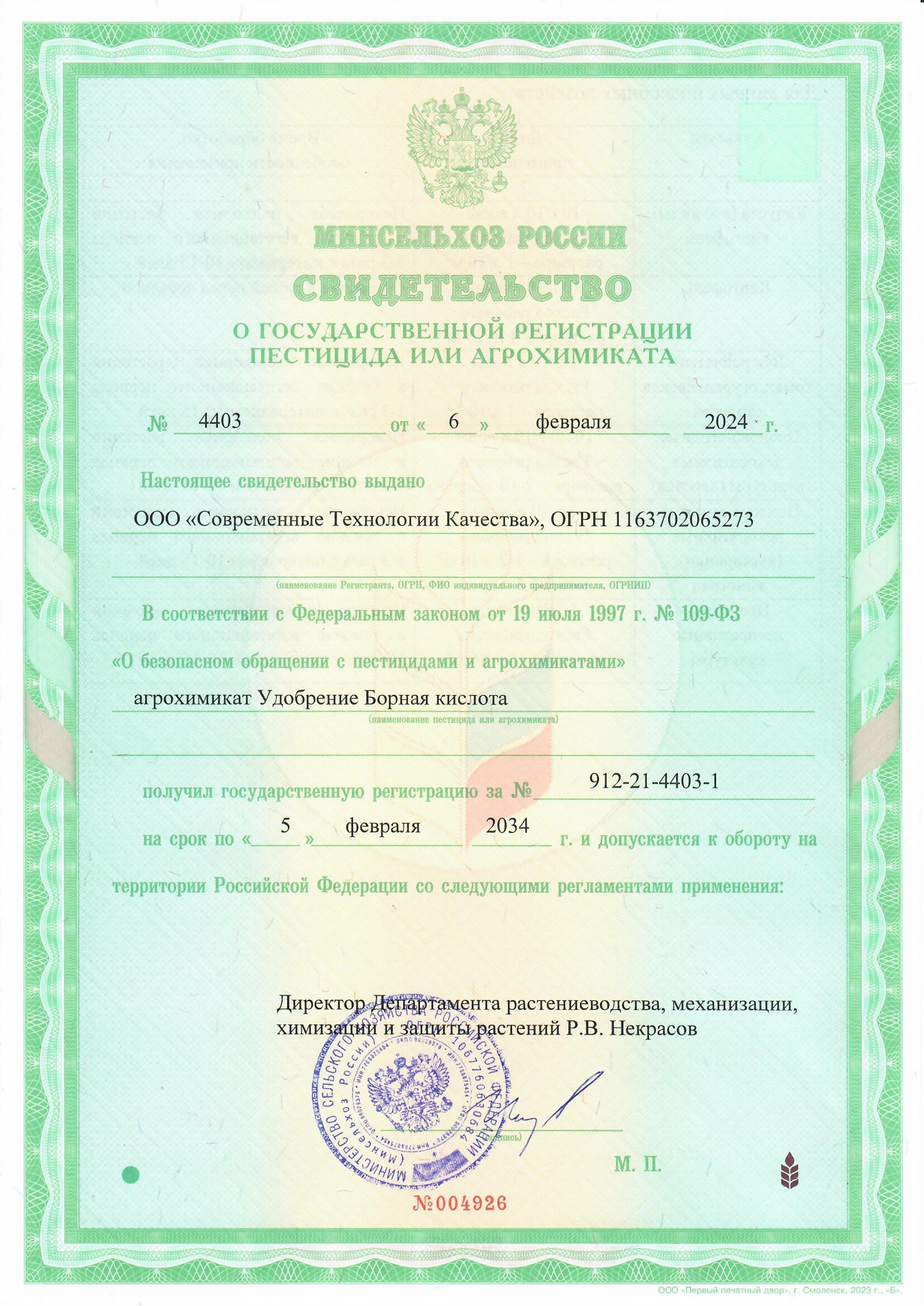 Государственная регистрация №912-21-4403-1 от 06.02.24 до 05.02.34 выдана МСХ РФ, Сертификат №РОСС RU.НЕ06.Н08425 от 21.06.23 до 20.06.26 выдан ОС продукции ООО "Эксперт-С"