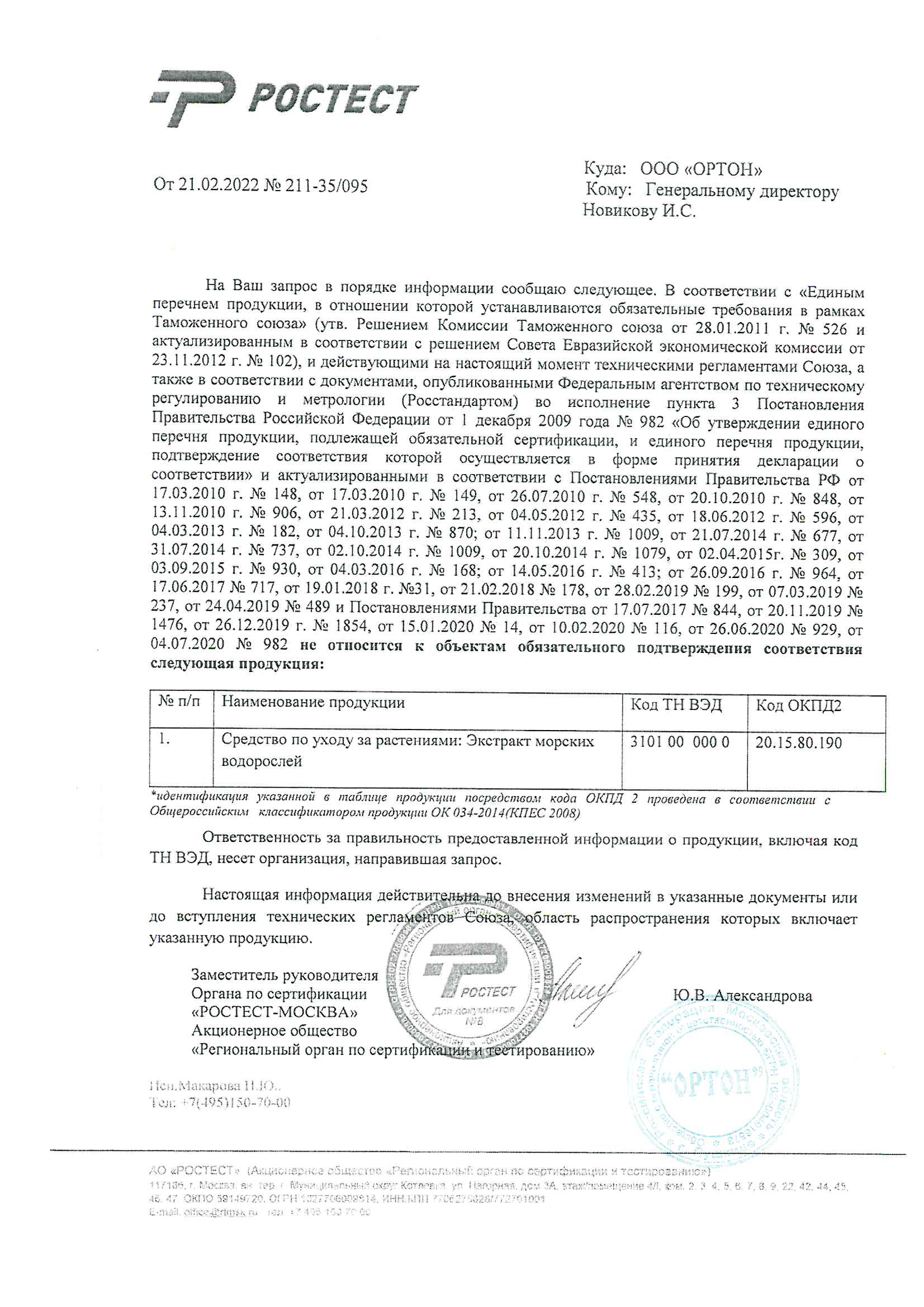 Сертификация-информационное письмо №211-35/095 от 21.02.2022 г. выдано ОС продукции Ростест.