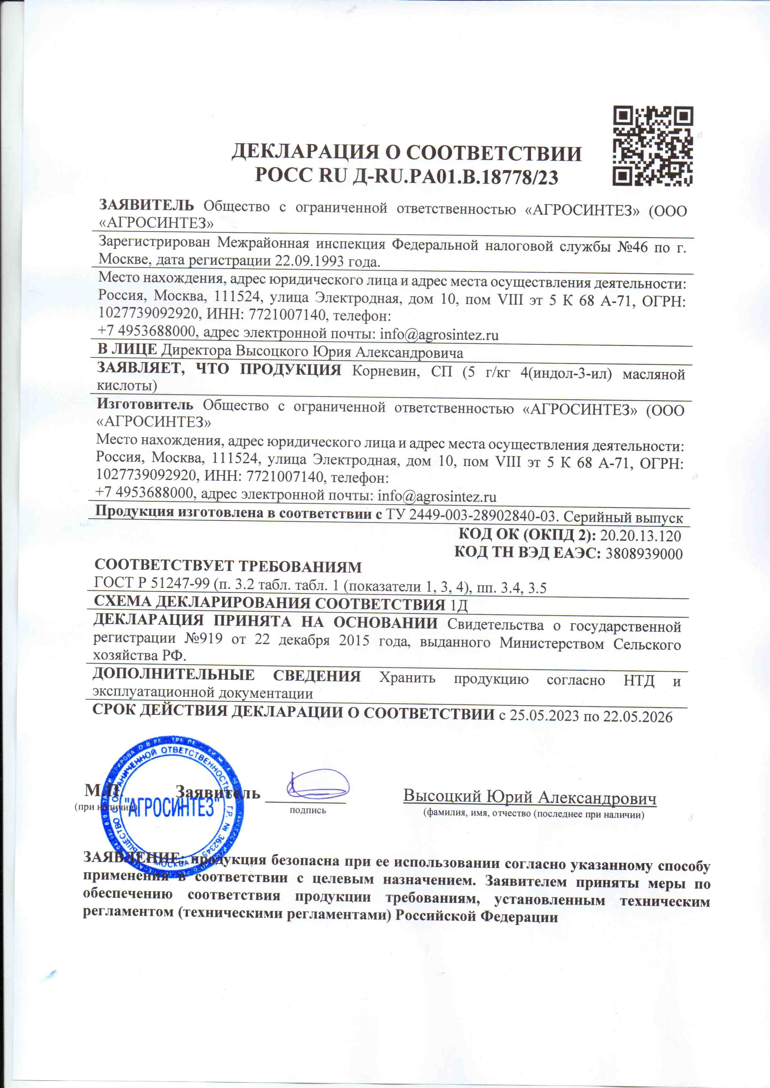 Государственная регистрация №427-07-919-1 от 22.12.15 до 21.12.25 выдана МСХ РФ, Сертификация-декларация №РОСС RU-Д-RU.РА01.В.29101/23 от 25.05.23 до 22.05.26 выдана: заявитель АО "Агросинтез"