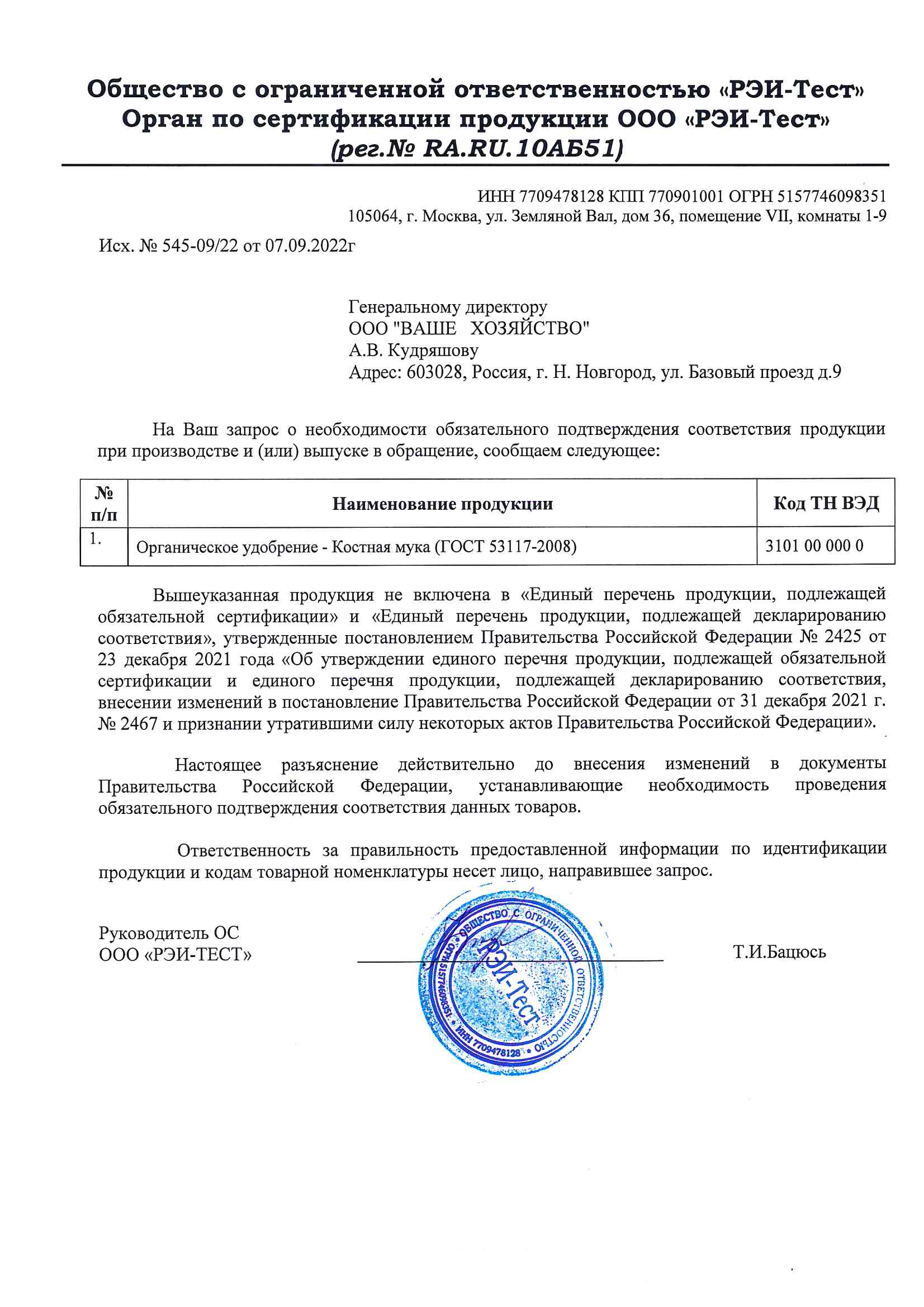 Сертификация-информационное письмо №545-09/22 от 07.09.22 выдано ОС продукции ООО "РЭИ-Тест"
